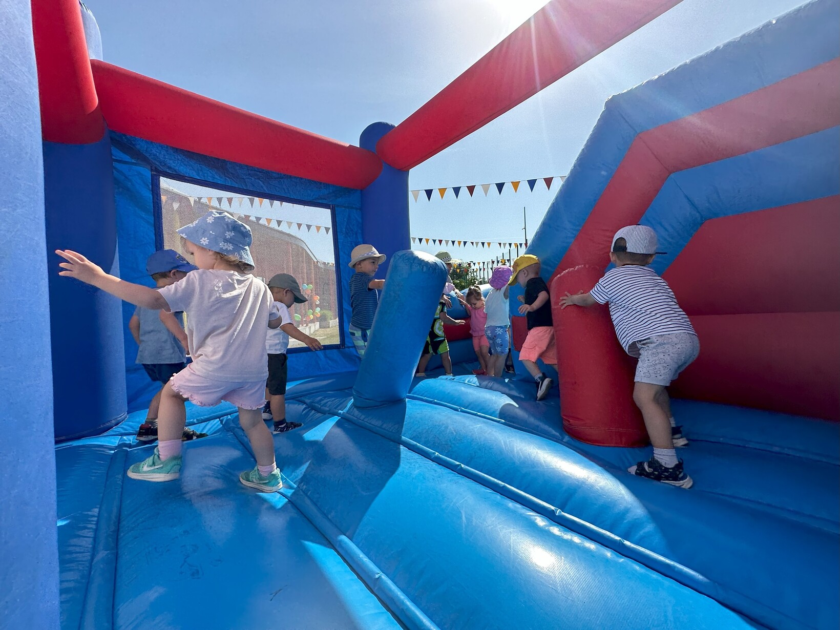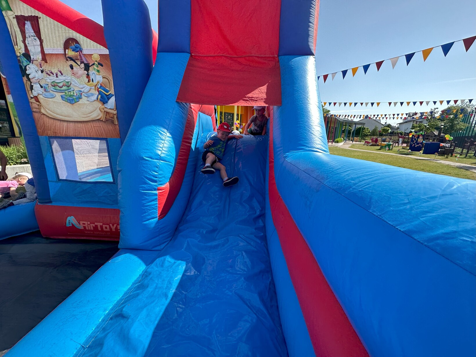Z okazji Dnia Dziecka w naszym żłobku było wiele atrakcji, takich jak: dmuchany plac zabaw, kolorowe bańki mydlane, czy malowanie twarzy. Gdy część dzieci „szalała” na dmuchańcach, to pozostałe świetnie bawiły się biorąc udział w zabawach na świeżym powietrzu. Było także słodkie „co nieco”, czyli pyszne owoce z bitą śmietaną. Zabawa była, jak zawsze udana i wesoła! Na koniec dnia każde dziecko otrzymało prezent.