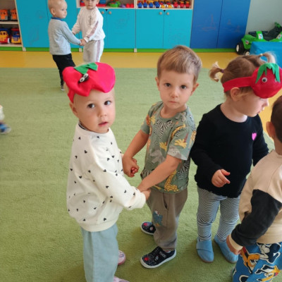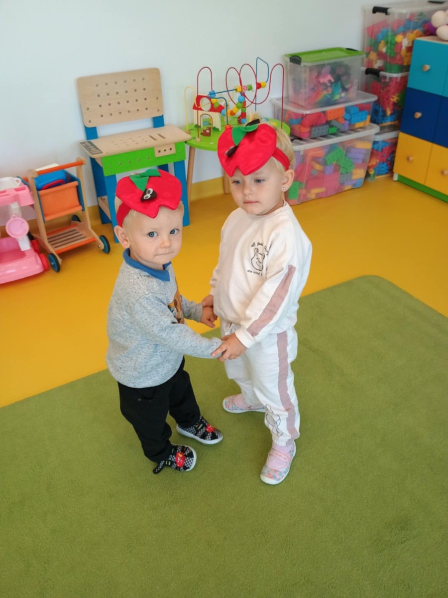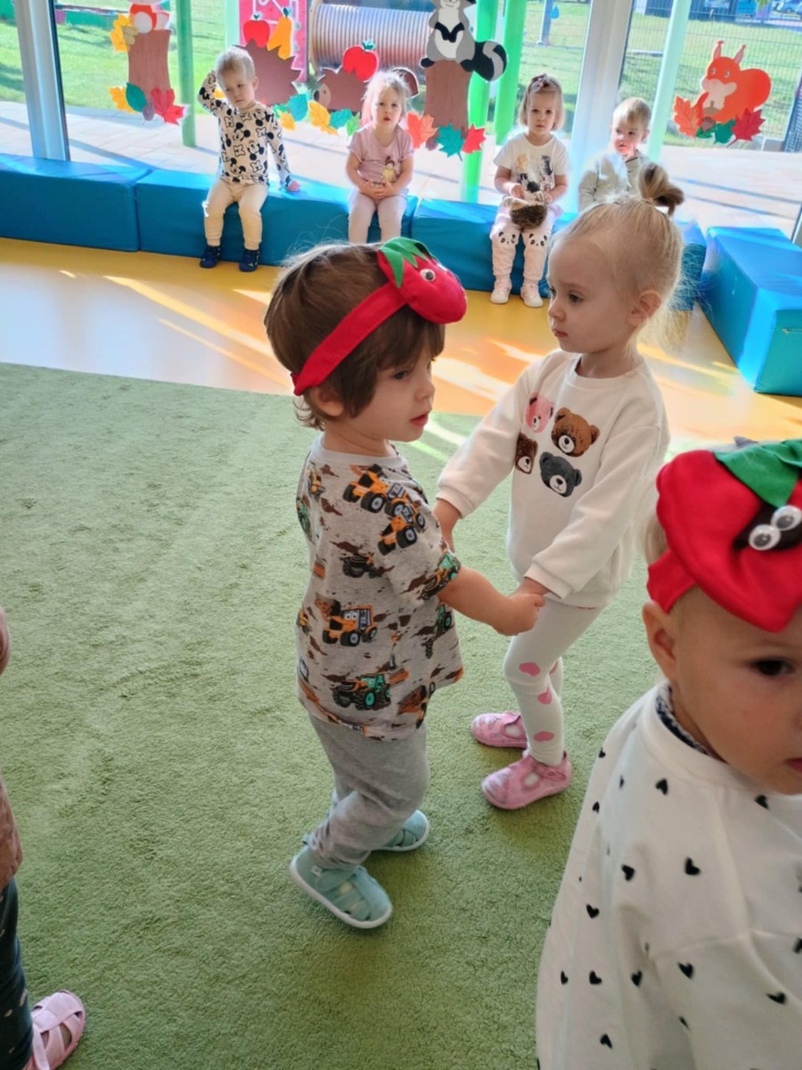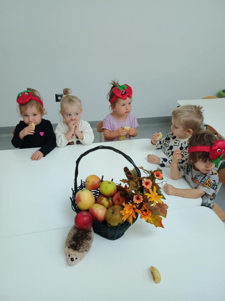 Dzieci poznały różne gatunki jabłek, ich kształt , zapach, kolor i smak . Wszystkie zabawy tego dnia dominowały pod znakiem jabłka, były tańce w parach do słów piosenki " Małe czerwone jabłuszko, tańczy dziś pod drzewem z gruszką ..."