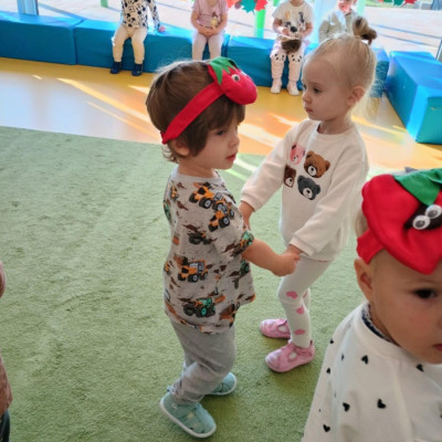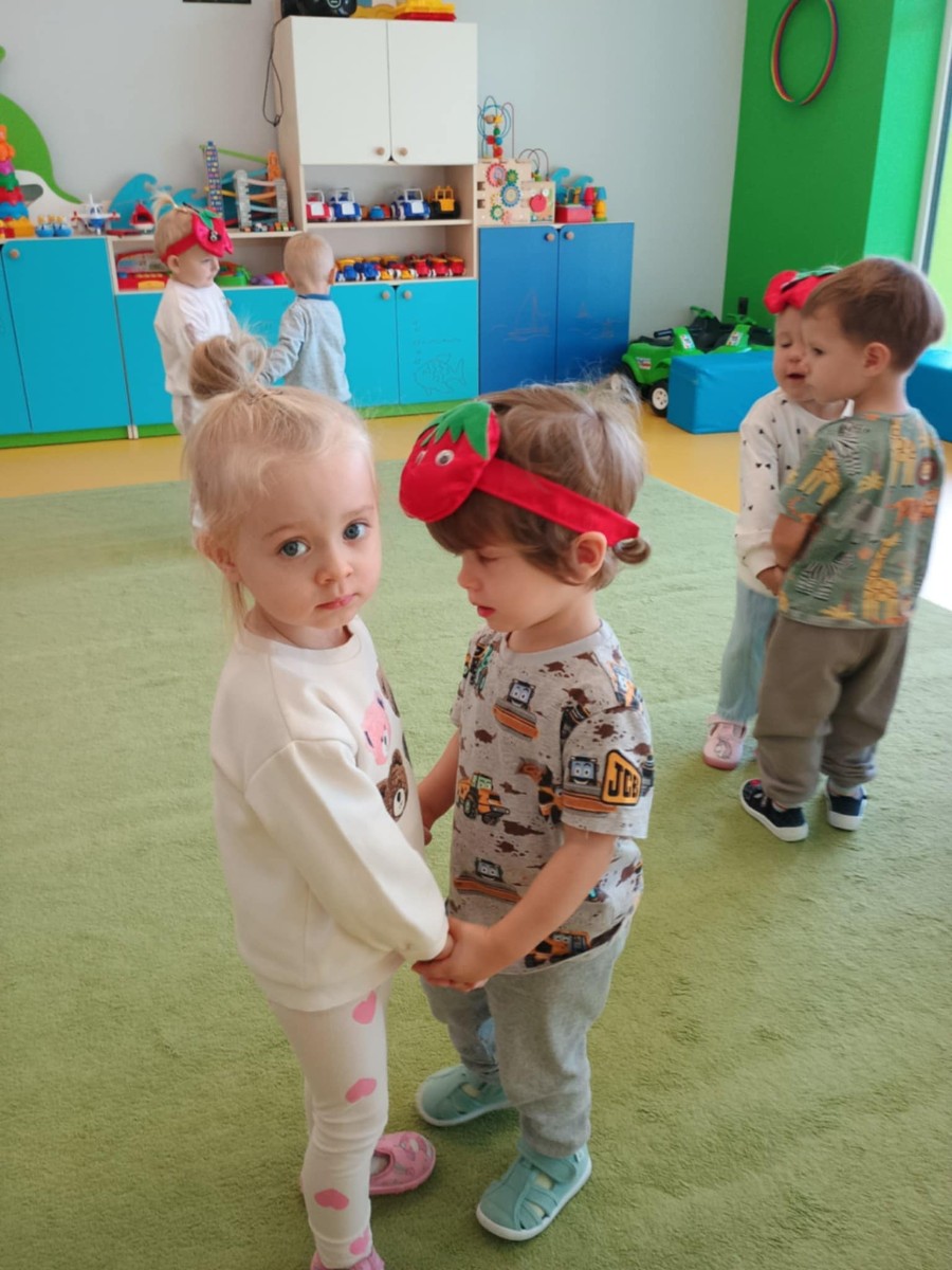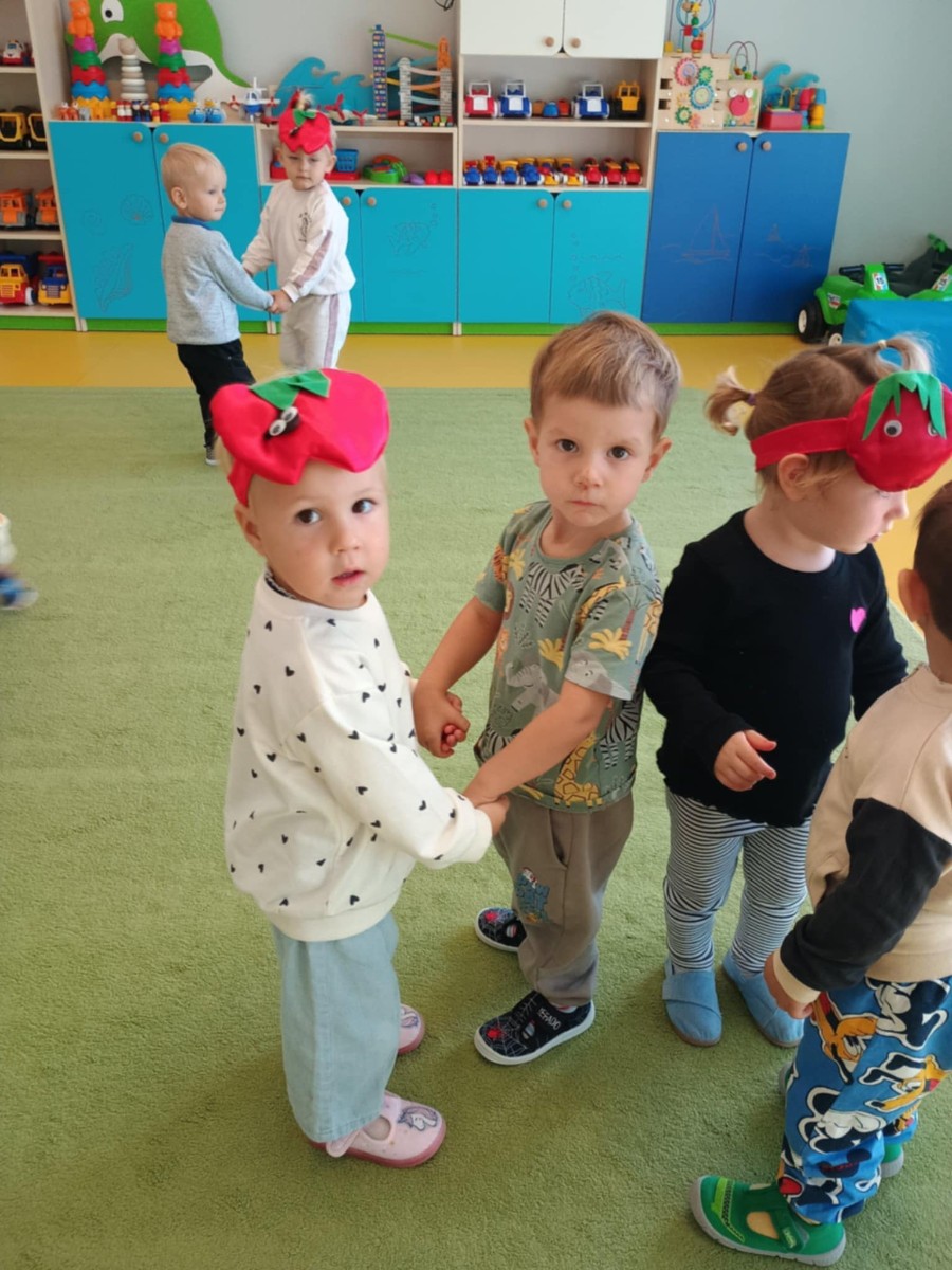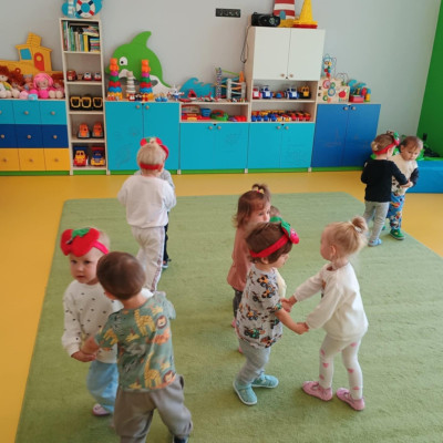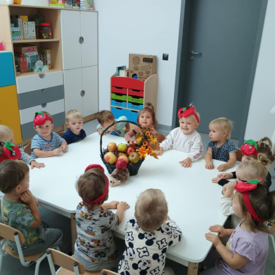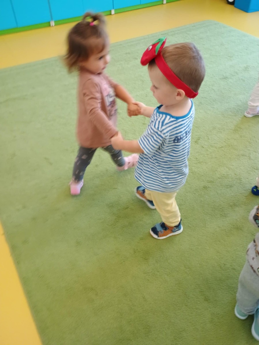 Dzieci poznały różne gatunki jabłek, ich kształt , zapach, kolor i smak . Wszystkie zabawy tego dnia dominowały pod znakiem jabłka, były tańce w parach do słów piosenki " Małe czerwone jabłuszko, tańczy dziś pod drzewem z gruszką ..."