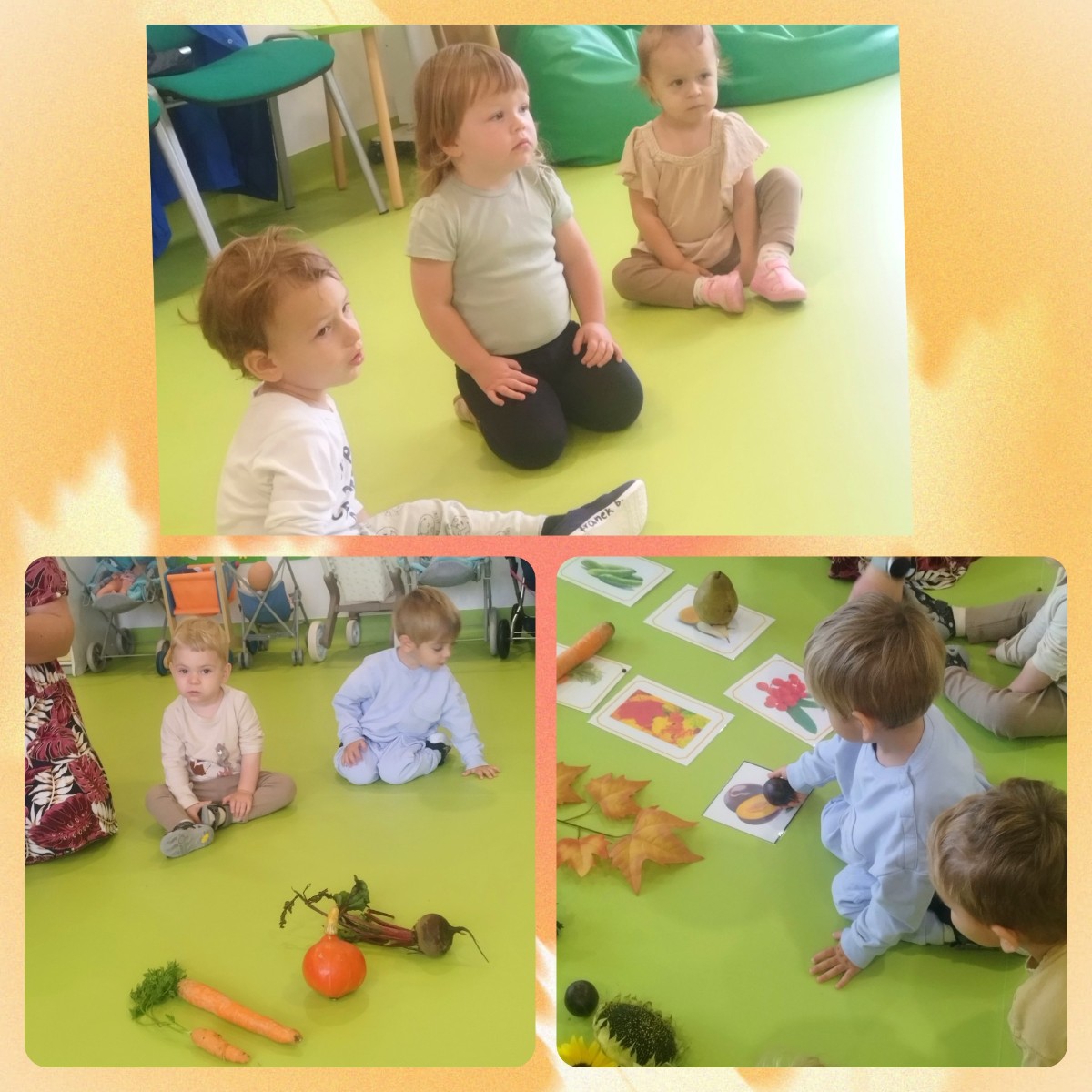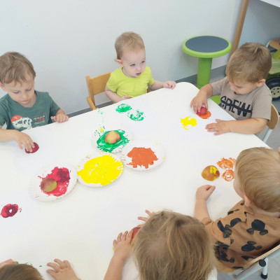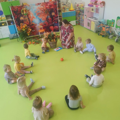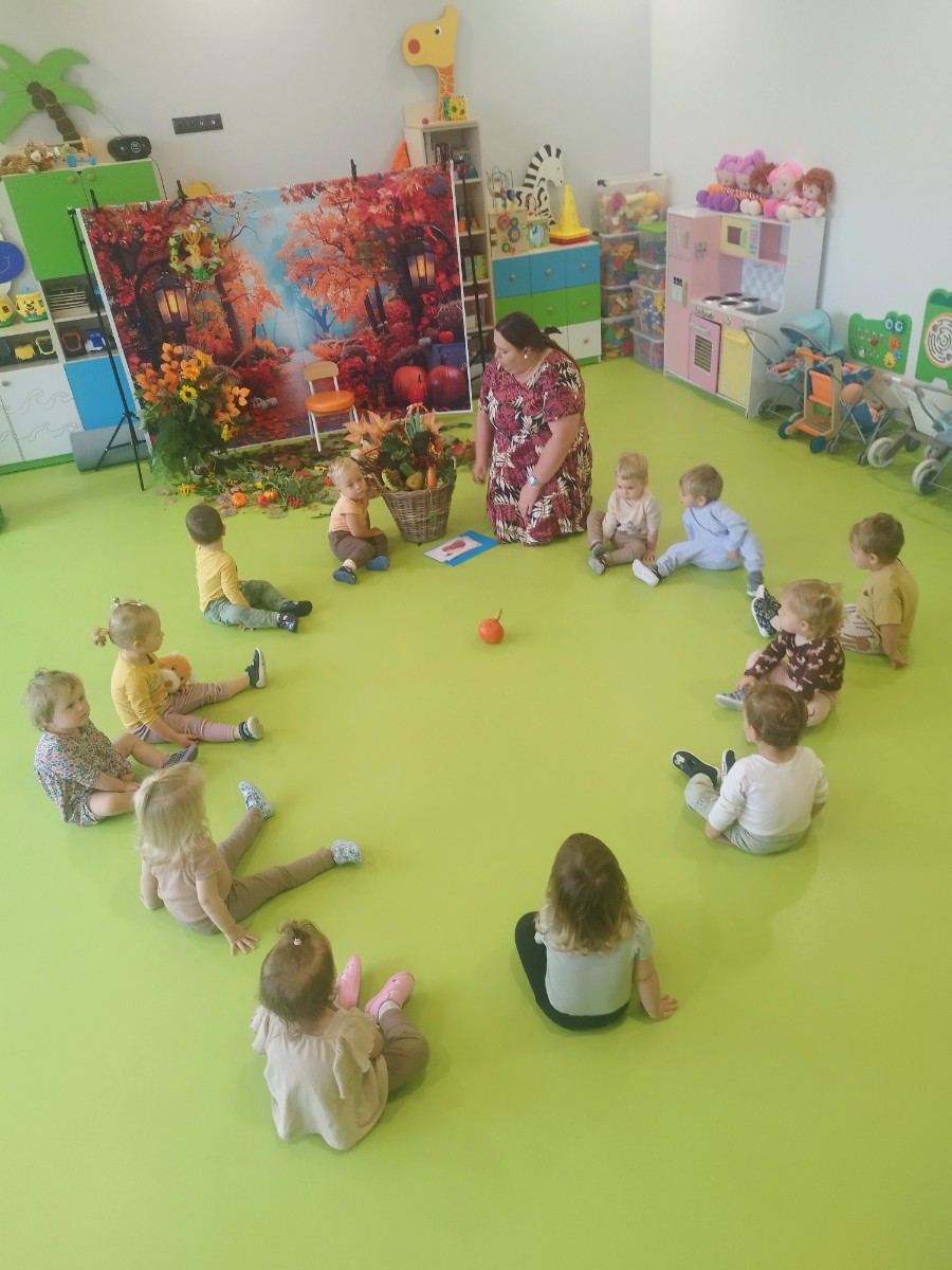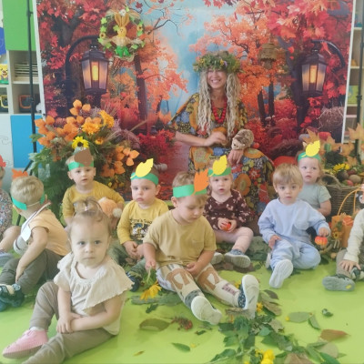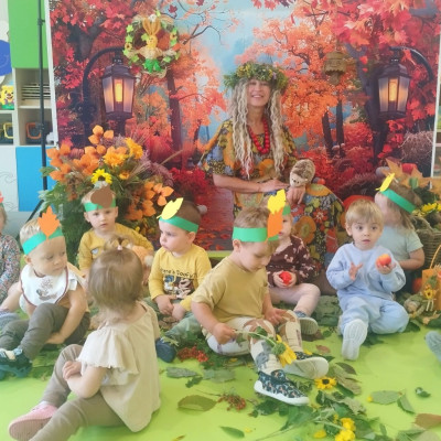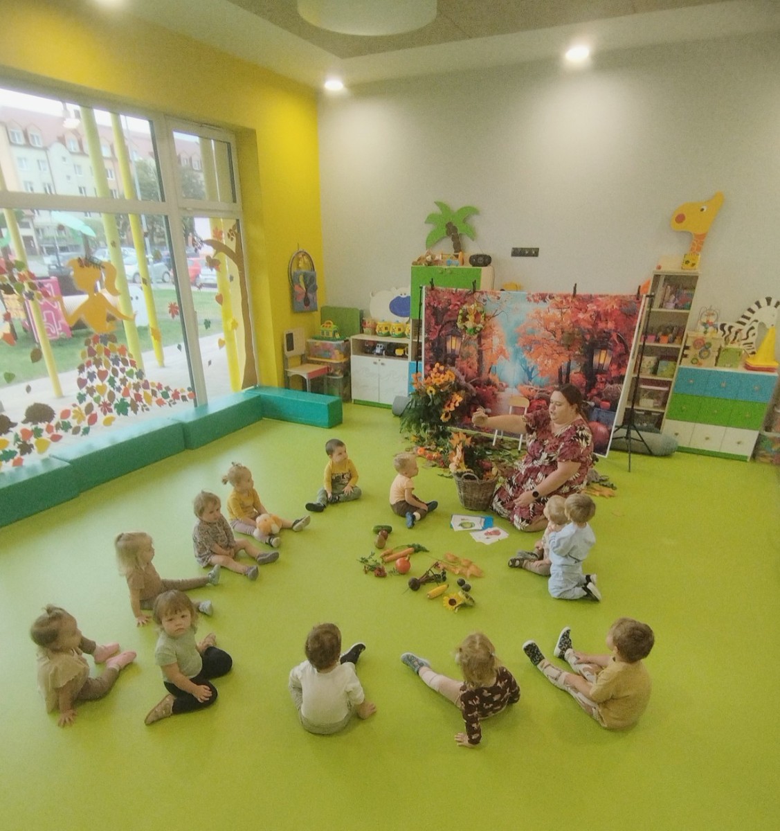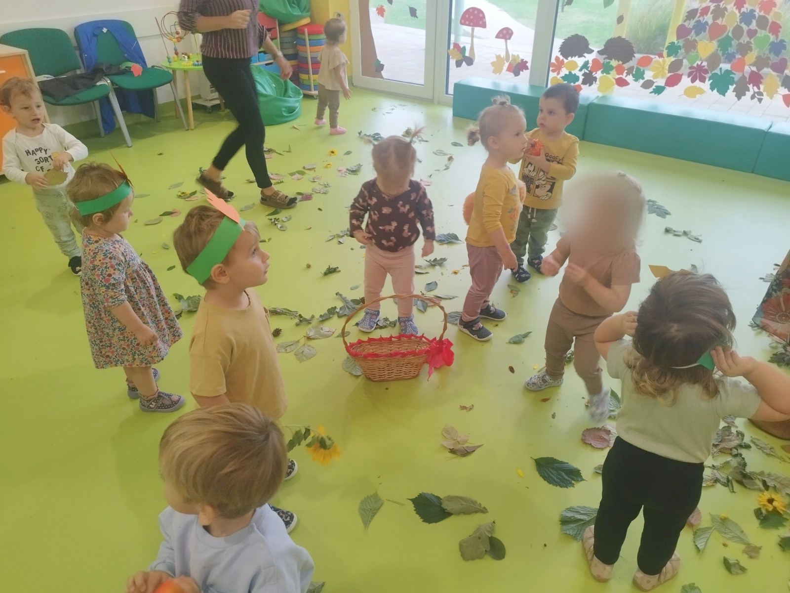 W naszym żłobku zapanował jesienny nastrój - świętowaliśmy pierwszy dzień kalendarzowej jesieni. Tej okazji naszą grupę Tygryski odwiedziła Pani Jesień! Zjawiła się z koszem pełnym wspaniałych darów. Dzieci poznawały skarby jakie przyniosła nam Jesień. Żłobkowicze z wielkim zainteresowaniem oglądały jesienne warzywa i owoce takie jak dynie, marchewki, jabłka, gruszki czy śliwki. Nie zabrakło też darów prosto z jesiennego lasu takich jak żołędzie, kasztany