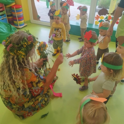 Zdjęcie przedstawia dzieci podczas zajęć z okazji święta Jesieni.