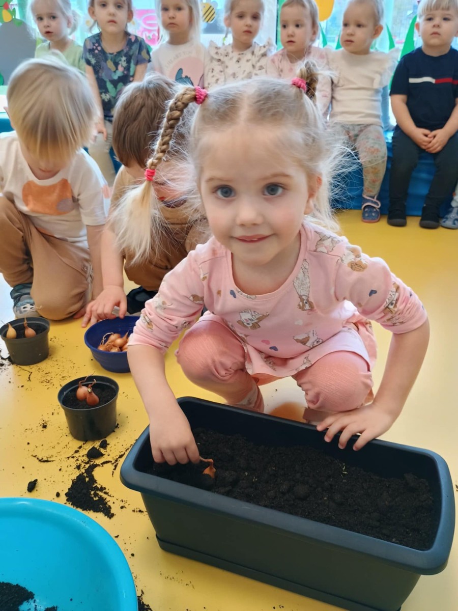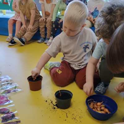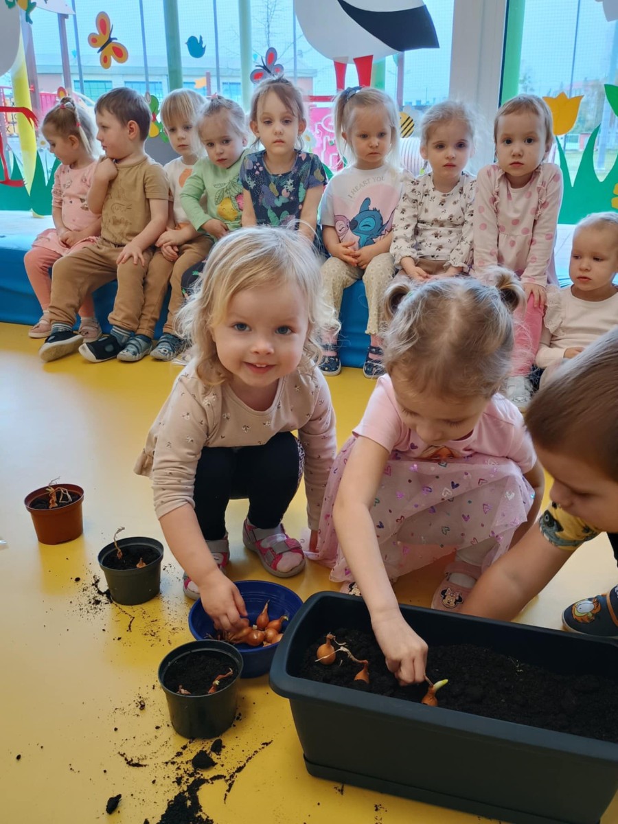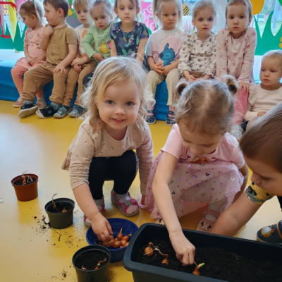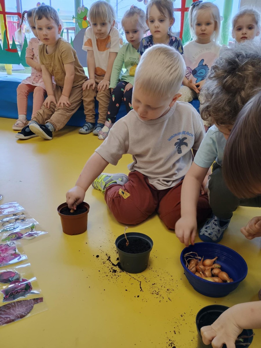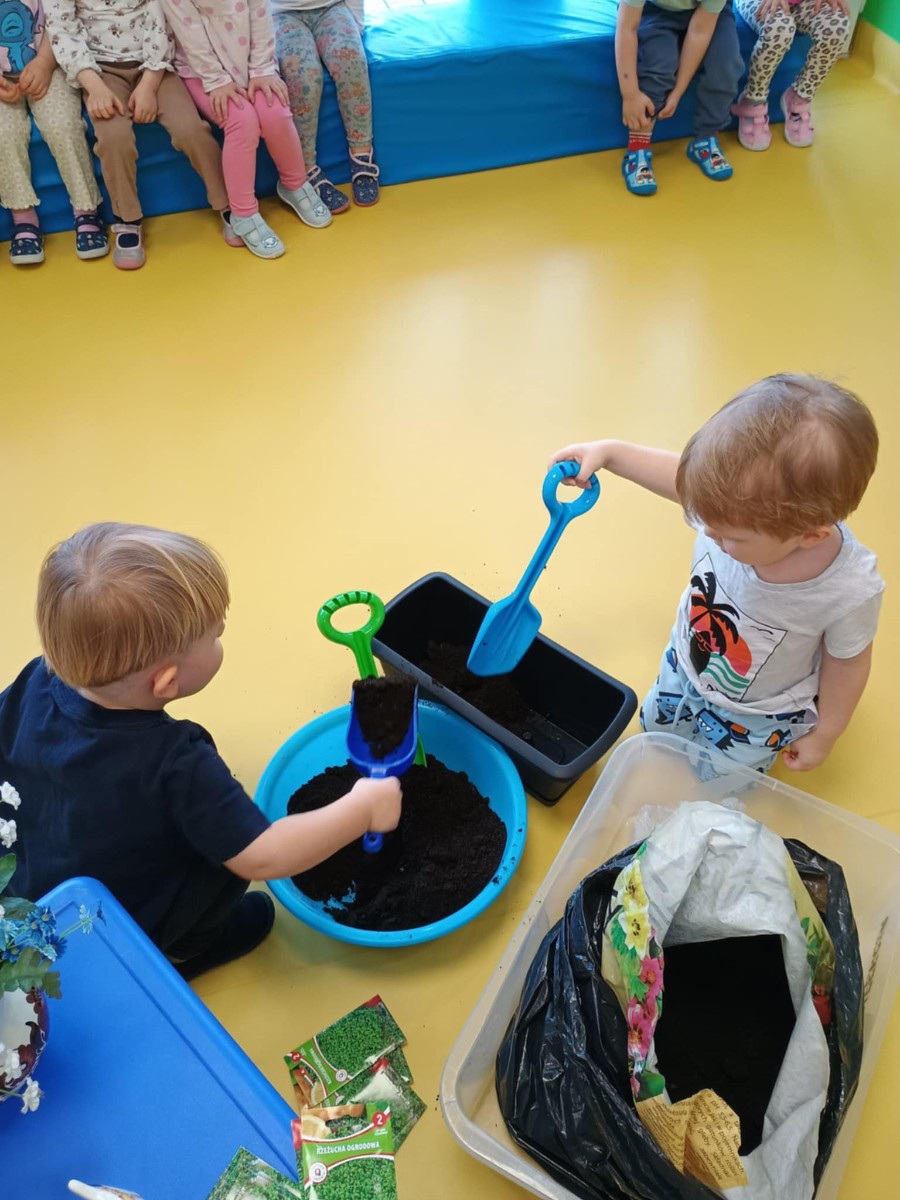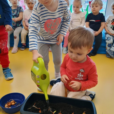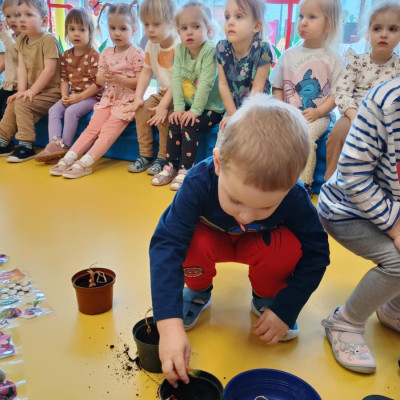 W dniu dzisiejszym w grupie Rybek odbyły się zajęcia pt.„Sadzimy kwiaty”, gdzie dzieci poszerzały wiadomości na temat wiosennych kwiatów i warunków niezbędnych do ich rozwoju. Dzieci miały okazję zabawić się w ogrodników i dowiedzieć się do czego służą odpowiednie sprzęty m.in. doniczka, ziemia, łopatka, sadzonki, rękawiczki, konewka.