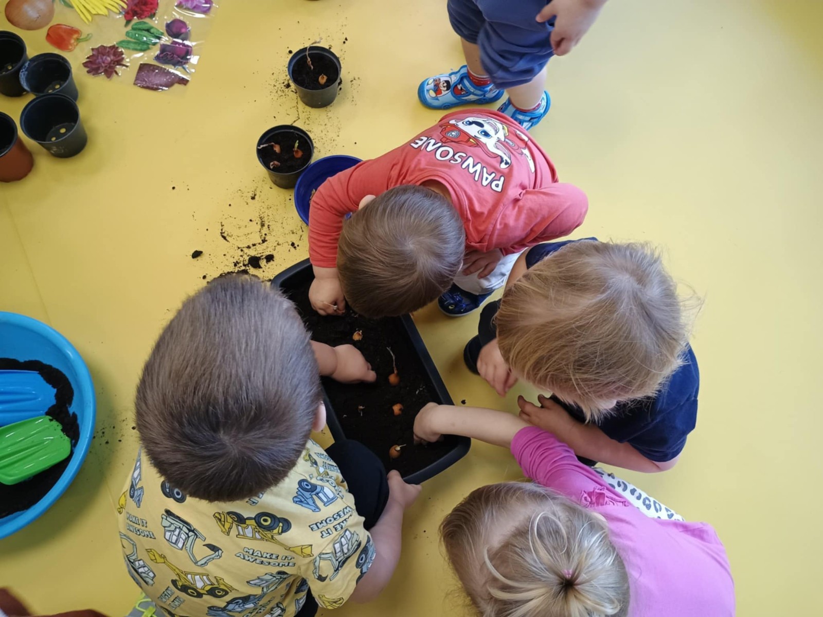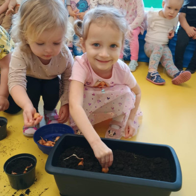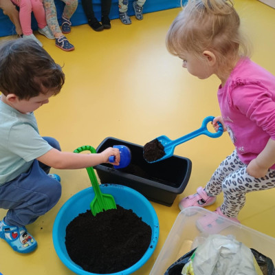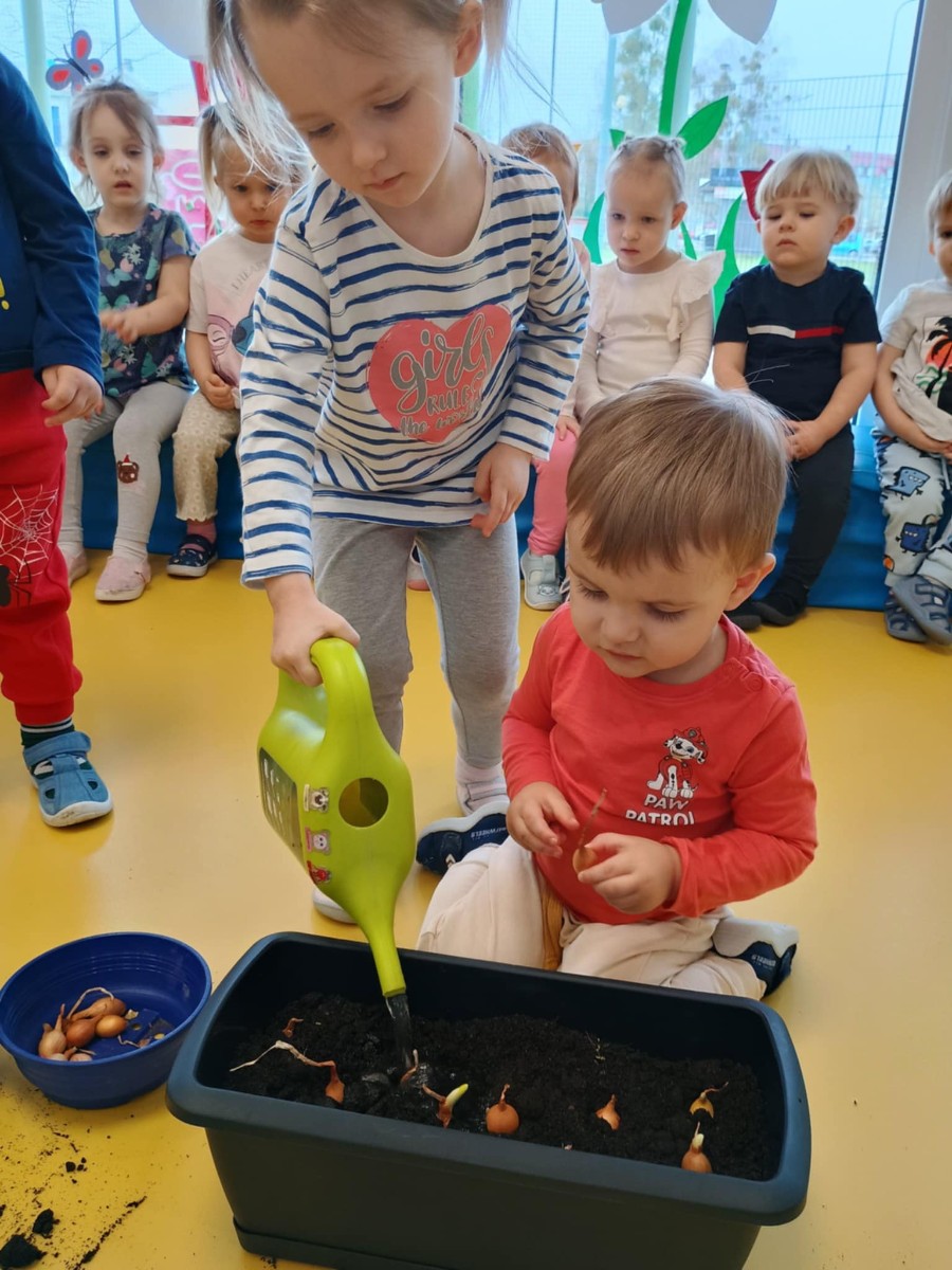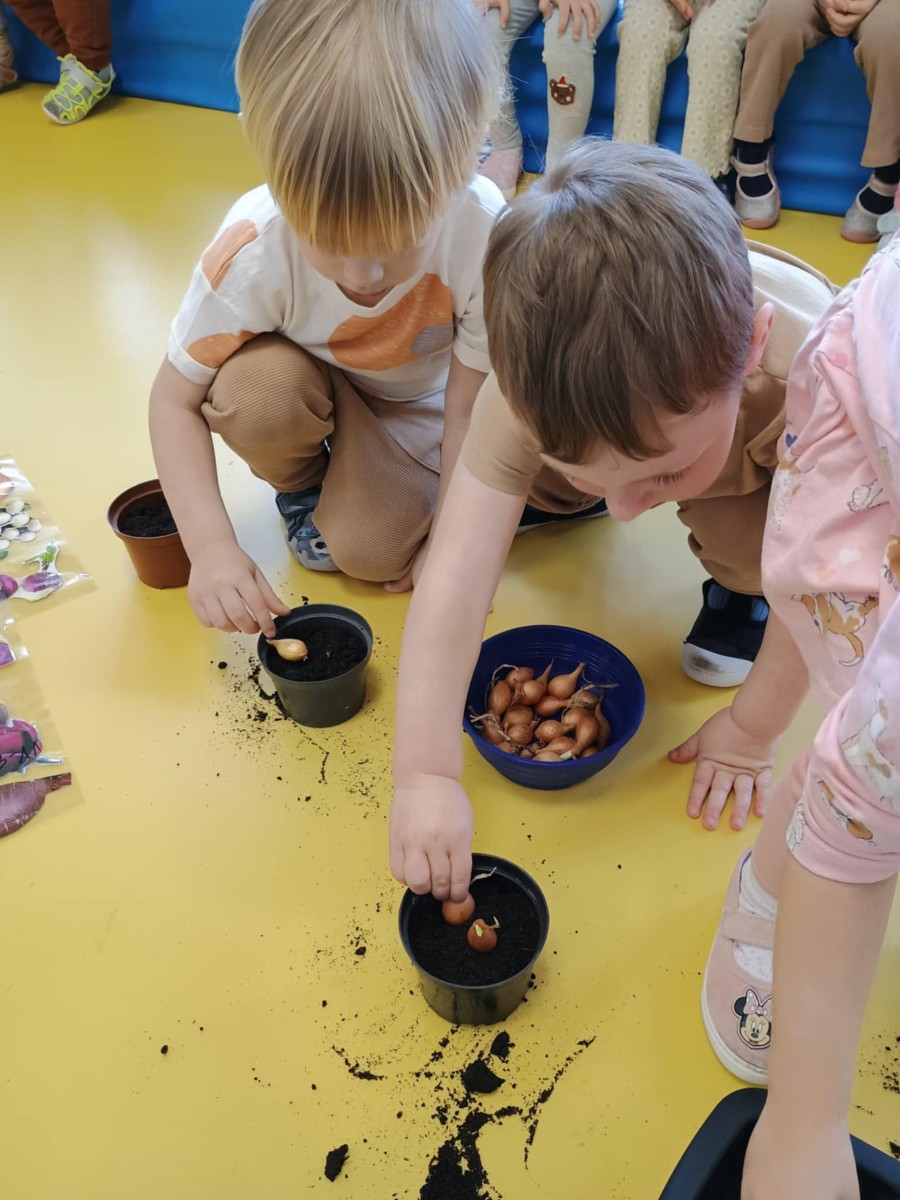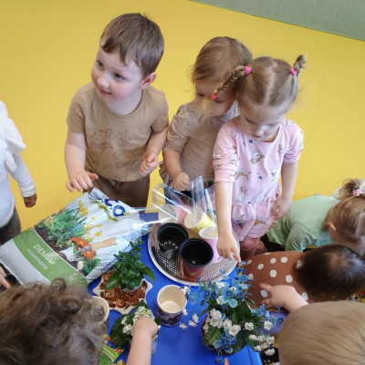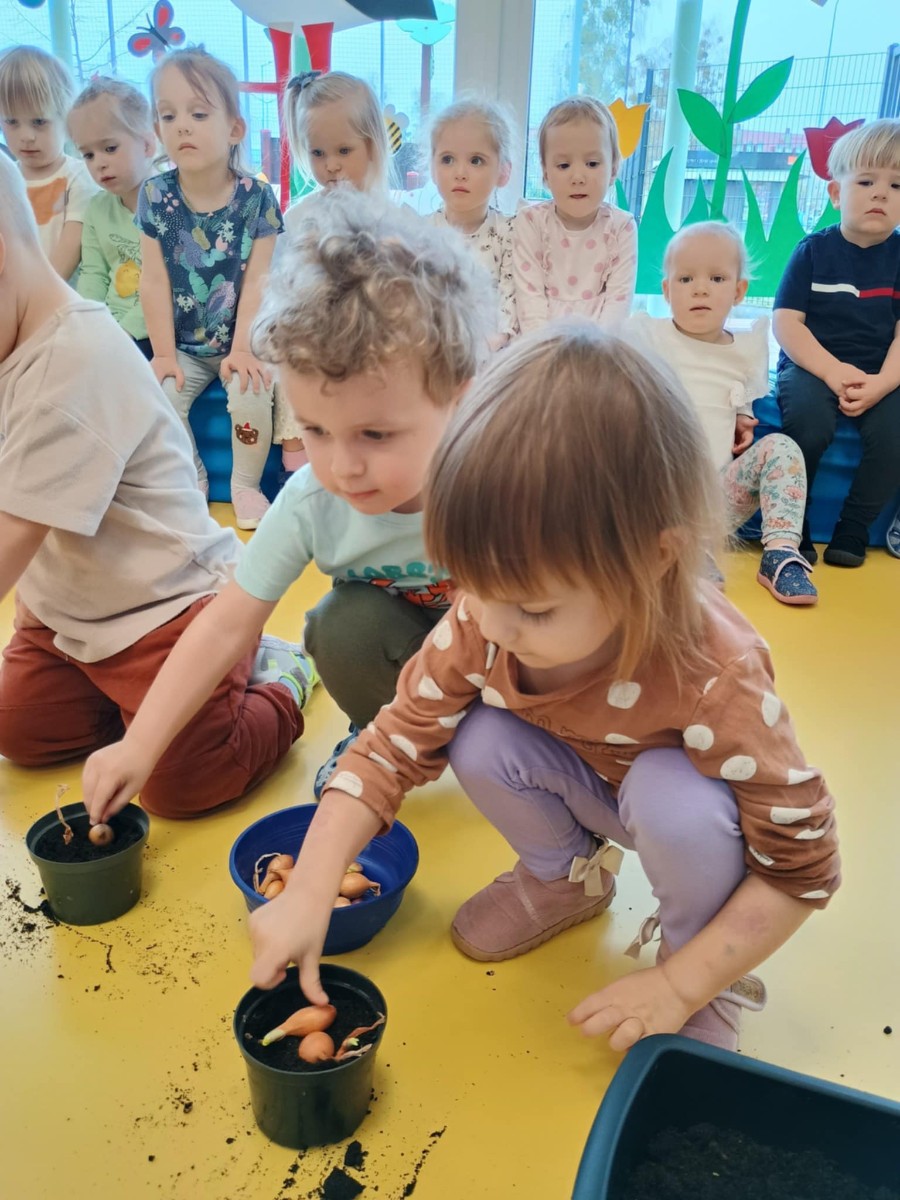 W dniu dzisiejszym w grupie Rybek odbyły się zajęcia pt.„Sadzimy kwiaty”, gdzie dzieci poszerzały wiadomości na temat wiosennych kwiatów i warunków niezbędnych do ich rozwoju. Dzieci miały okazję zabawić się w ogrodników i dowiedzieć się do czego służą odpowiednie sprzęty m.in. doniczka, ziemia, łopatka, sadzonki, rękawiczki, konewka.
