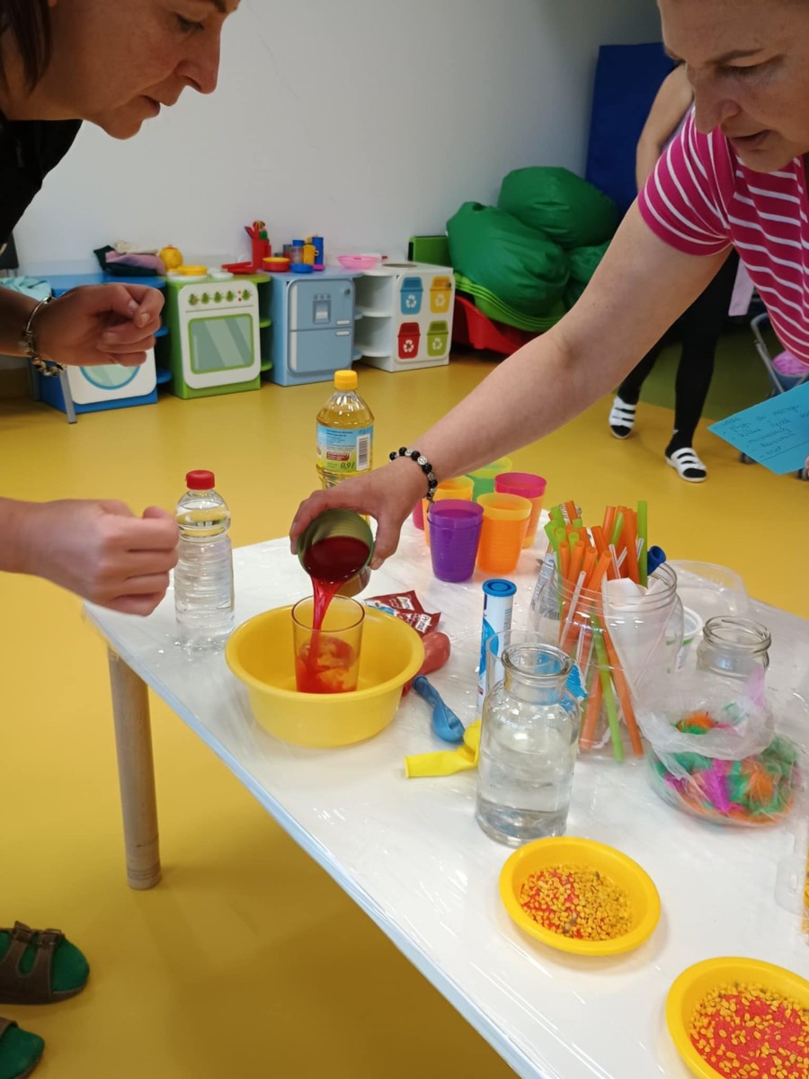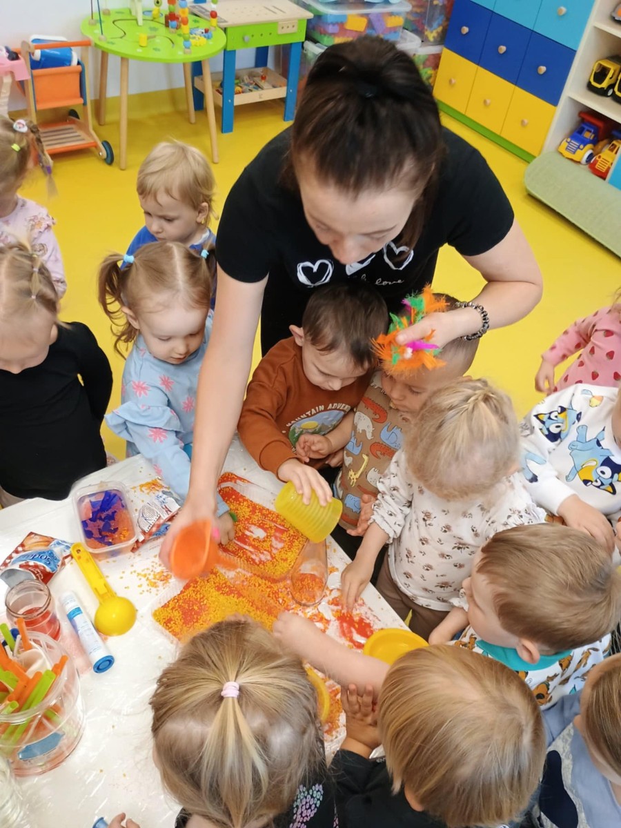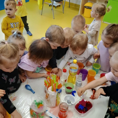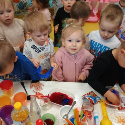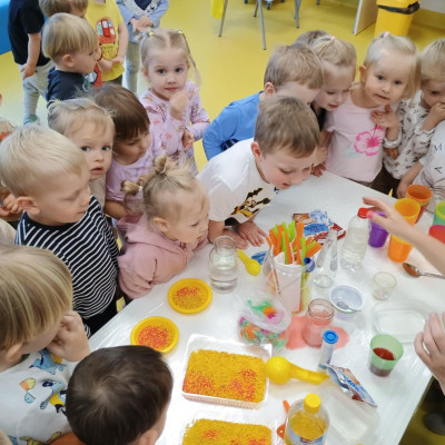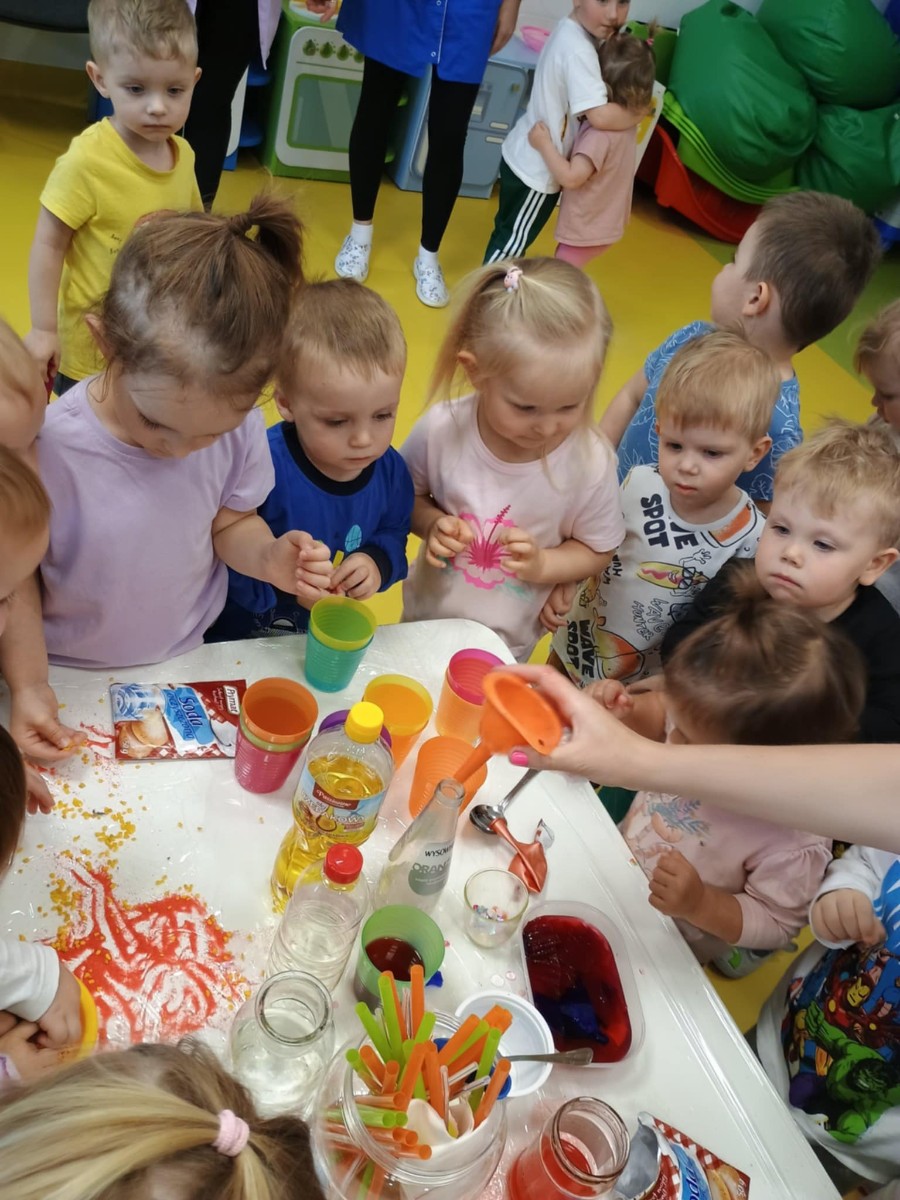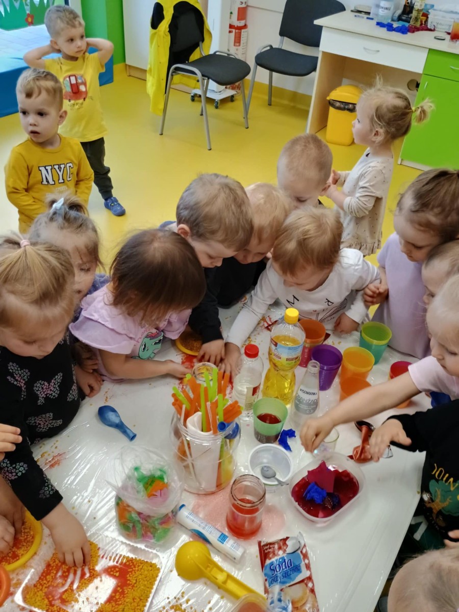 Chociaż za oknem szaro, deszczowo w dzisiejszym dniu u nas w żłobku było wesoło, kolorowo i magicznie. A to dzięki przeniesieniu dzieci w świat doświadczeń chemicznych . Te proste, eksperymenty pobudzily ciekawości dzieci , przybliżyly im podstawowe zjawiska fizyczne i chemiczne w sposób zabawowy i bezpieczny. Było mnóstwo zabawy i radości .