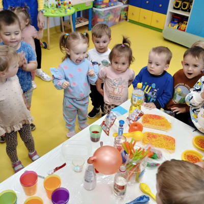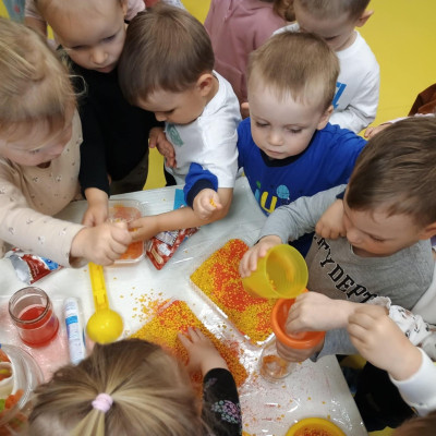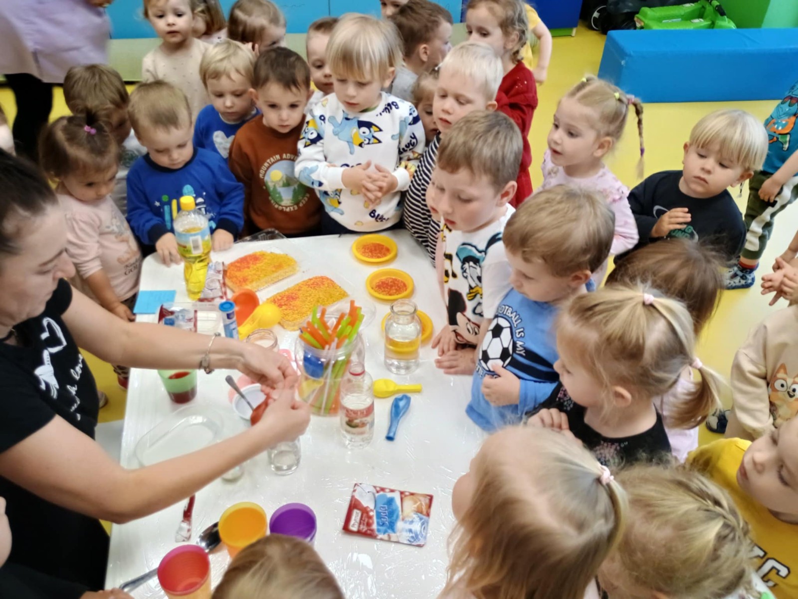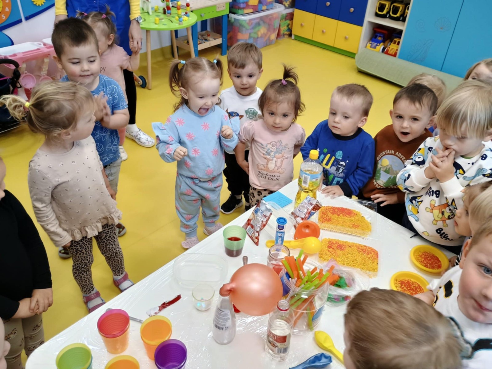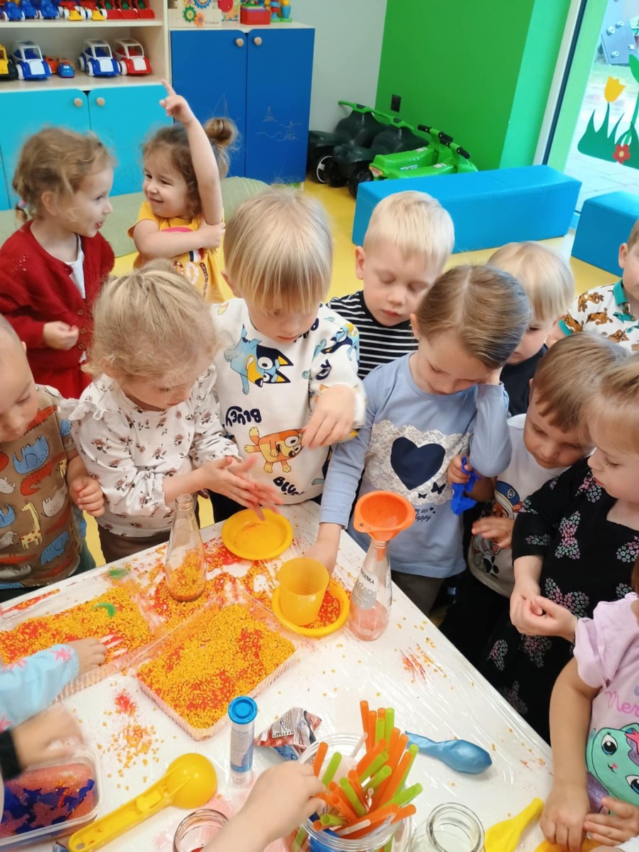 Chociaż za oknem szaro, deszczowo w dzisiejszym dniu u nas w żłobku było wesoło, kolorowo i magicznie. A to dzięki przeniesieniu dzieci w świat doświadczeń chemicznych . Te proste, eksperymenty pobudzily ciekawości dzieci , przybliżyly im podstawowe zjawiska fizyczne i chemiczne w sposób zabawowy i bezpieczny. Było mnóstwo zabawy i radości .