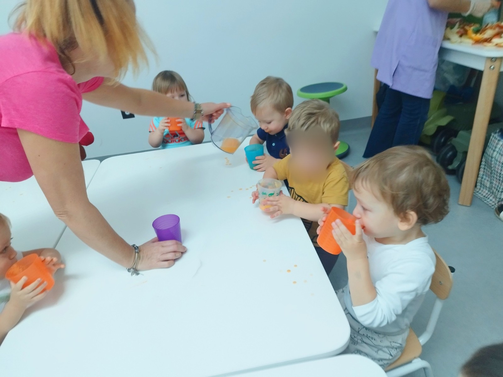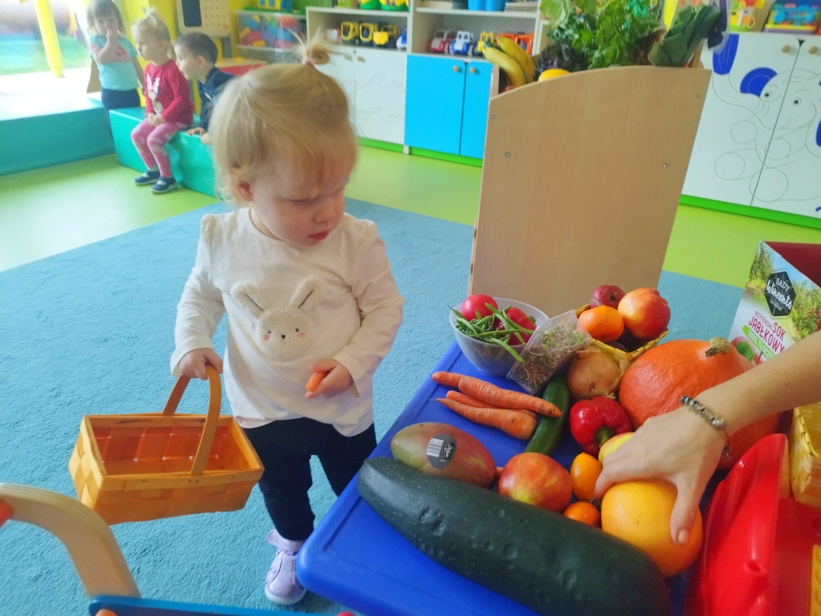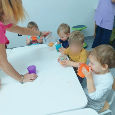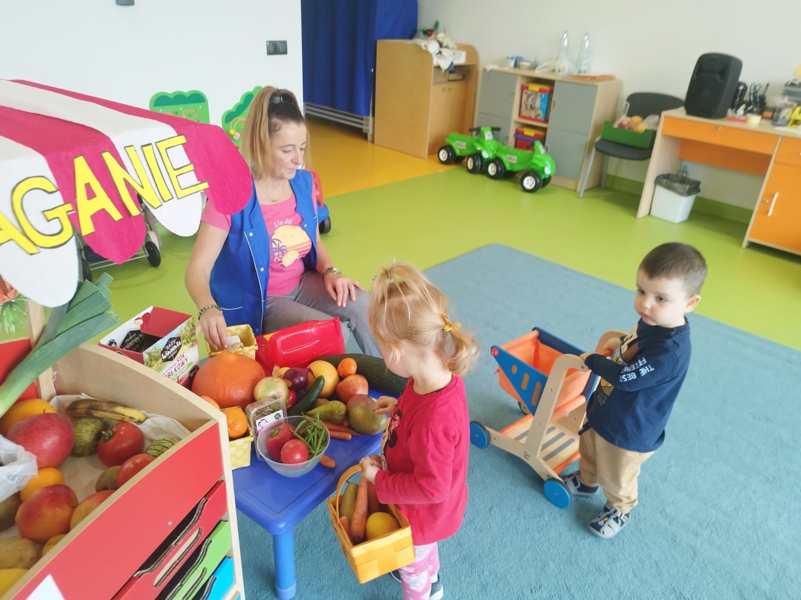 Tygryski obchodziły Dzień owoców i warzyw. Każde dziecko miało za zadanie przynieść z domu owoc i warzywo, które posłużyły nam do zajęć edukacyjnych. Poznaliśmy wiersz Jana Brzechwy pt. "Na straganie". Następnie wspólnie stworzyliśmy stragan na którym maluchy mogły "robić" zakupy wybierając swój ulubiony owoc. Odbyły się owocowo-warzywne tańce do dziecięcych przebojów. Na koniec zajęć z przyniesionych owoców i warzyw wycisnęliśmy pyszny sok, który dzieci ze smakiem wypiły.