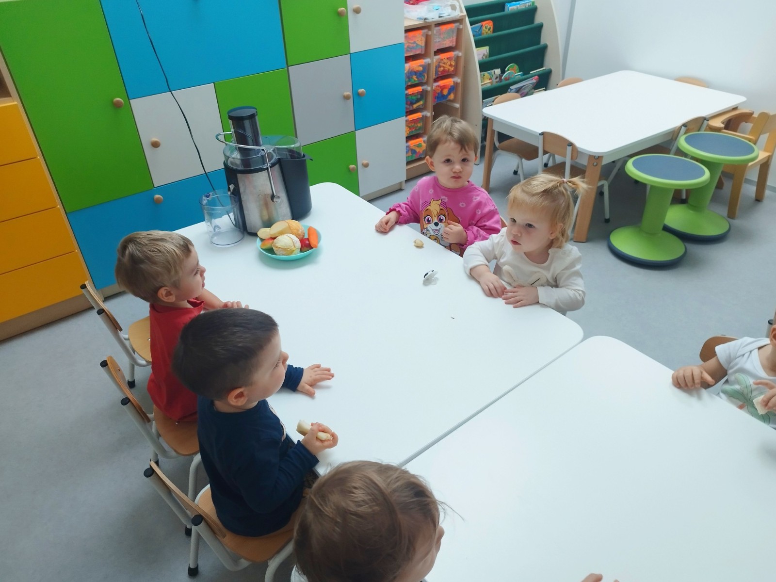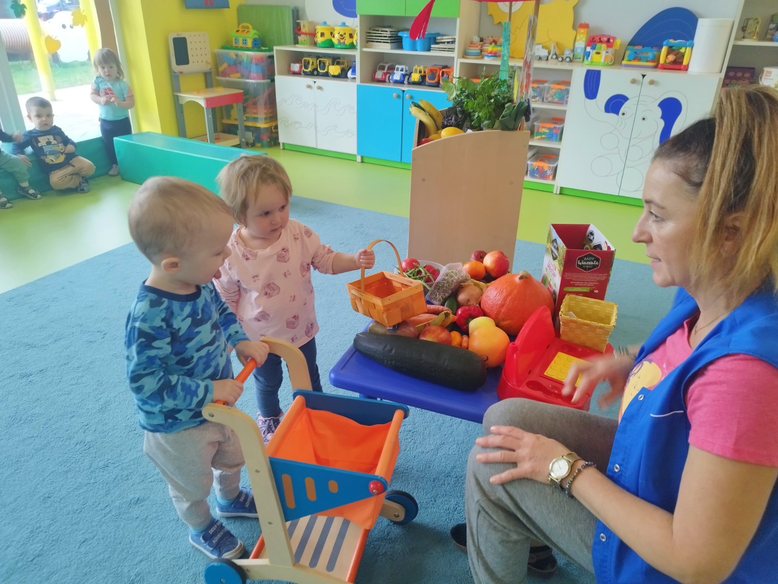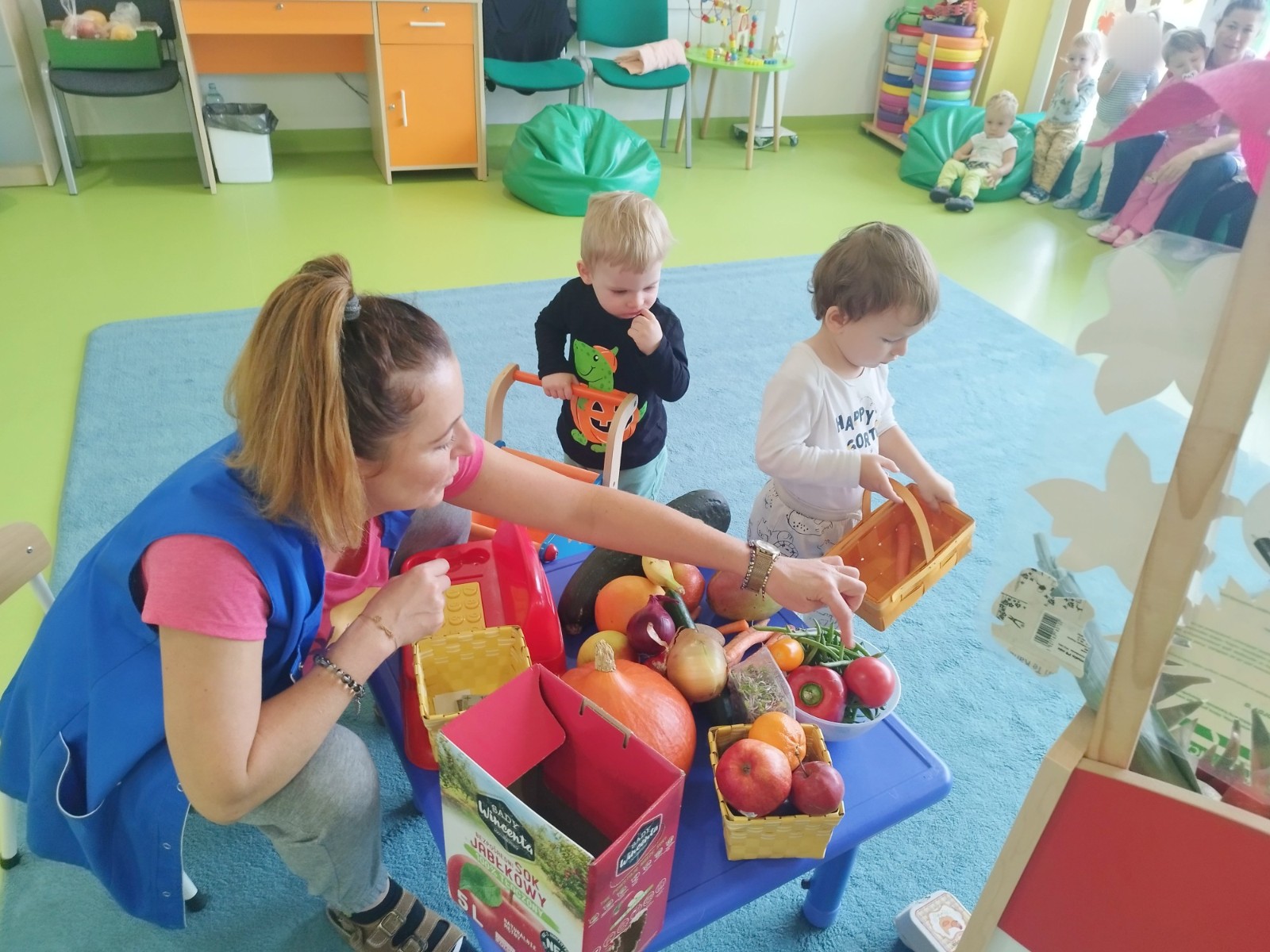 Zdjęcie przedstawia dzieci podczas zajęć edukacyjnych owocach i warzywach