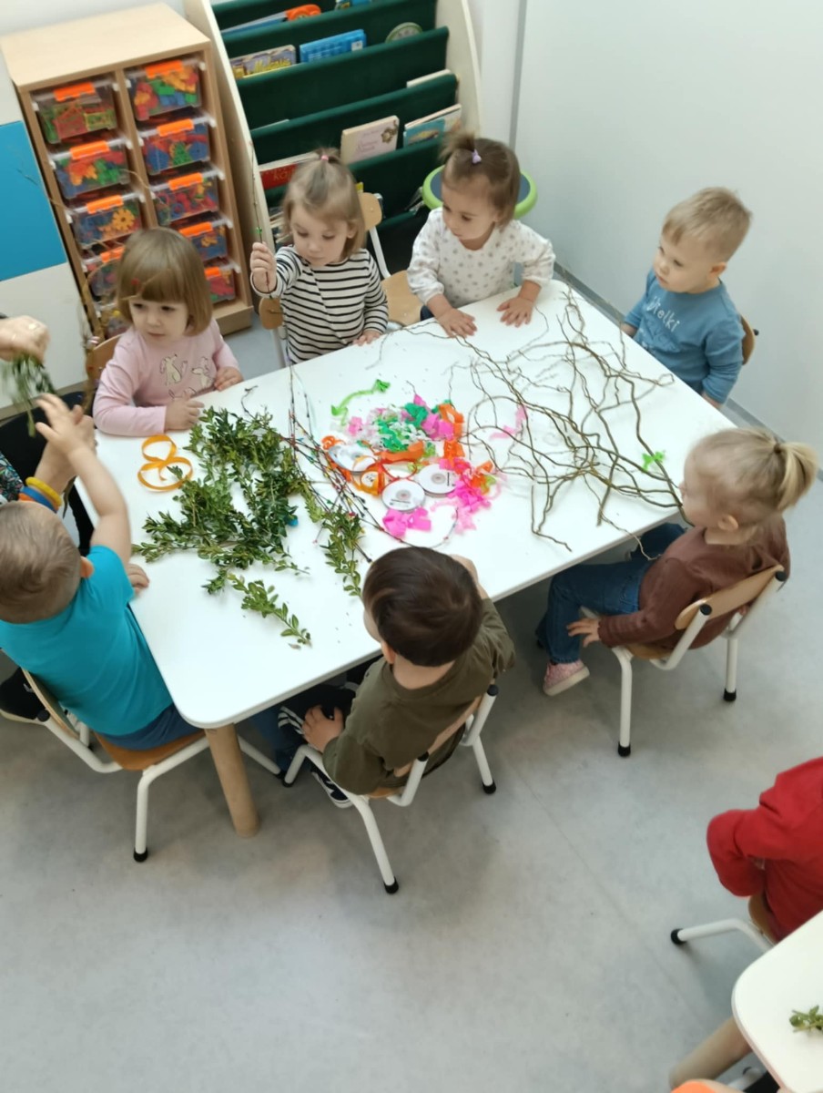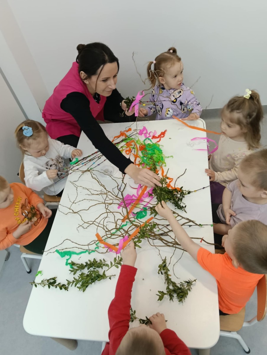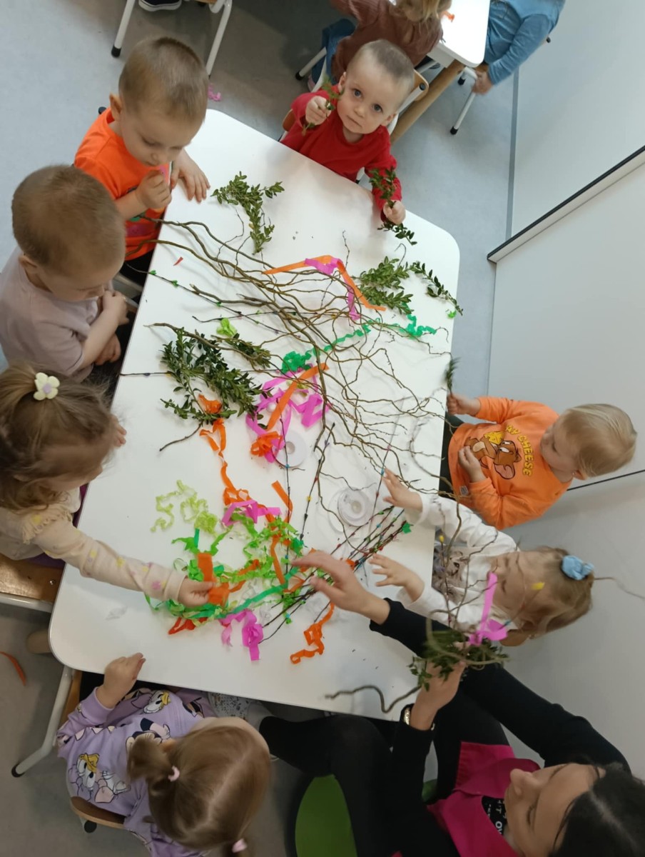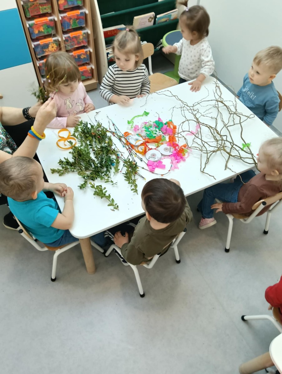 Zdjęcie przedstawia dzieci wykonujące palmy wielkanocne