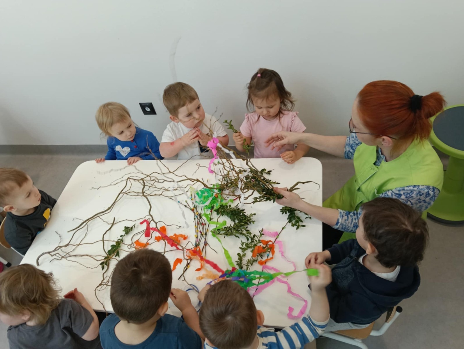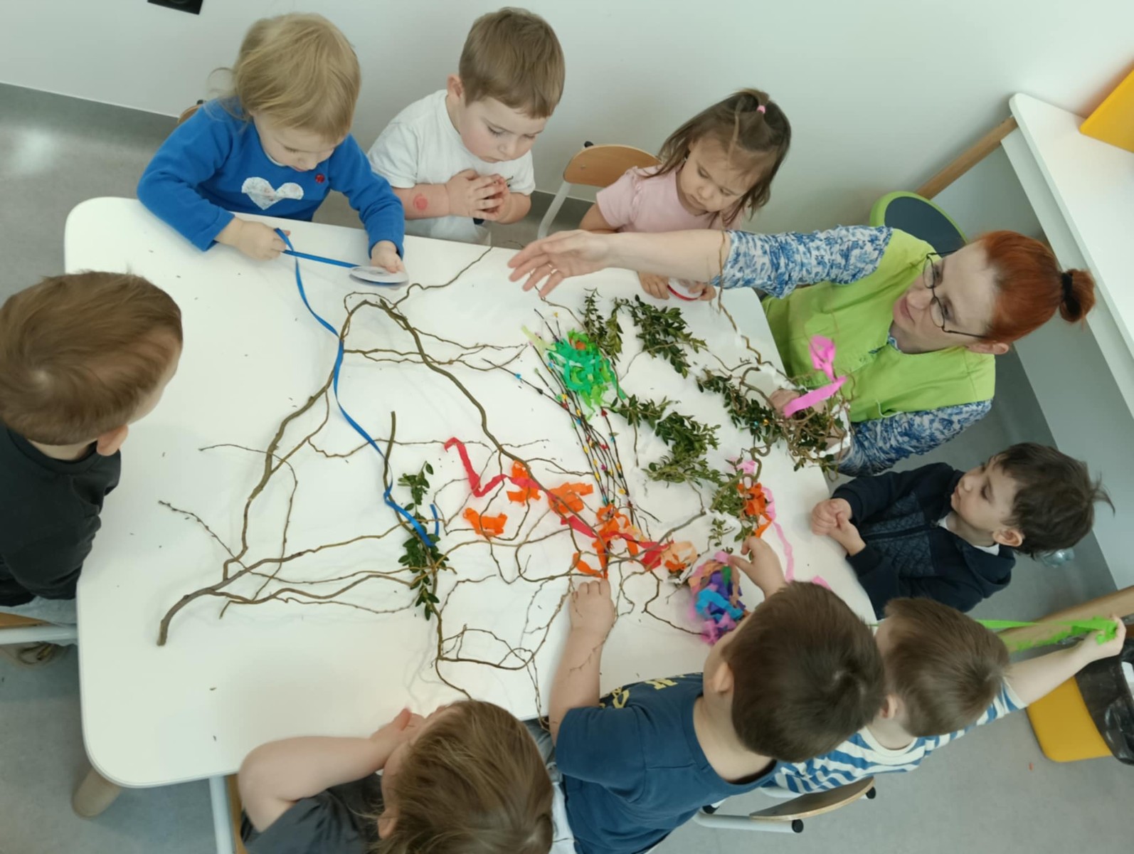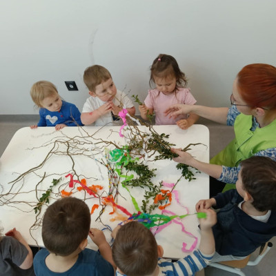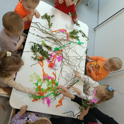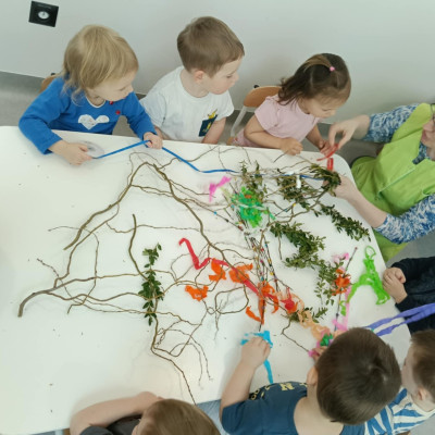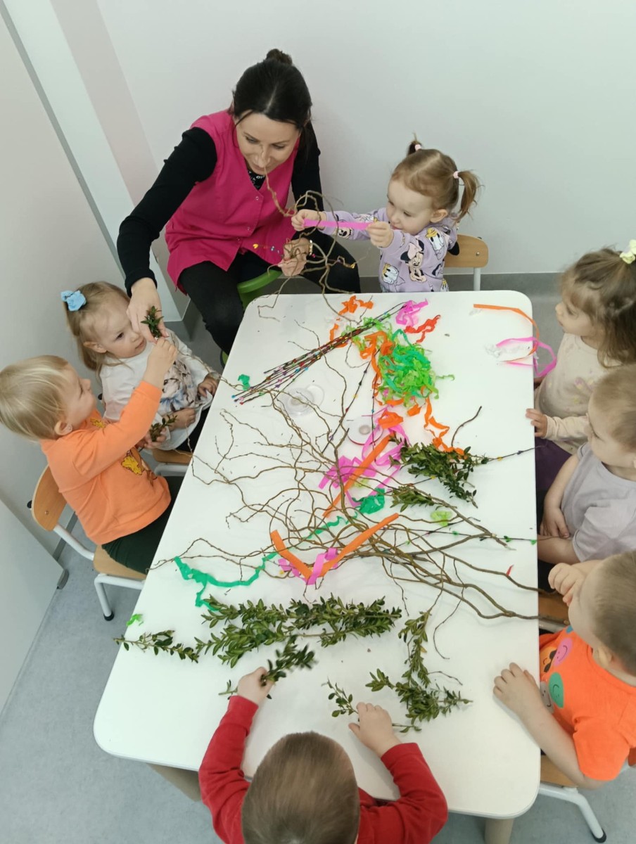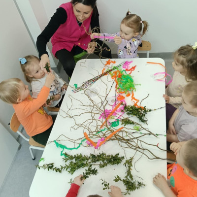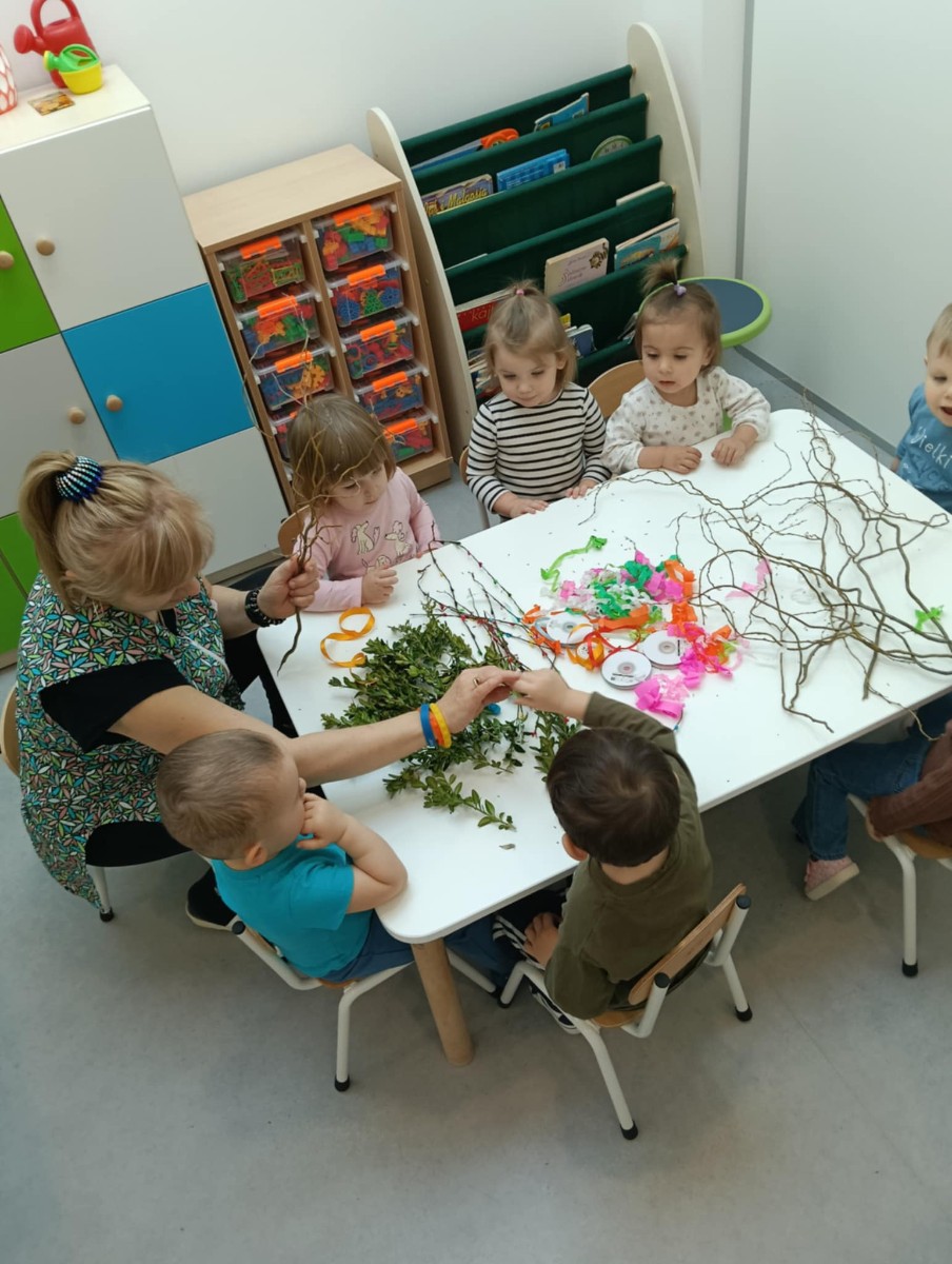 Zdjęcie przedstawia dzieci wykonujące palmy wielkanocne