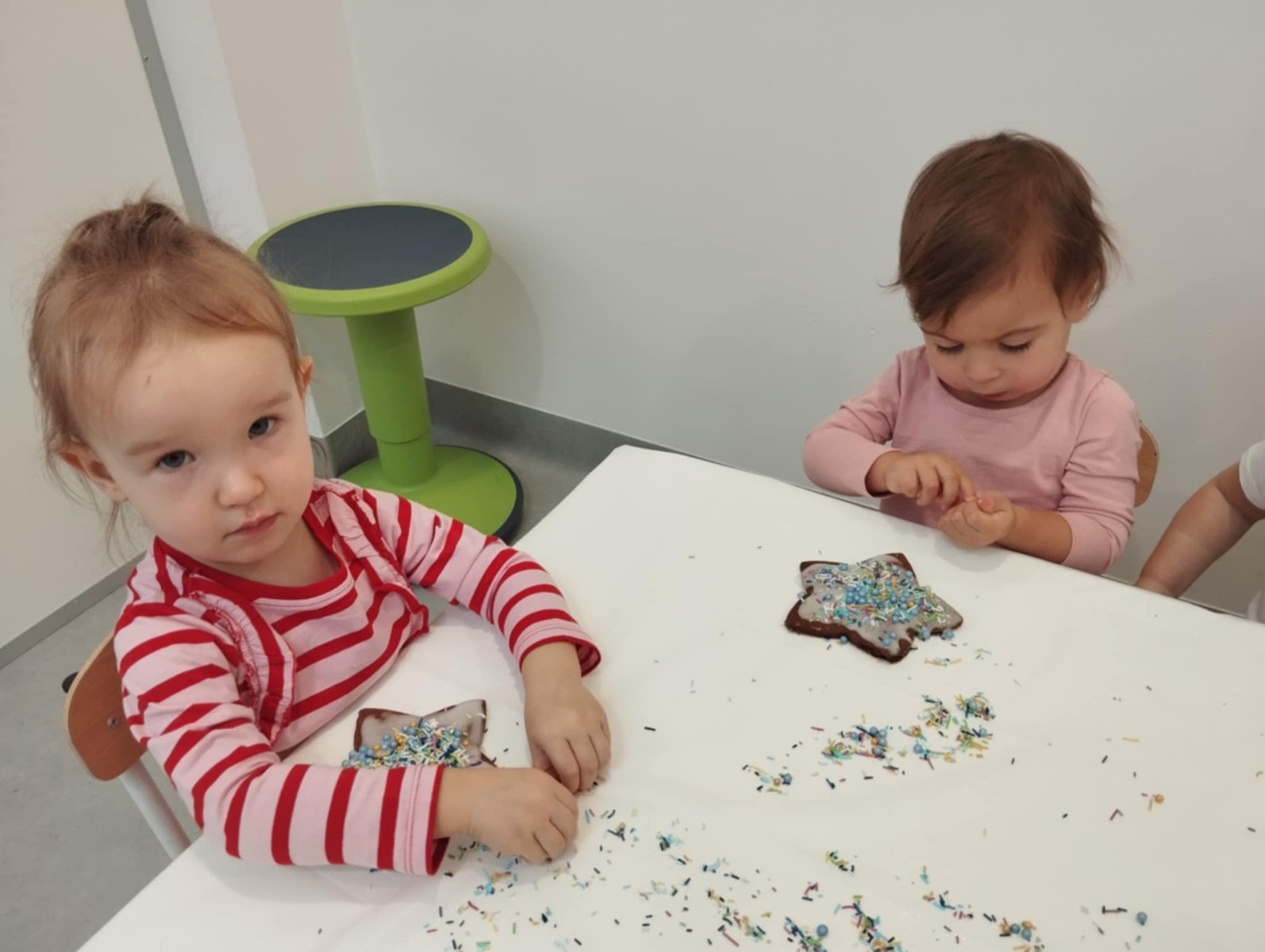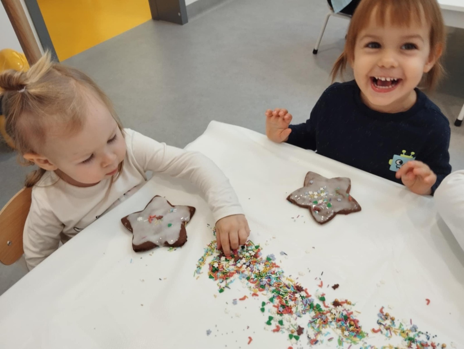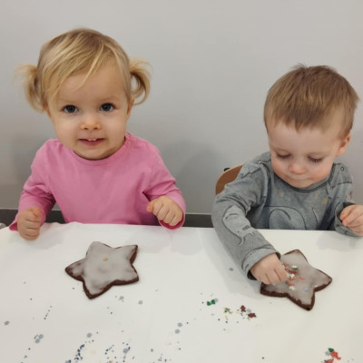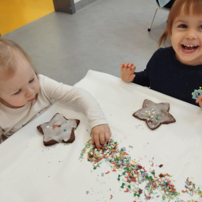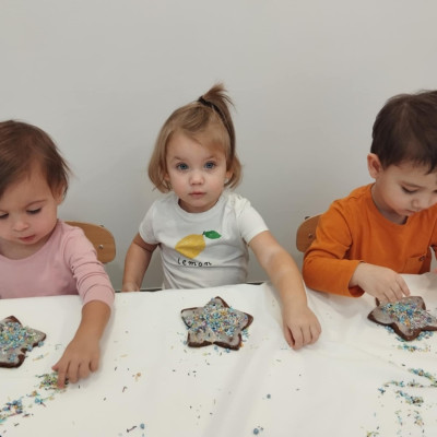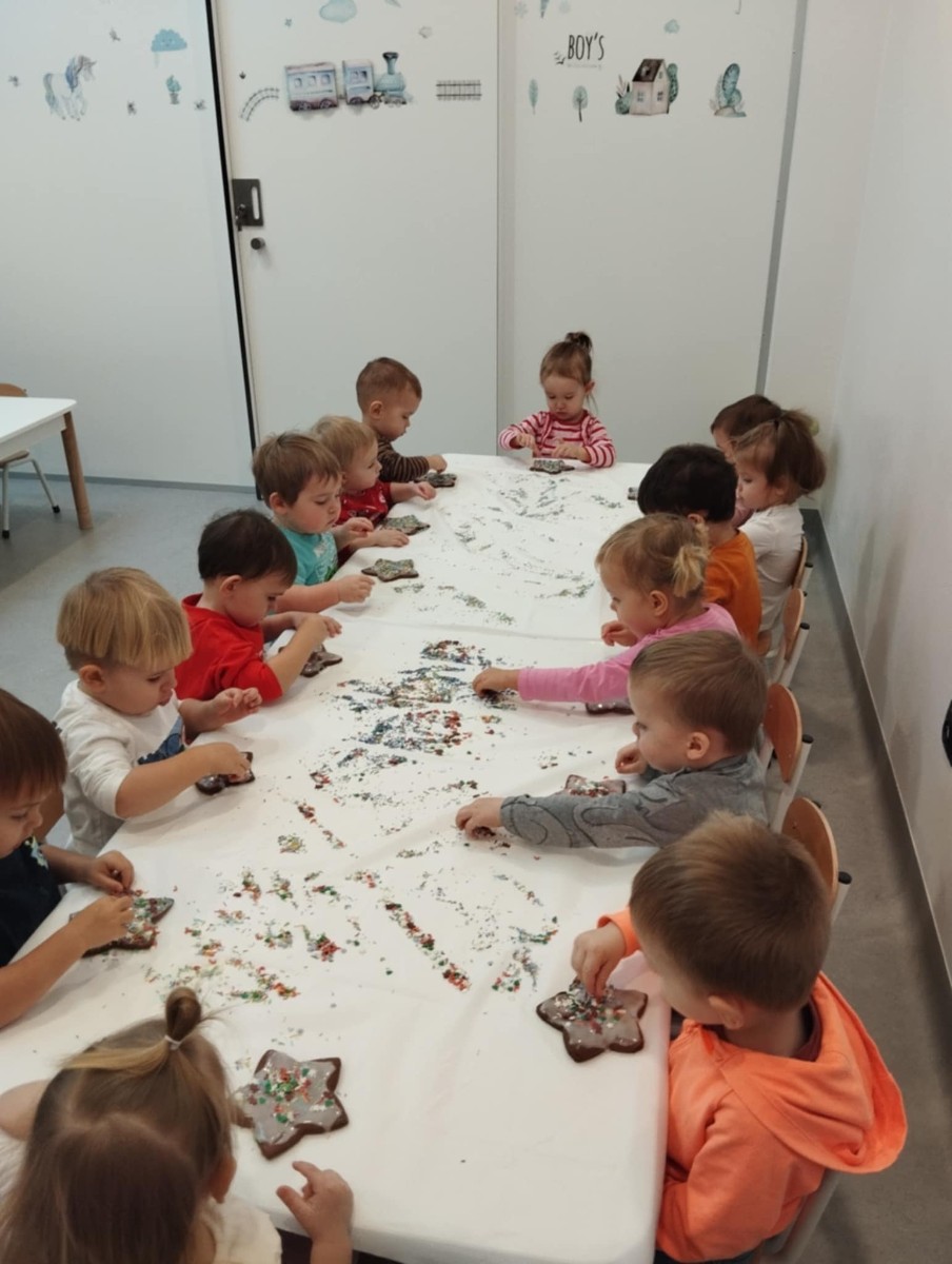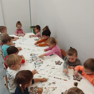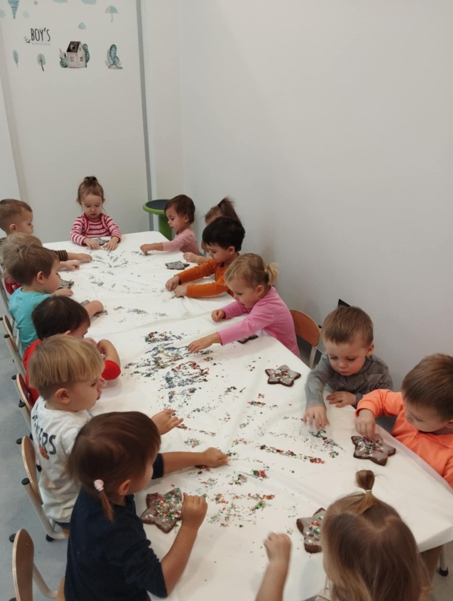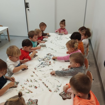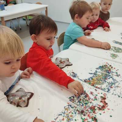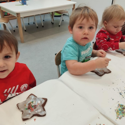 dlatego grupa Tygrysków przygotowuje się już! Dziś nasi mali artyści samodzielnie dekorowali pierniczki , wykorzystując różnokolorowe i o różnych smakach posypki. Wymagało to od nich ogromnej koncentracji, jednak sprawiło im to wiele radości.