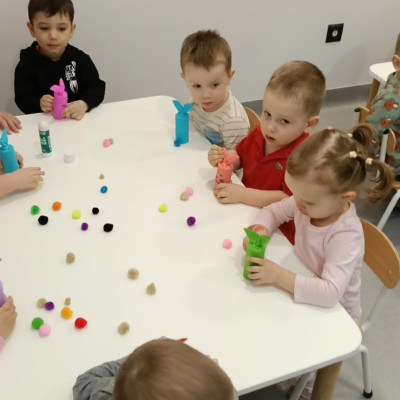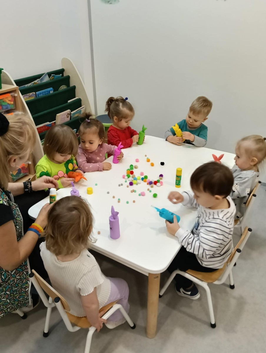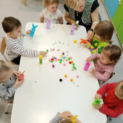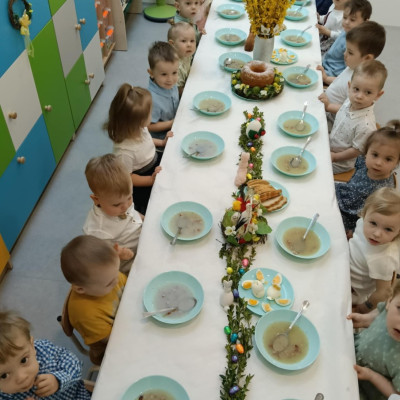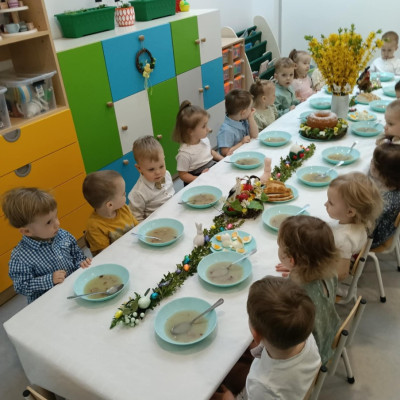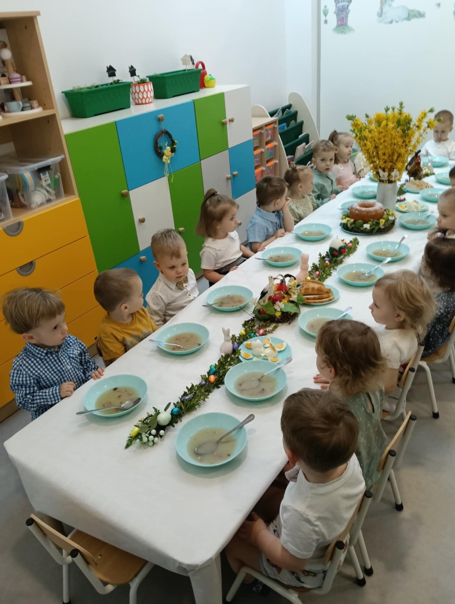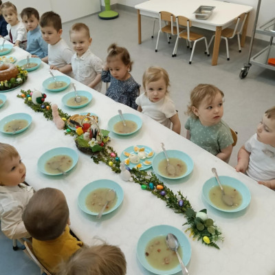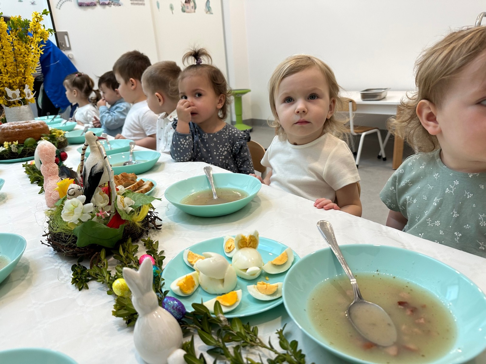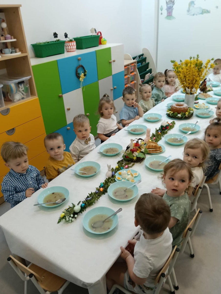 W dniu dzisiejszym w naszym żłobku odbyło się uroczyste śniadanie wielkanocne. Na świątecznym stole nie mogło zabraknąć jajka, białego barszczu z kiełbaską, baranka z ciasta, stroików z kwiatów i bukszpanu. Śniadanko zostało rozpoczęte wspólnym składaniem sobie życzeń świątecznych. Spotkanie przy wspólnym świątecznym stole sprawiło dzieciom wiele radości. Po śniadaniu  odwiedziła nas Pani Dyrektor, która również złożyła dzieciom i ciociom życzenia.