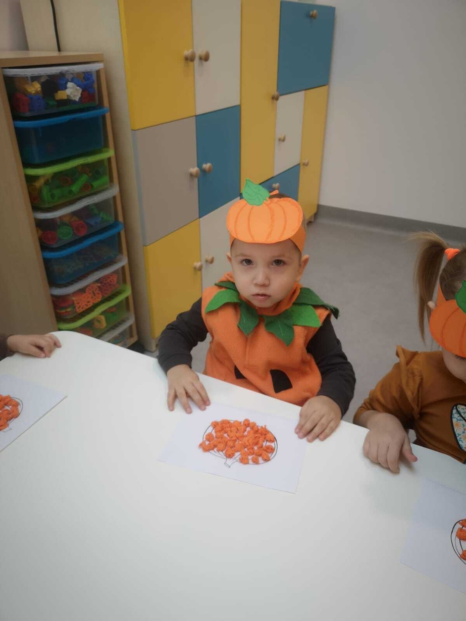 Na zakończenie pracowitego dnia dzieci wykonały pracę plastyczną z wykorzystaniem szablonu dyni i bibuły.