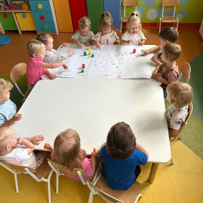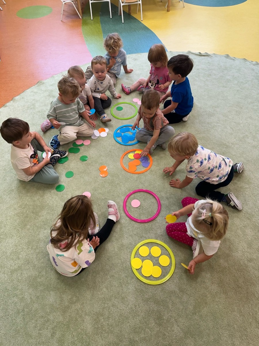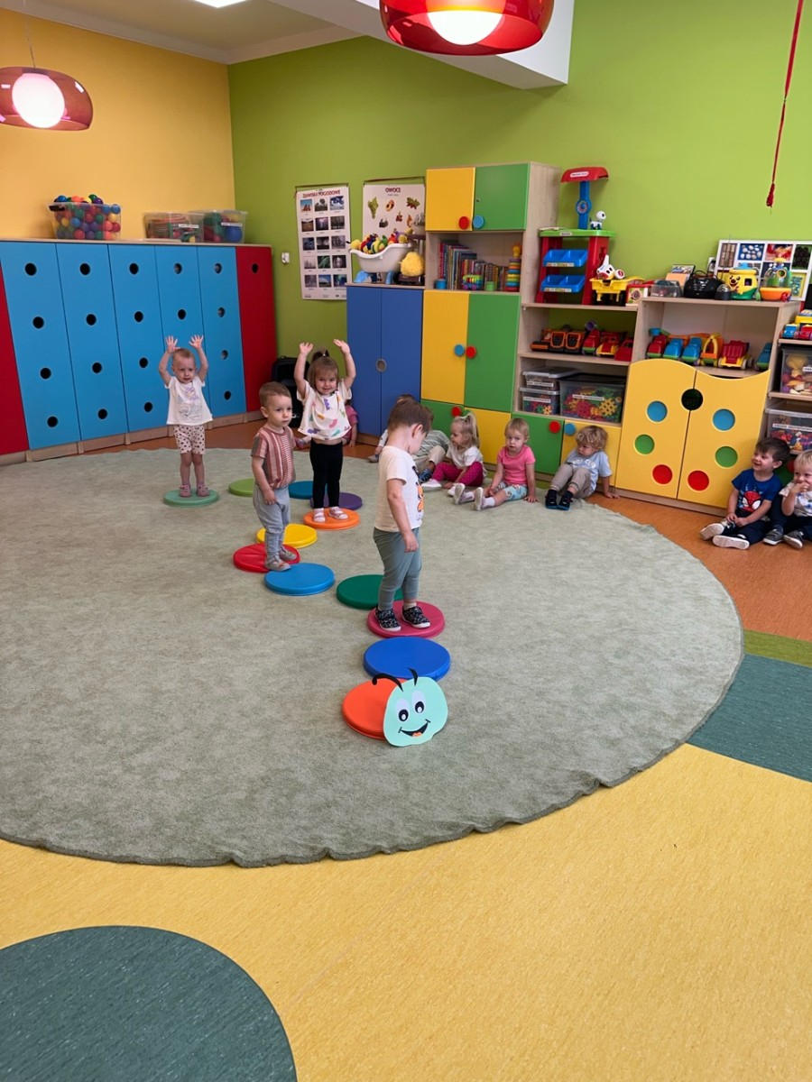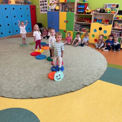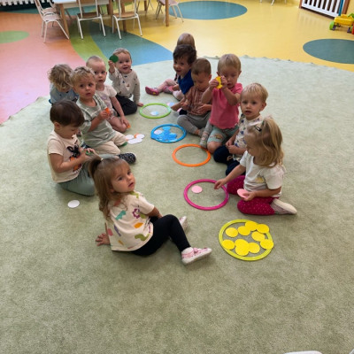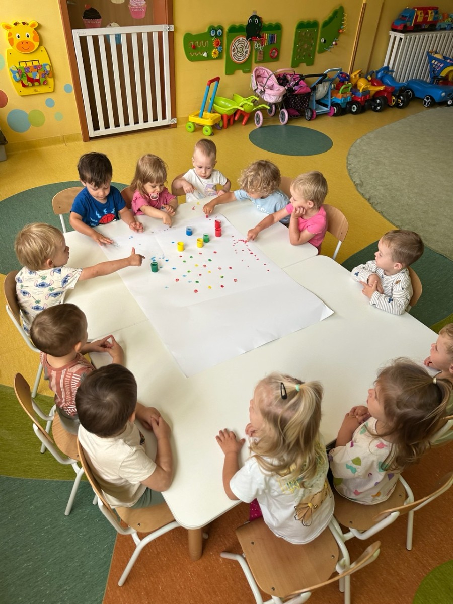 Dziś na gr Rybek obchodziliśmy Międzynarodowy dzień kropki. Dzieci uczestniczyły w kolorowych zajęciach, malując paluszkami kropkowy plakat. Po zajęciach plastycznych, odbyły się zajęcia ruchowe: segregowanie kółek wg kolorów, rzut do celu kolorowymi piłkami oraz zabawy z gąsienicą. Celem naszych zajęć było rozbudzenie kreatywności i sprawności fizycznej, oraz dostarczenie dzieciom dużo radości i dobrej zabawy