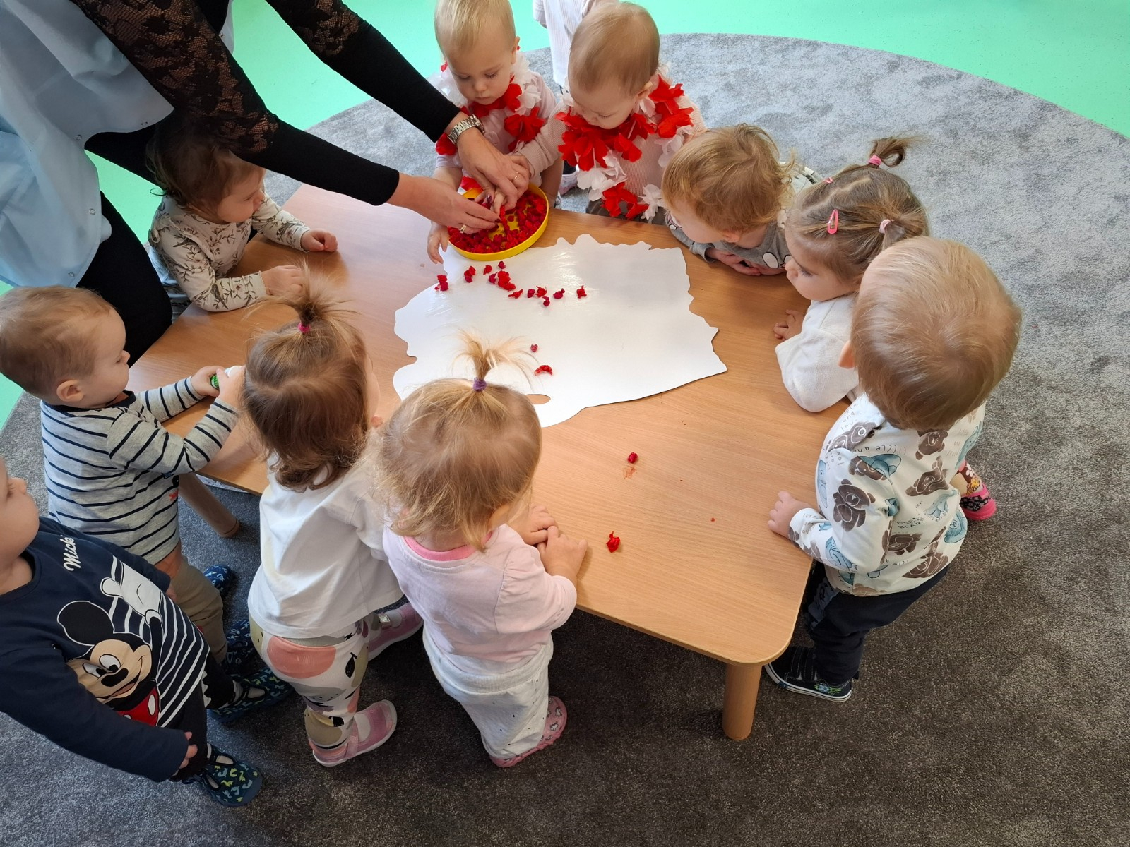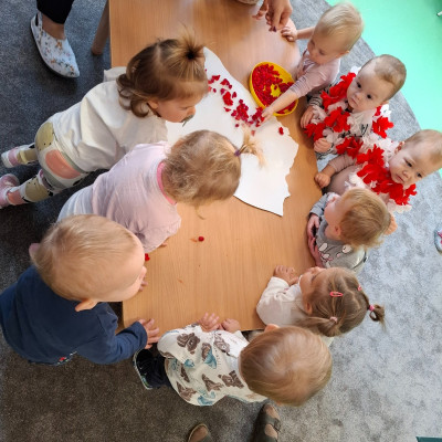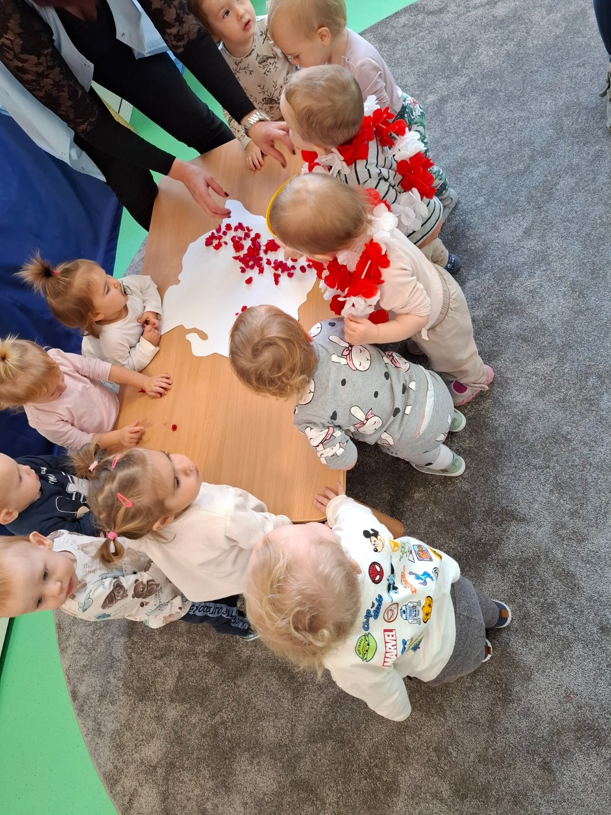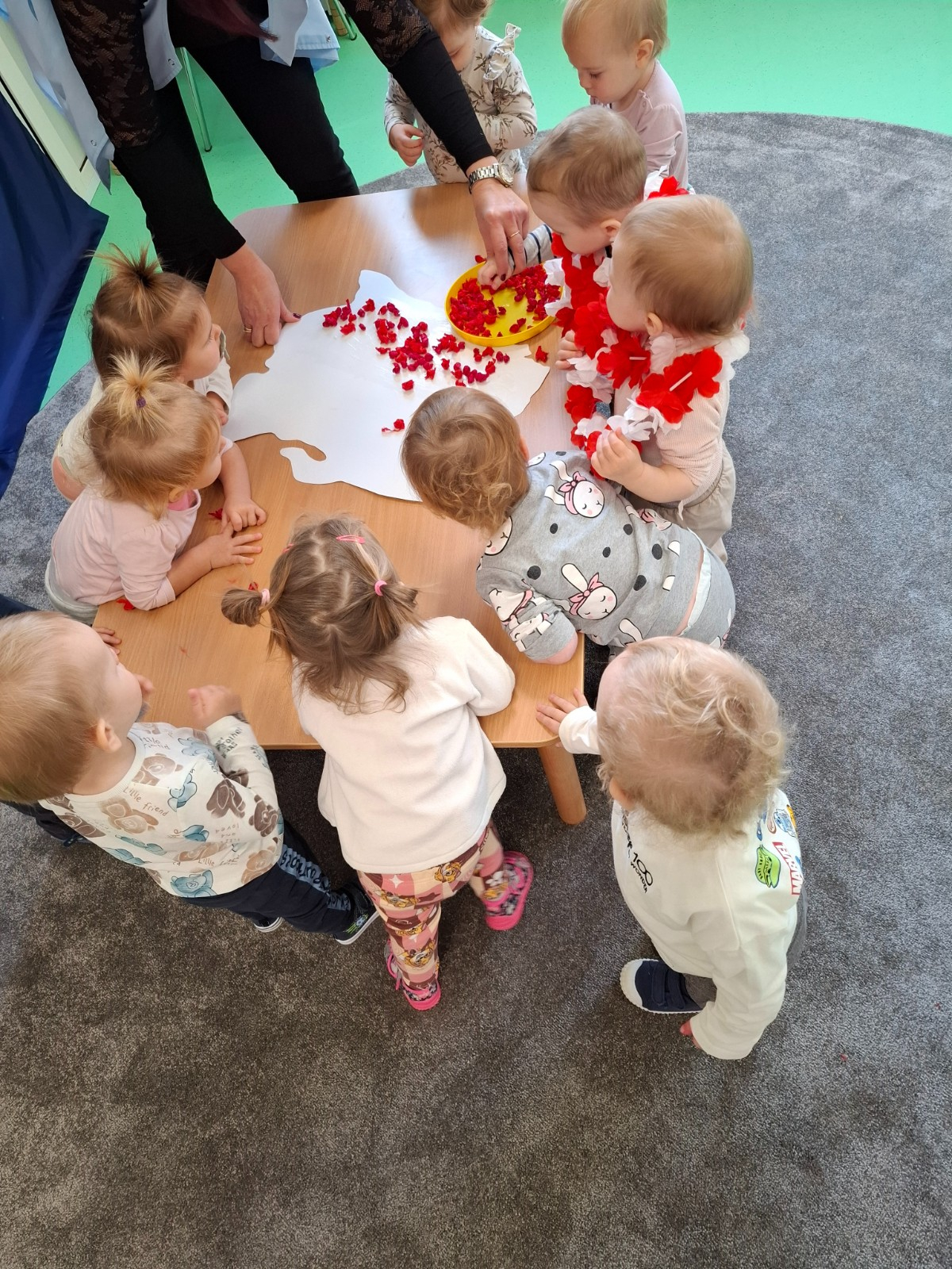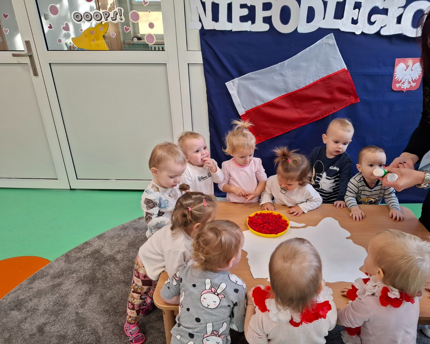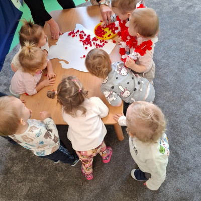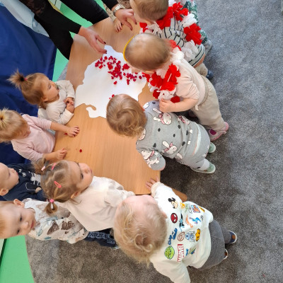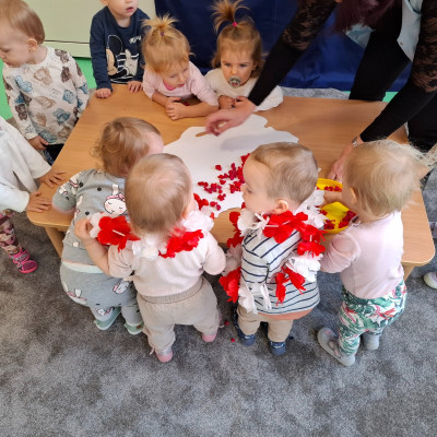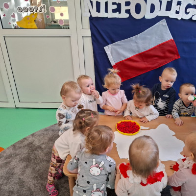 W piątek 8 listopada na grupie Misie wspólnie świętowaliśmy Dzień Niepodległości. W ramach zajęć dzieci poznały symbole oraz barwy narodowe a podczas odsłuchiwania hymnu Polski grały na instrumentach muzycznych .W celu usprawnienia motoryki małej dzieci wykonały wspólną pracę plastyczną podczas której wyklejały mapę Polski kulkami zrobionymi z czerwonej bibuły.