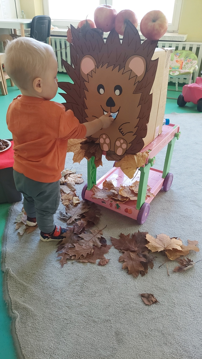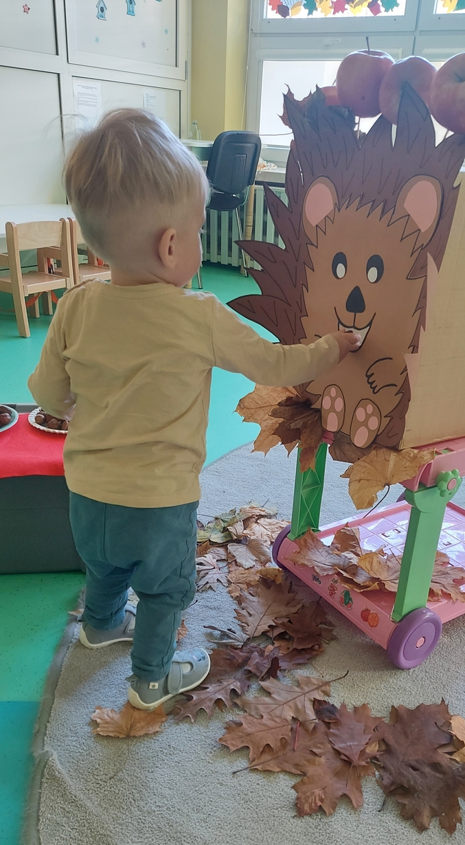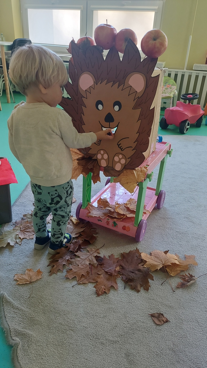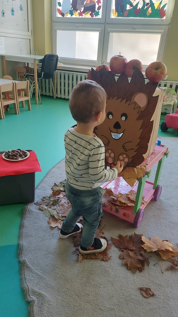 Nasze Misie podczas dzisiejszych zajęć świętowały Dzień Jeża. Na początku dowiedzieli się wielu ciekawostek o tym zimowym śpiochu. Później przy pomocy pań opiekunek wykonały prace plastyczną, odbijając małe rączki na kartce papieru, z których powstały piękne jeżyki. Następnie wszyscy uczestniczyli w wesołej zabawie, a mianowicie karmiły wesołego jeża kasztanami i żołędziami. Na zakończenie ćwiczyliście motorykę dużą przy zabawie ,, na dywanie siedzi jeż " oraz śpiewaliśmy piosenki o tym kolczastym zwierzaku.
