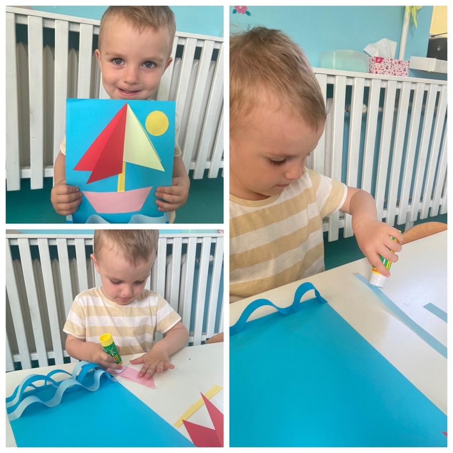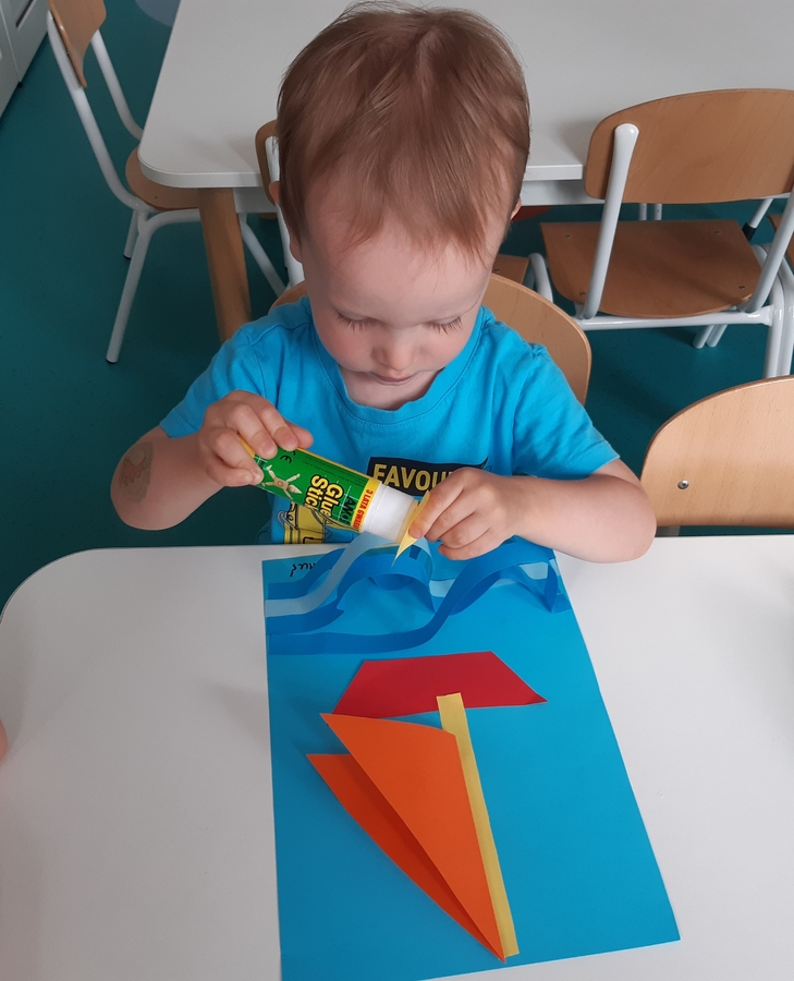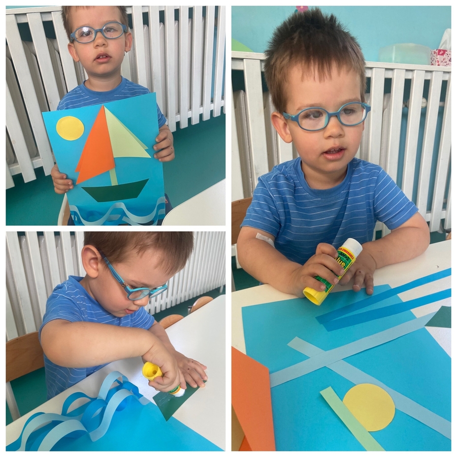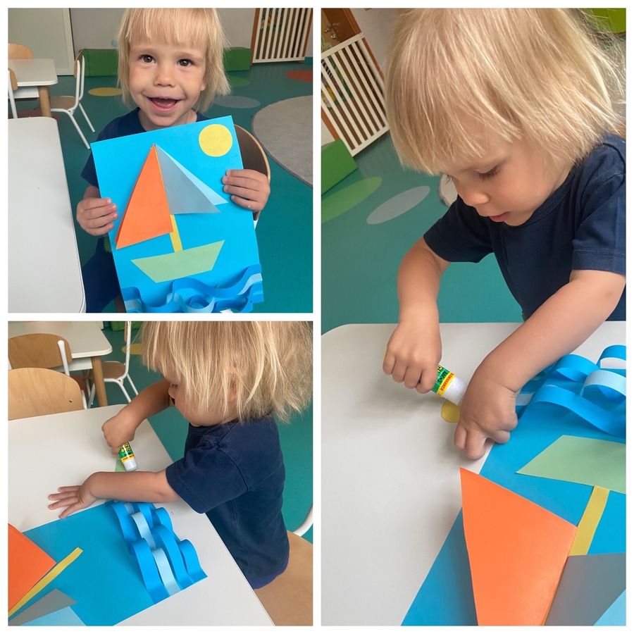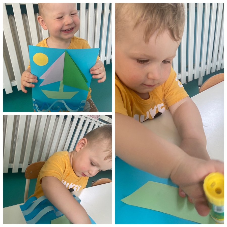 Dziś grupa Żabki wykonała pracę plastyczną przedstawiającą statki. Do wykonania tej pracy dzieci wykorzystały różnorodne figury geometryczne, które doklejały do kartki kolorowego papieru.