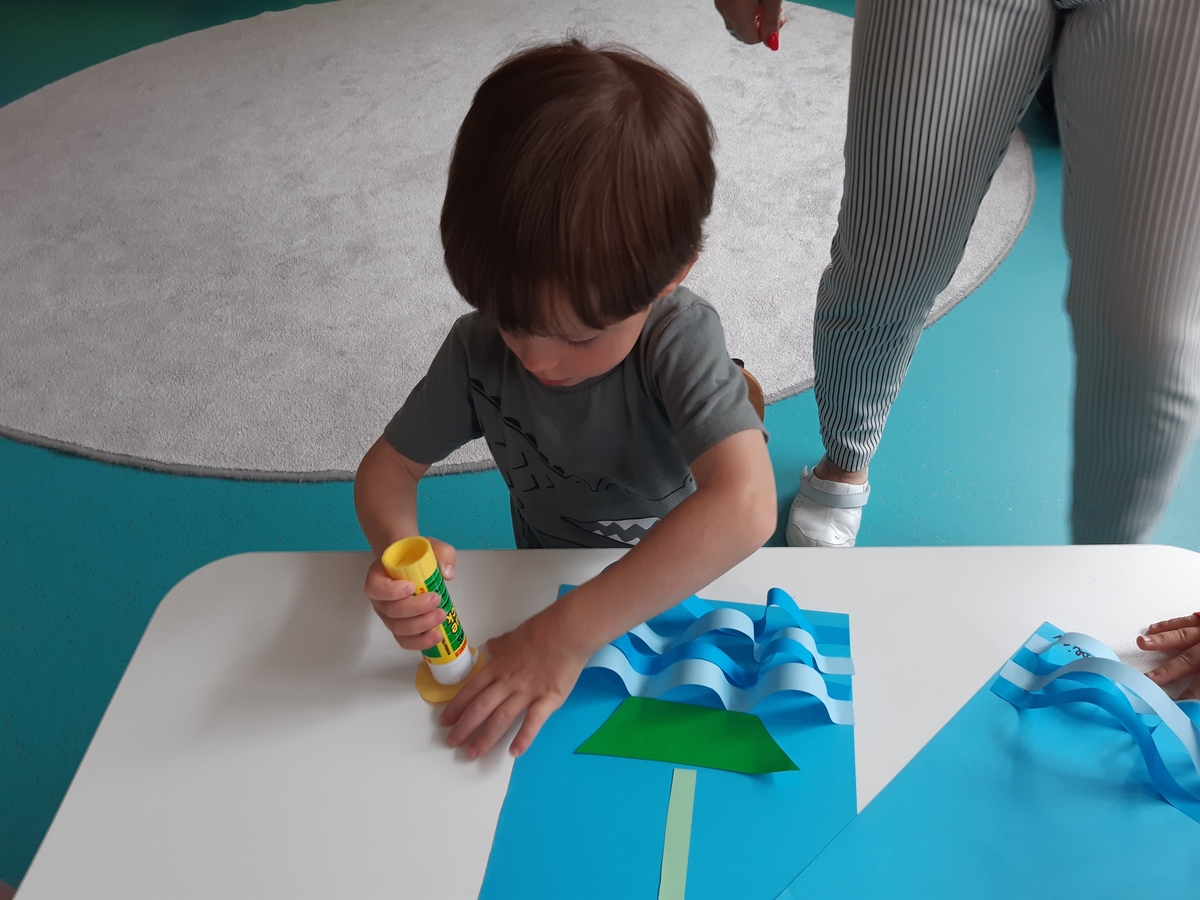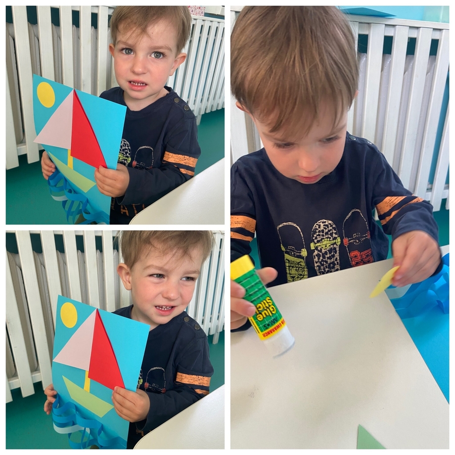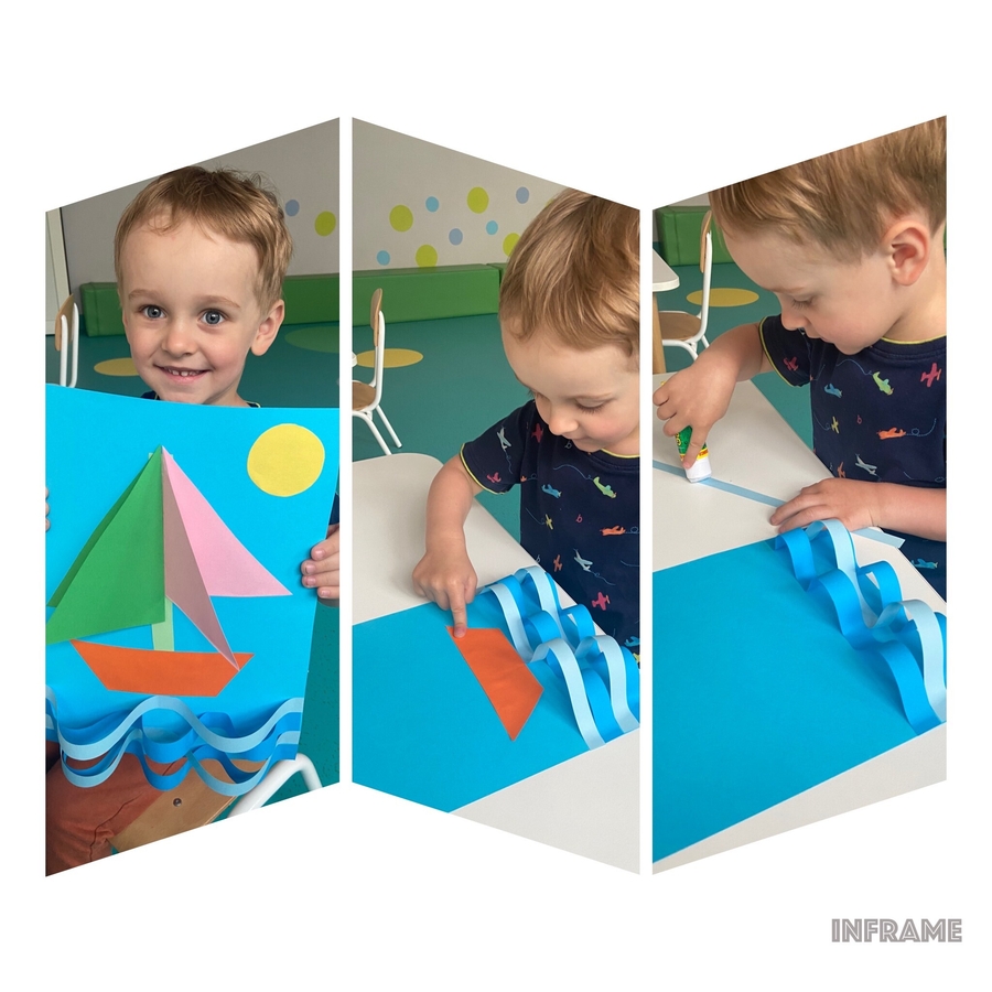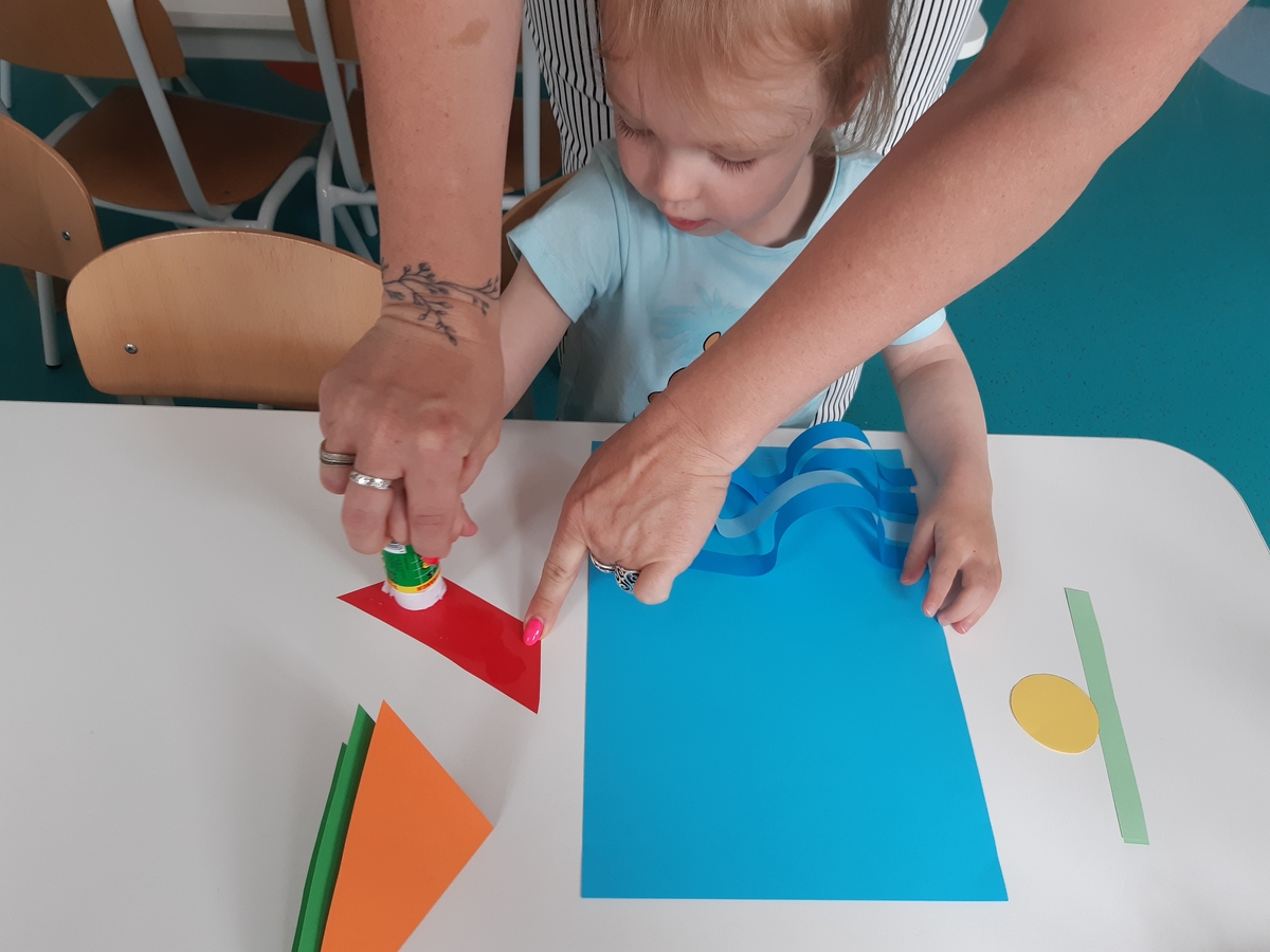 Dziś grupa Żabki wykonała pracę plastyczną przedstawiającą statki. Do wykonania tej pracy dzieci wykorzystały różnorodne figury geometryczne, które doklejały do kartki kolorowego papieru.