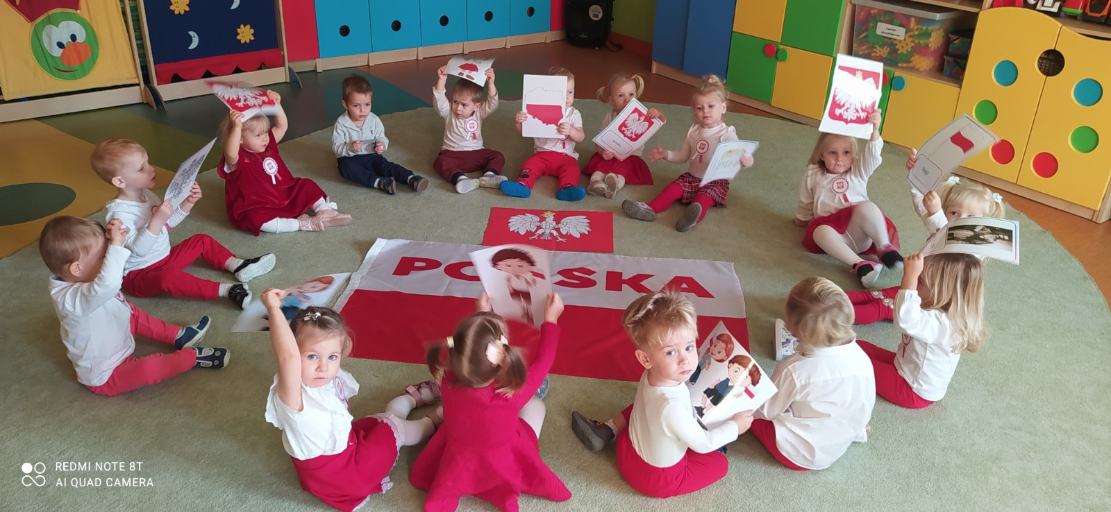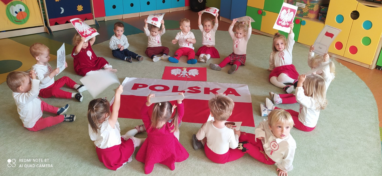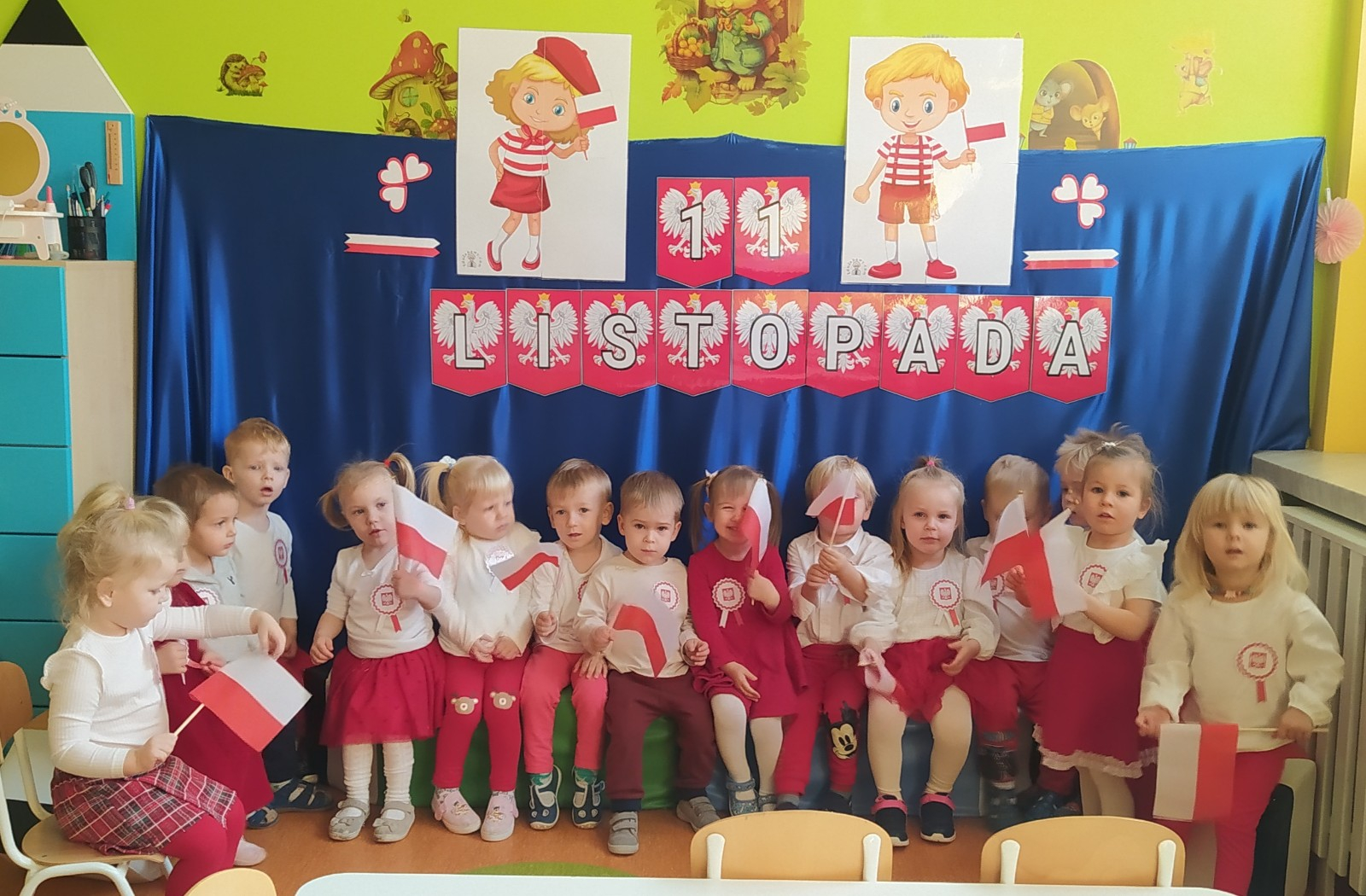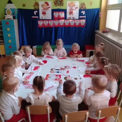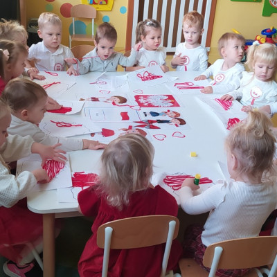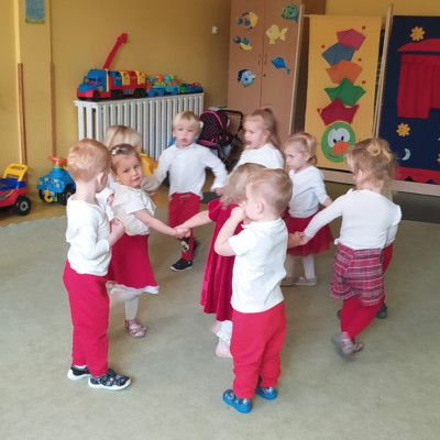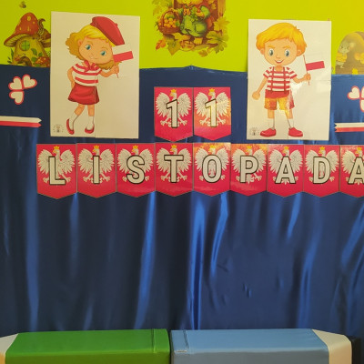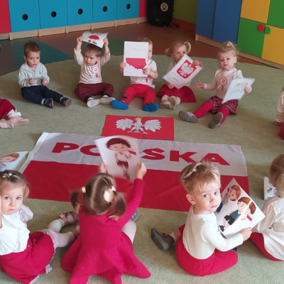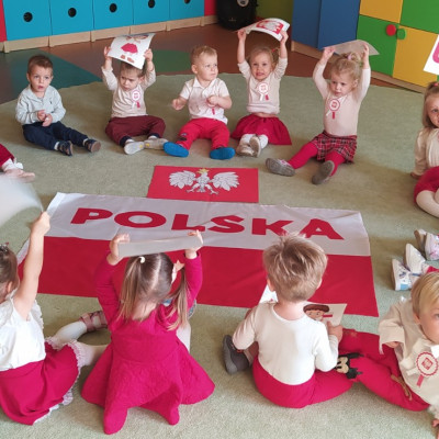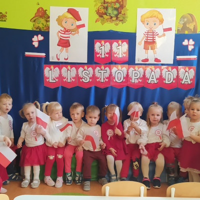 W dniu 7 Listopada 2024 r. obchodziliśmy w naszym Żłobku Święto Niepodległości. W tak ważnym dniu dzieci prezentowały się niezwykle uroczyście w galowych strojach. Podkreślając wagę naszych symboli narodowych: Godła, Flagi, Hymnu oraz znaczenia Ojczyzny w naszym życiu-dzieci wysłuchały Hymn Polski,, Mazurek Dąbrowskiego".Grupa ,, Rybki" wykonała własnoręcznie czerwoną włóczką Flagę Polski imitującą obszar naszego kraju. Było przepięknie, wzruszająco i uroczyście. Wszyscy przeżyli lekcję patriotyzmu i miłości do kraju ojczystego, która na długo pozostanie w pamięci naszych,, Małych Polaków"