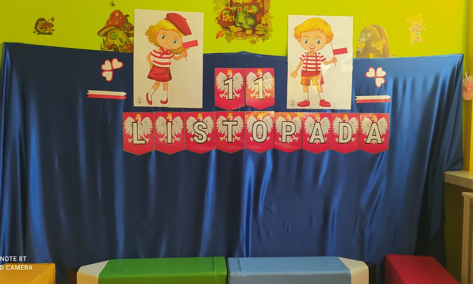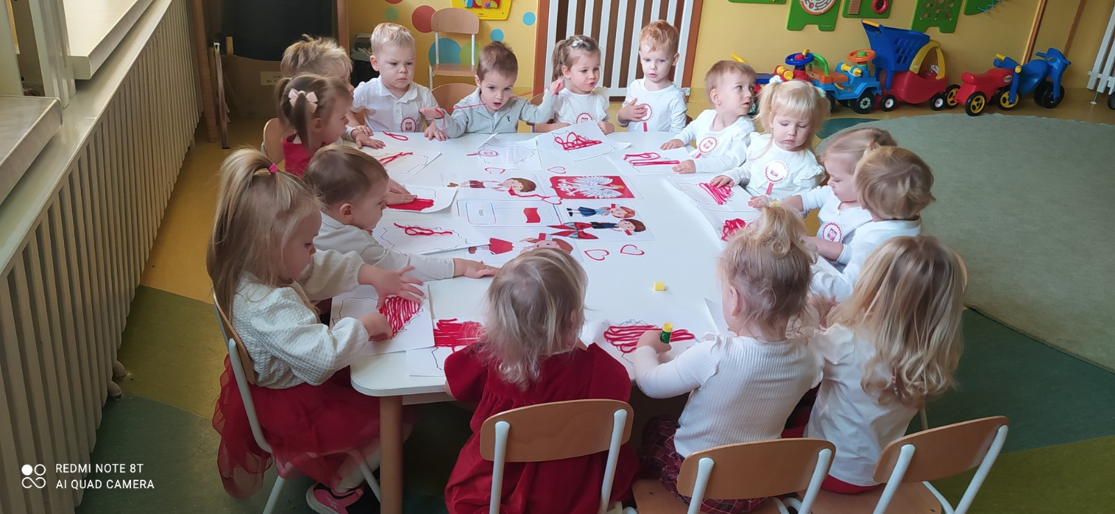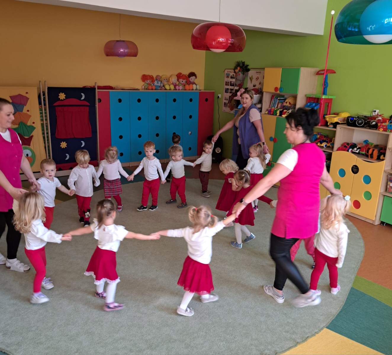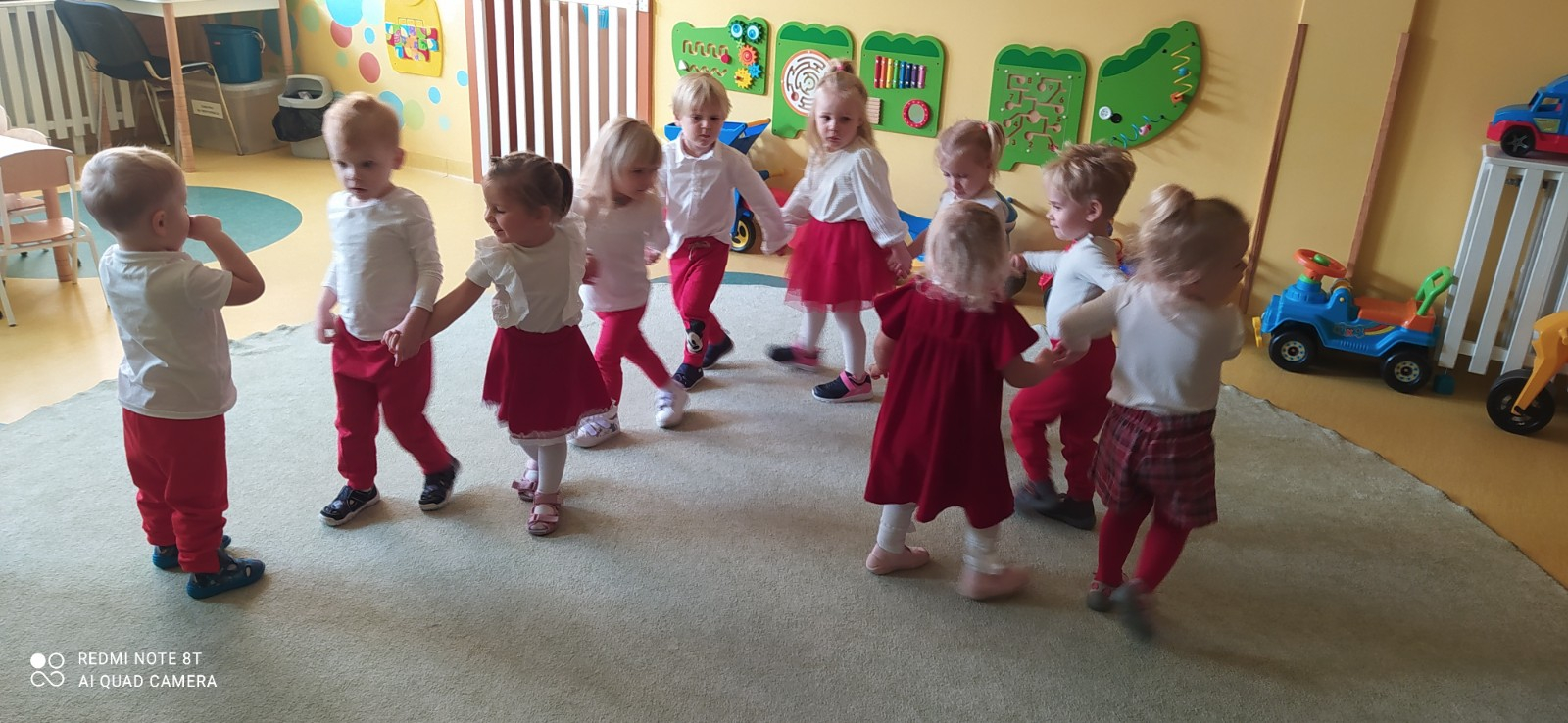 W dniu 7 Listopada 2024 r. obchodziliśmy w naszym Żłobku Święto Niepodległości. W tak ważnym dniu dzieci prezentowały się niezwykle uroczyście w galowych strojach. Podkreślając wagę naszych symboli narodowych: Godła, Flagi, Hymnu oraz znaczenia Ojczyzny w naszym życiu-dzieci wysłuchały Hymn Polski,, Mazurek Dąbrowskiego".Grupa ,, Rybki" wykonała własnoręcznie czerwoną włóczką Flagę Polski imitującą obszar naszego kraju. Było przepięknie, wzruszająco i uroczyście. Wszyscy przeżyli lekcję patriotyzmu i miłości do kraju ojczystego, która na długo pozostanie w pamięci naszych,, Małych Polaków"
