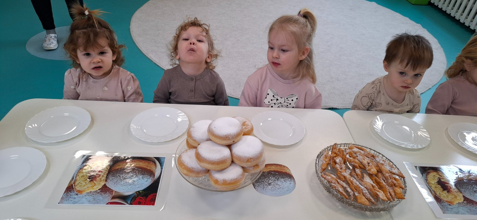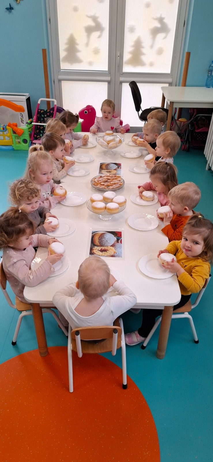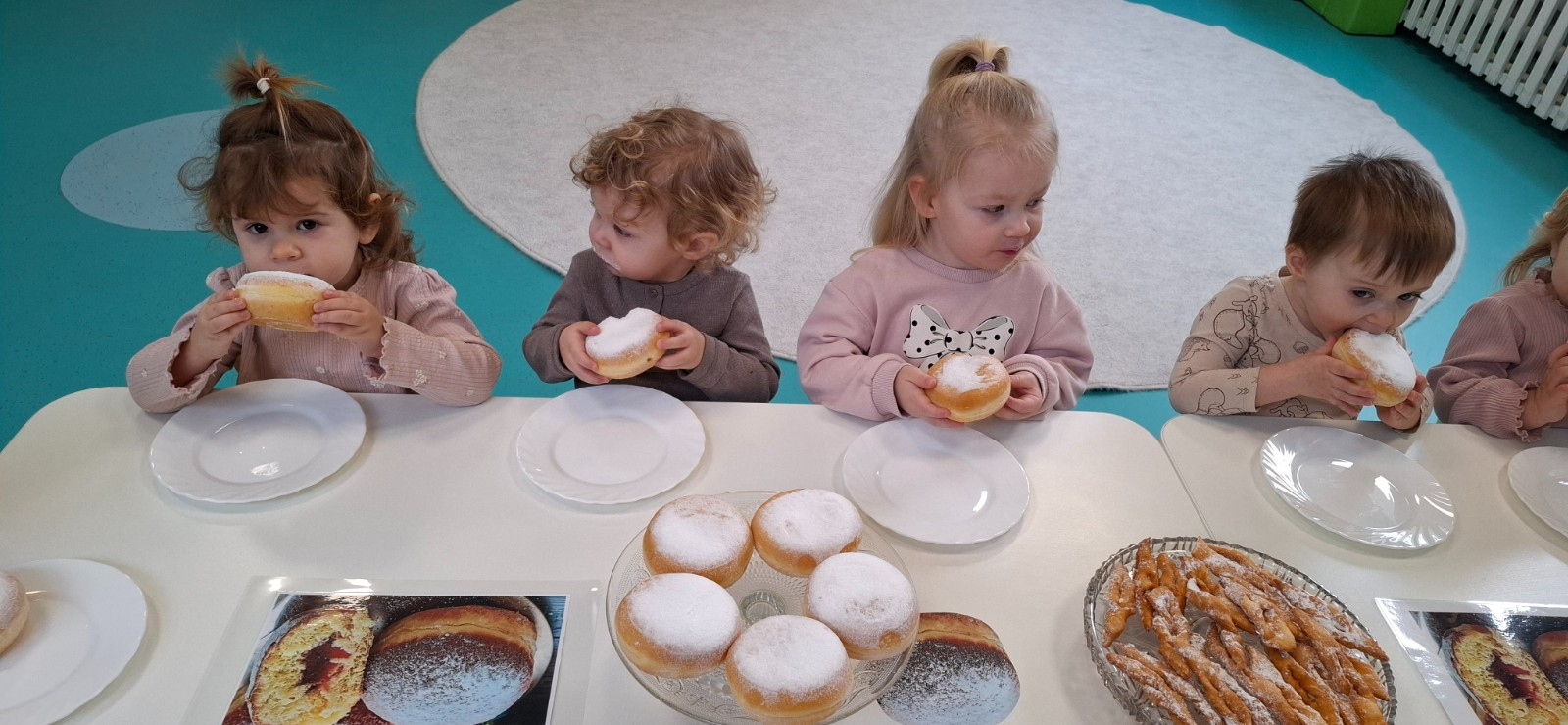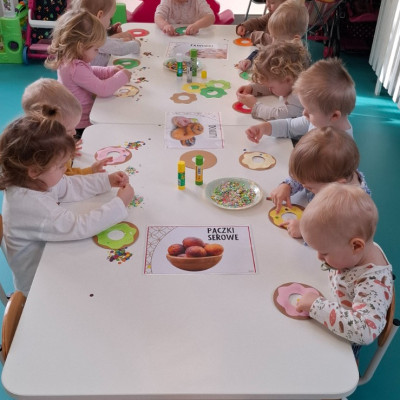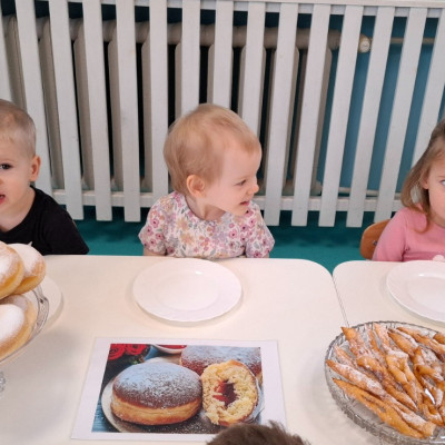W dniu 27 Lutego dzieci z Grupy ,,Żabki" obchodziły,,Tłusty Czwartek".Najważniejszym akcentem w tym dniu były oczywiście pączki oraz faworki.Podczas obchodów tego dnia dzieci poznały tradycje i obrzędy związane z tym zwyczajem.Uczestniczyły w różnych zabawach z pączkami,faworkami i donutami w roli głównej.W ramach zajęć plastycznych dzieci wykonały apetycznie wyglądające donuty. Dzieci dowiedziały się również z czego i jak wypieka się pączki oraz faworki.Wszyscy z wielkim apetytem zajadali smaczne pączki.Były pyszne co widać było po uśmiechniętych buziach naszych dzieciaczków.