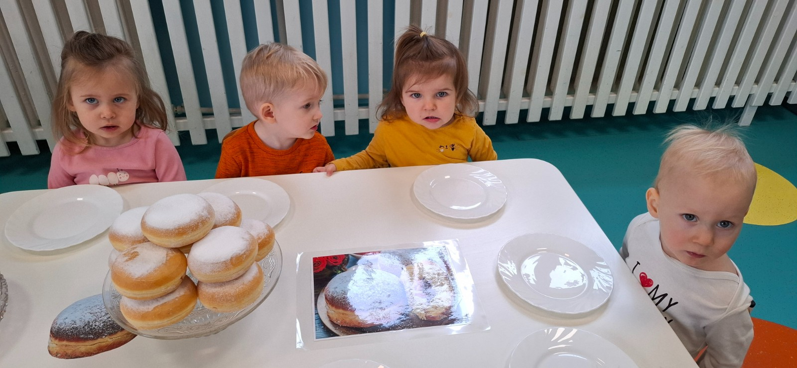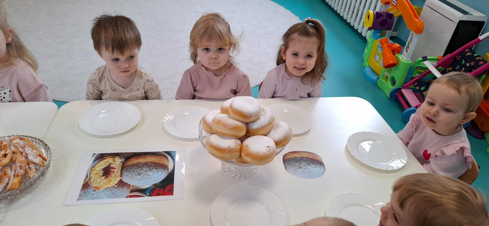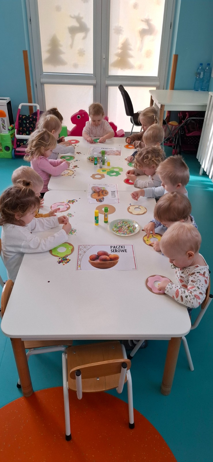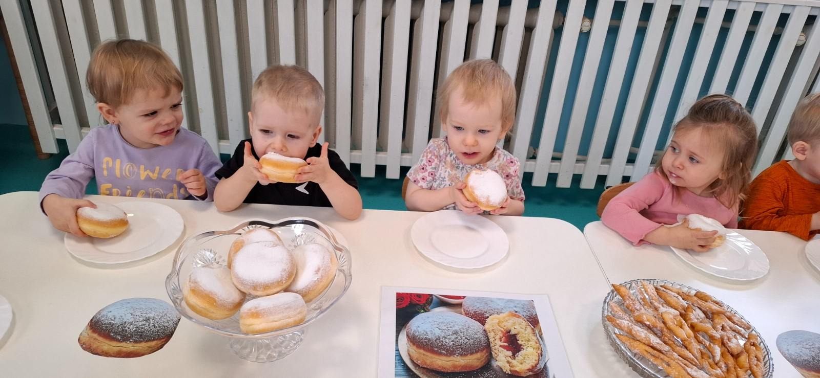 W dniu 27 Lutego dzieci z Grupy ,,Żabki" obchodziły,,Tłusty Czwartek".Najważniejszym akcentem w tym dniu były oczywiście pączki oraz faworki.Podczas obchodów tego dnia dzieci poznały tradycje i obrzędy związane z tym zwyczajem.Uczestniczyły w różnych zabawach z pączkami,faworkami i donutami w roli głównej.W ramach zajęć plastycznych dzieci wykonały apetycznie wyglądające donuty. Dzieci dowiedziały się również z czego i jak wypieka się pączki oraz faworki.Wszyscy z wielkim apetytem zajadali smaczne pączki.Były pyszne co widać było po uśmiechniętych buziach naszych dzieciaczków.