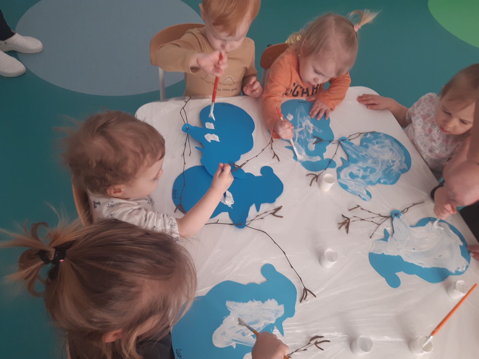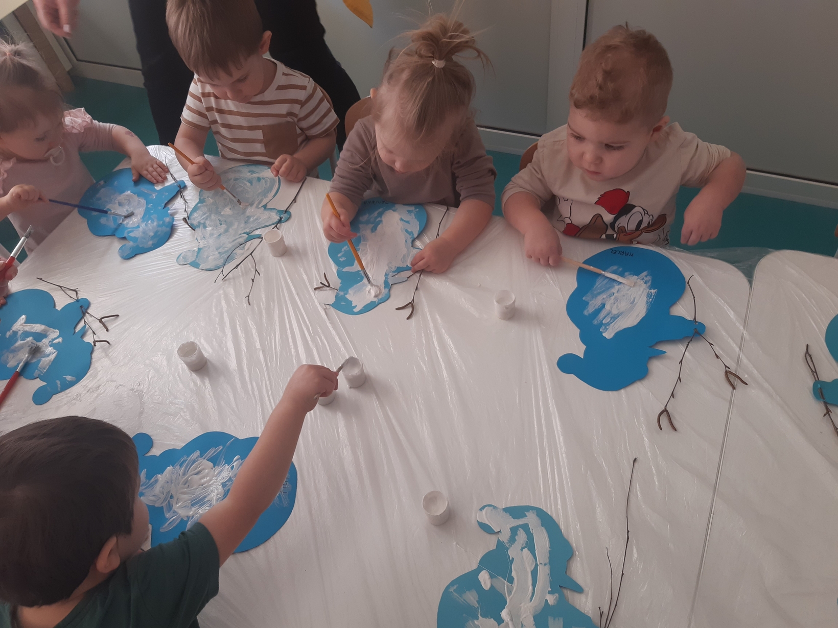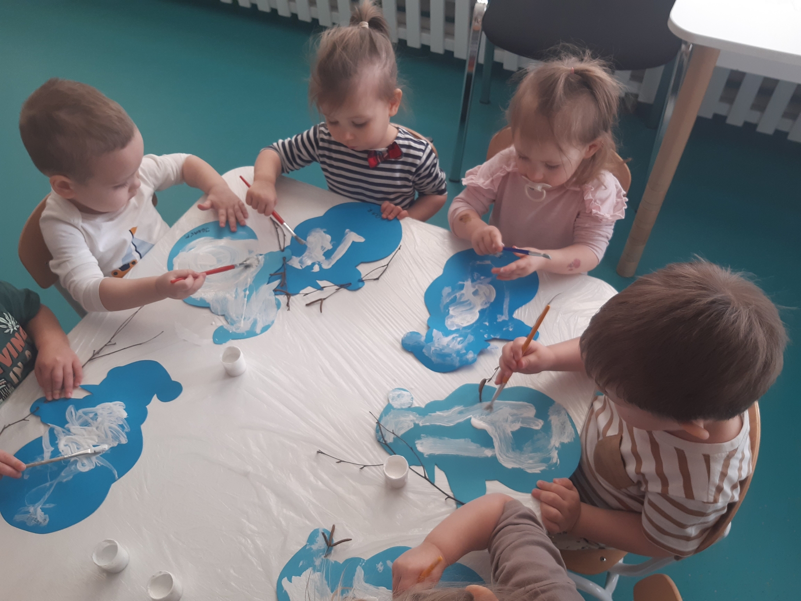 Do wykonania tej pracy dzieci wykorzystały białą farbę oraz pędzelki.