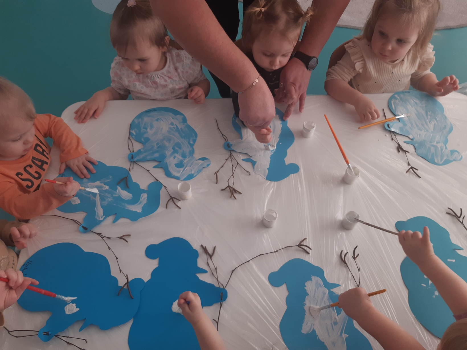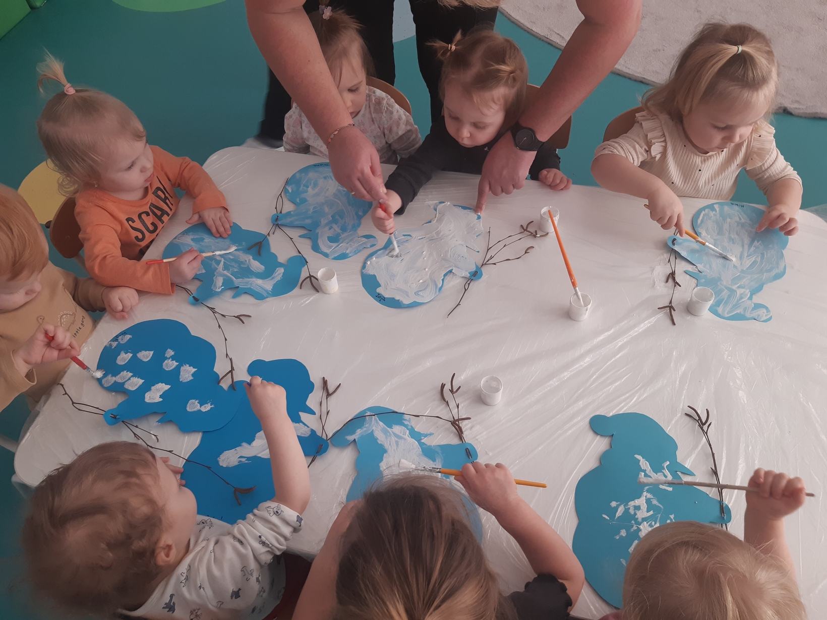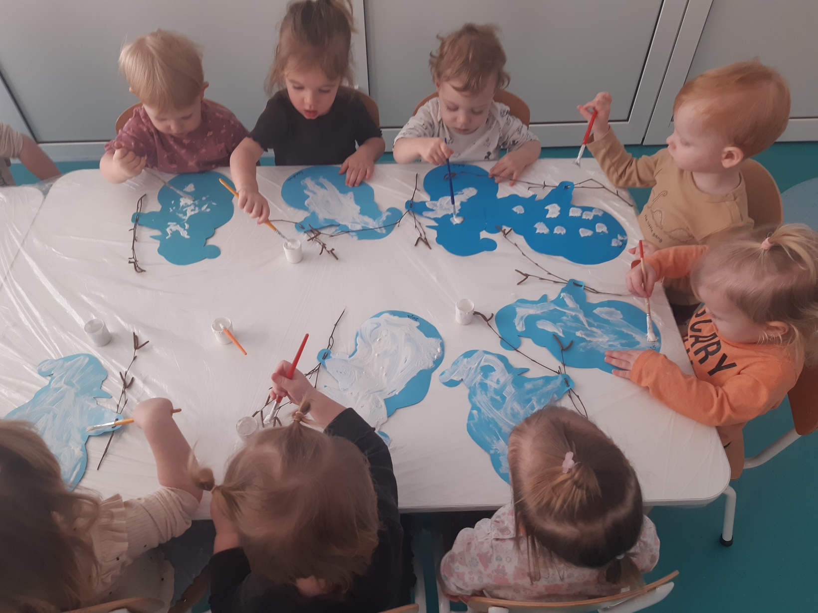 Do wykonania tej pracy dzieci wykorzystały białą farbę oraz pędzelki.