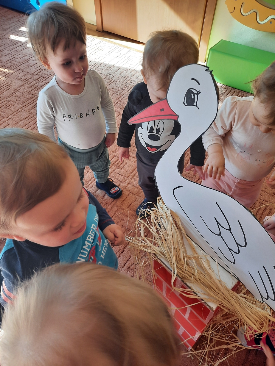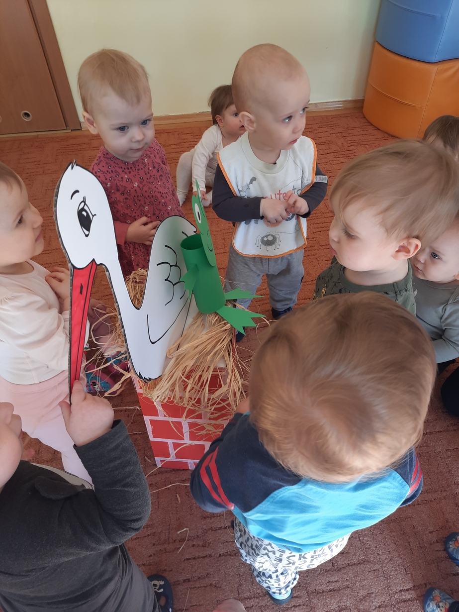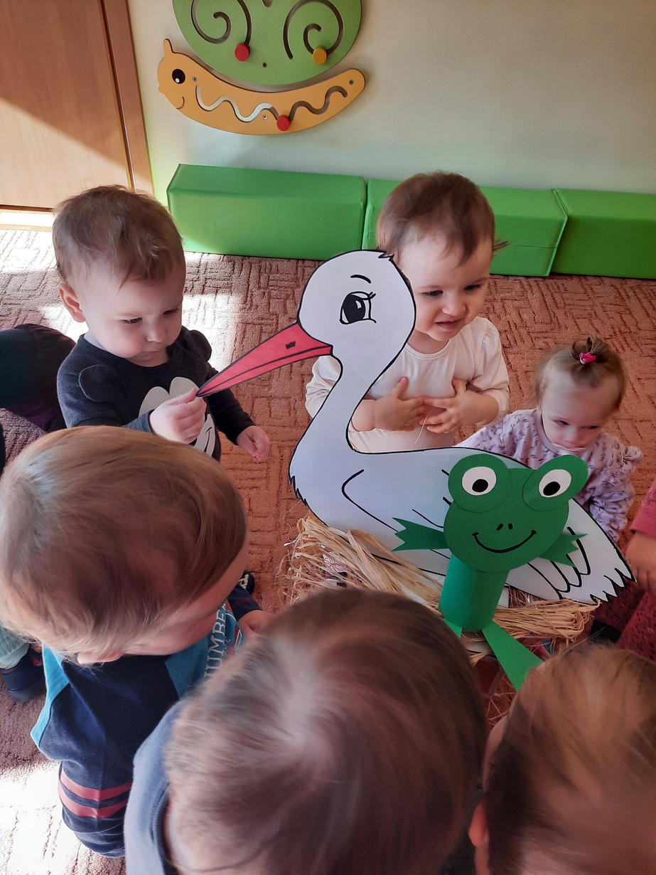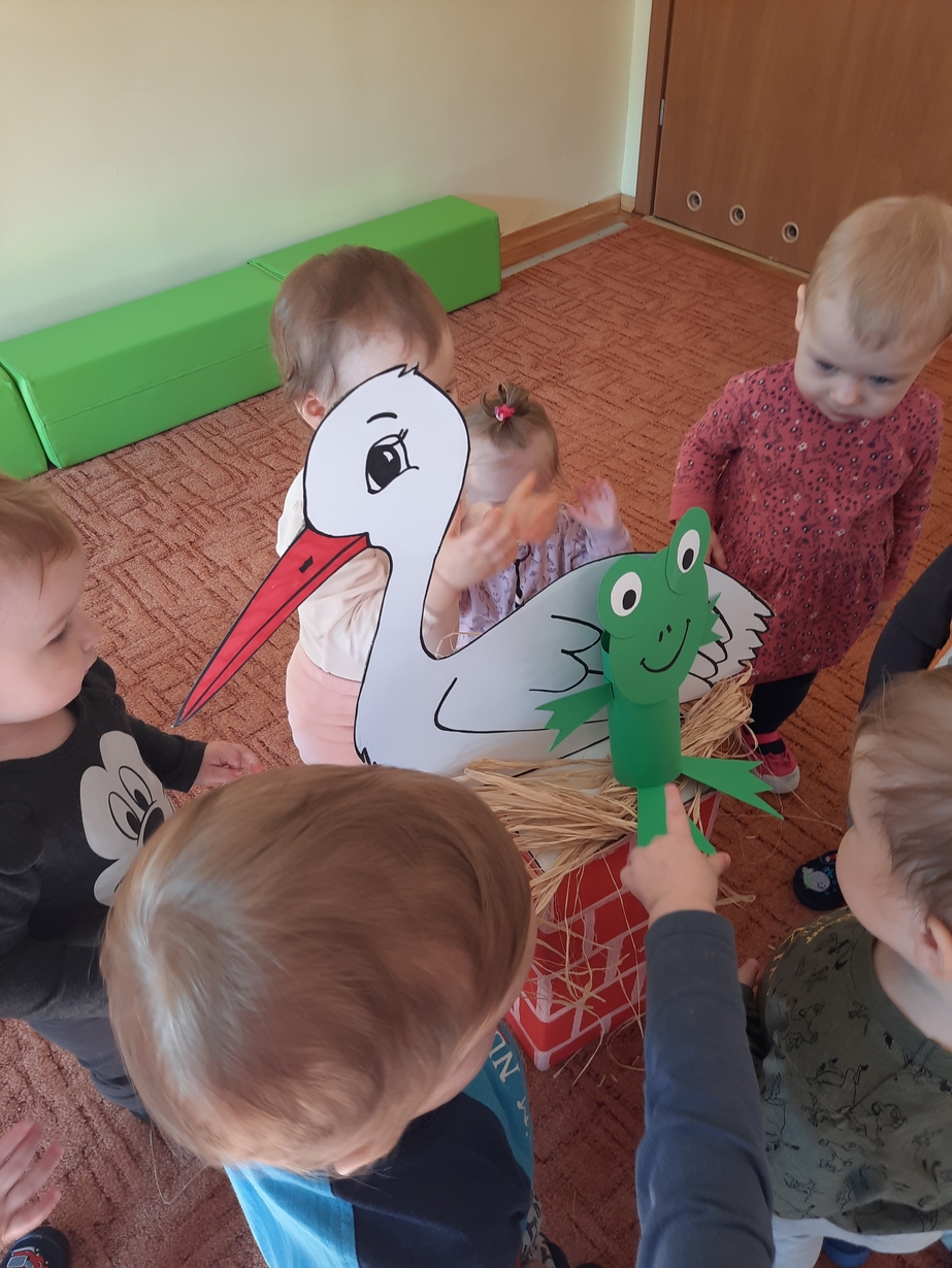 U maluszków pojawił się bocian i żabka,dzieciaczki bardzo chętnie pomagały zrobić gniazdko oraz stawik.