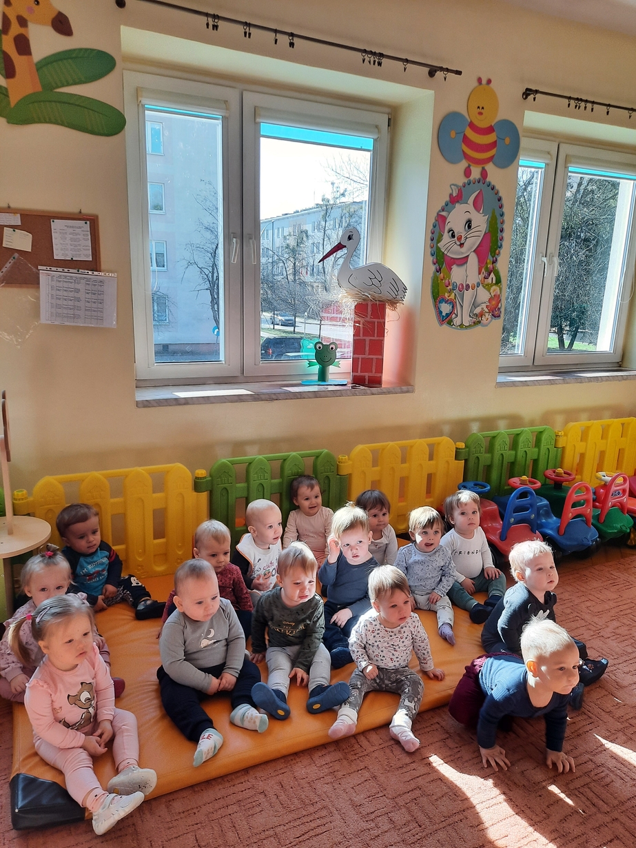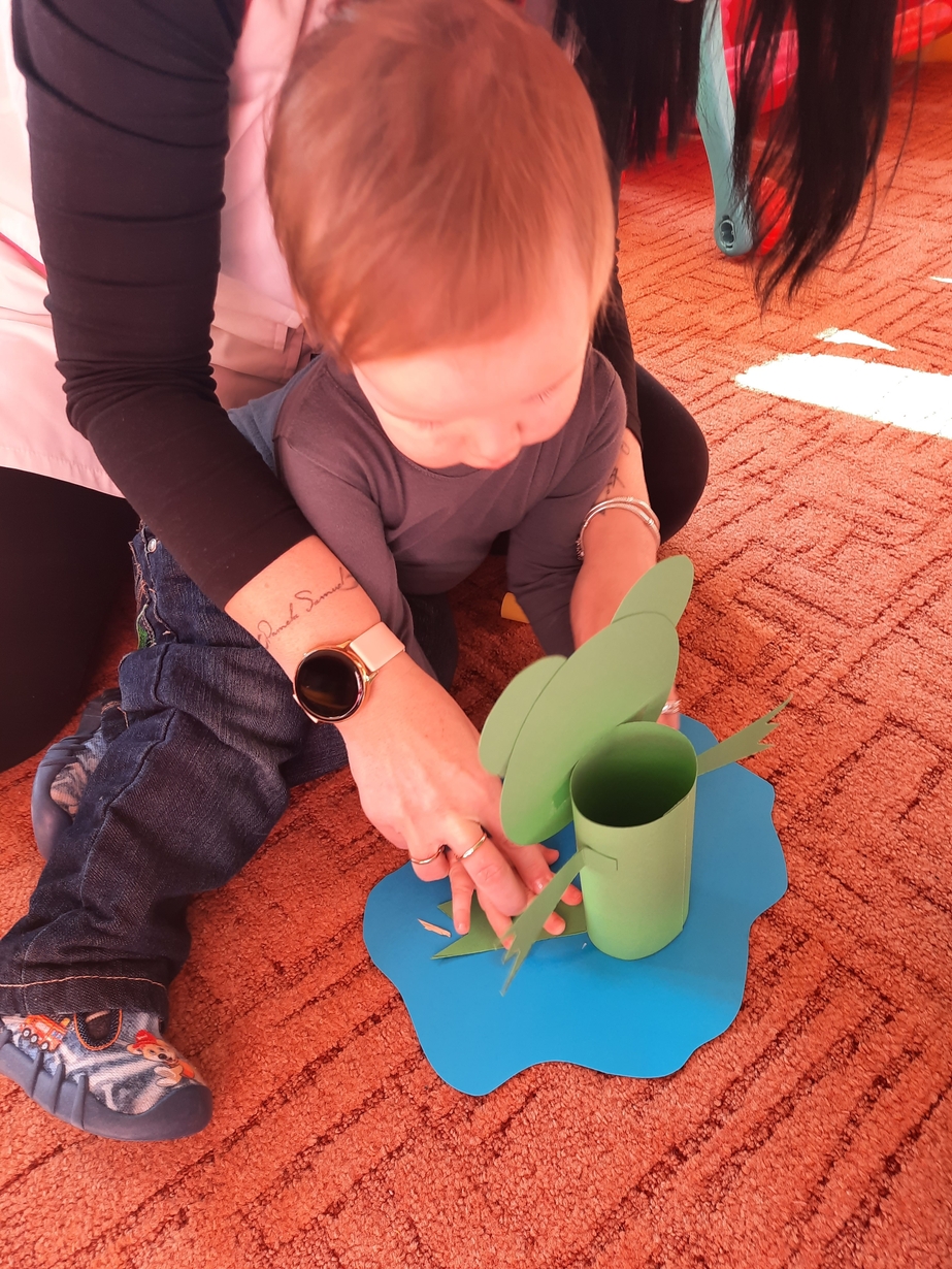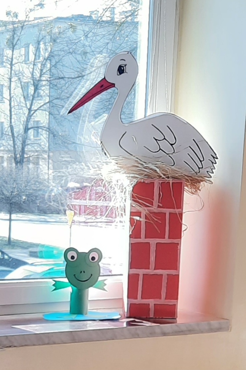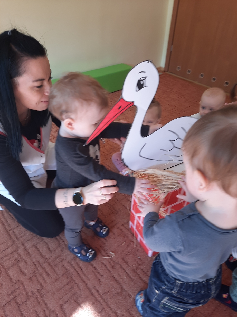 U maluszków pojawił się bocian i żabka,dzieciaczki bardzo chętnie pomagały zrobić gniazdko oraz stawik.