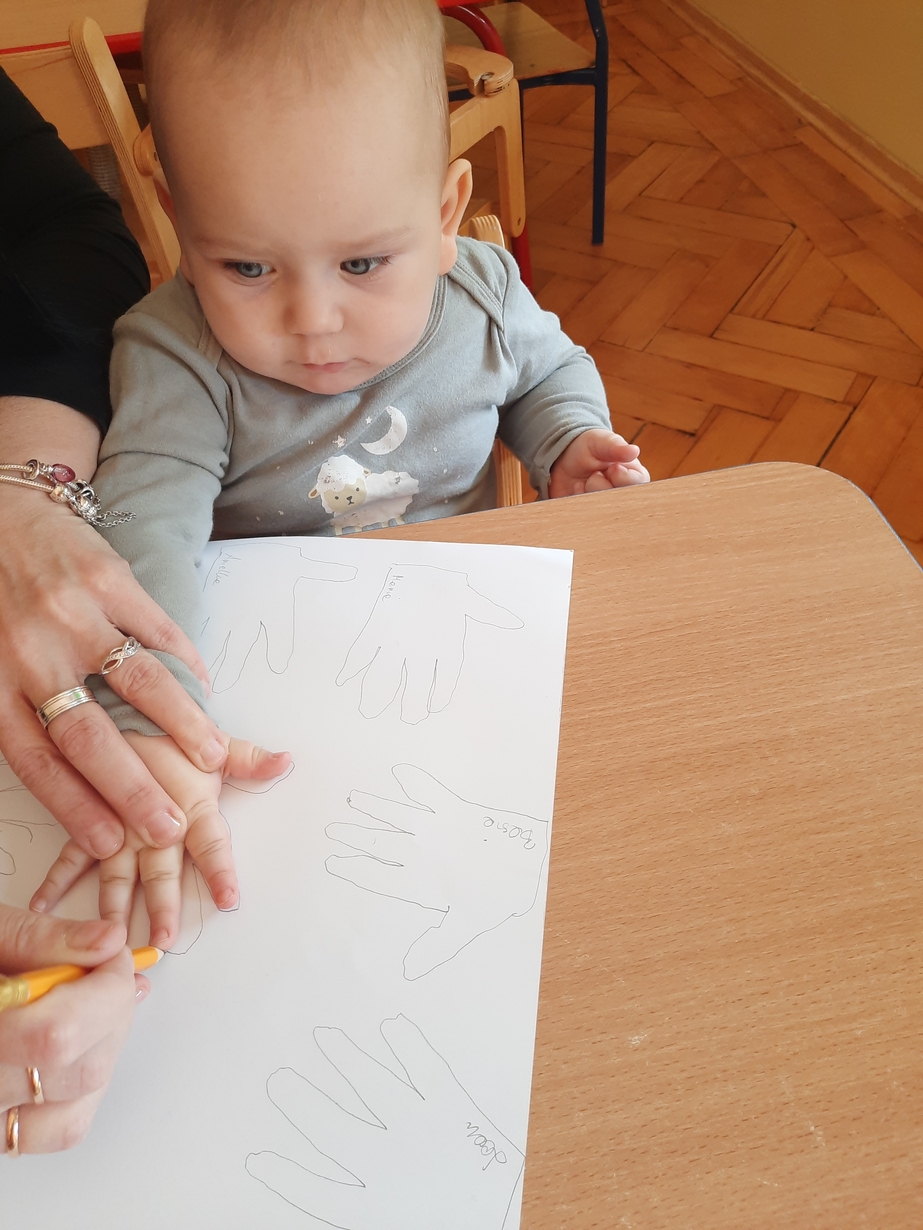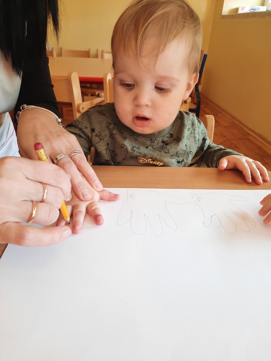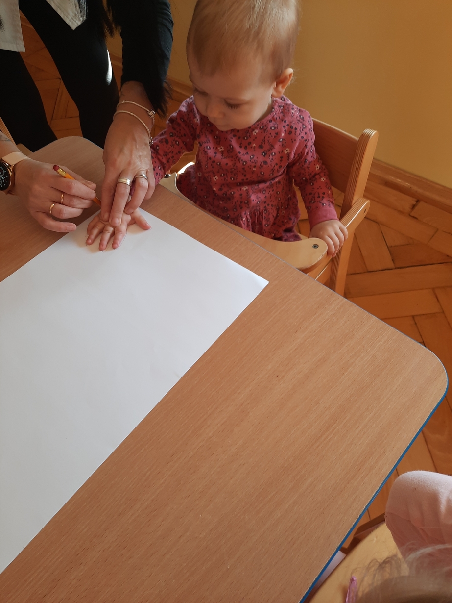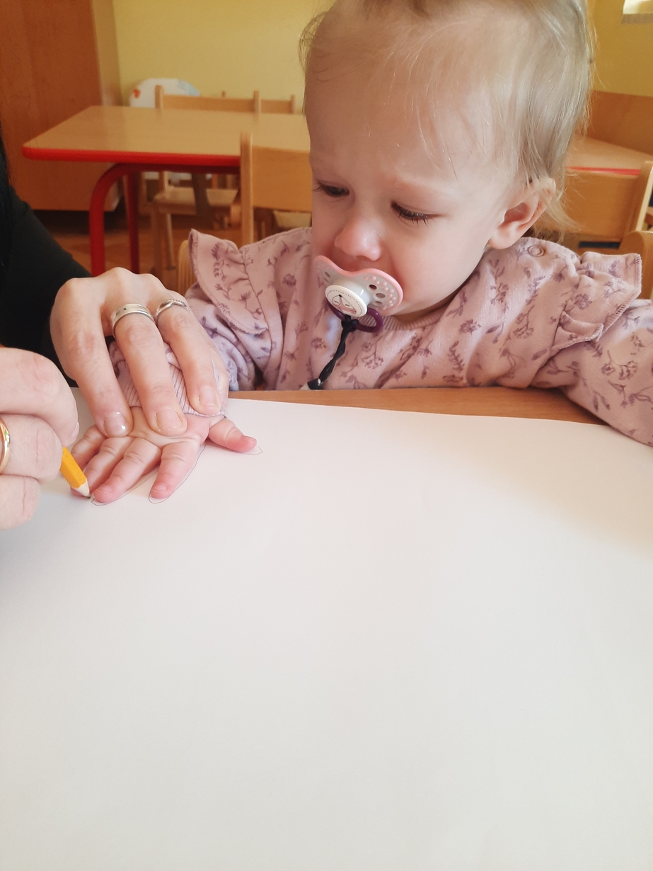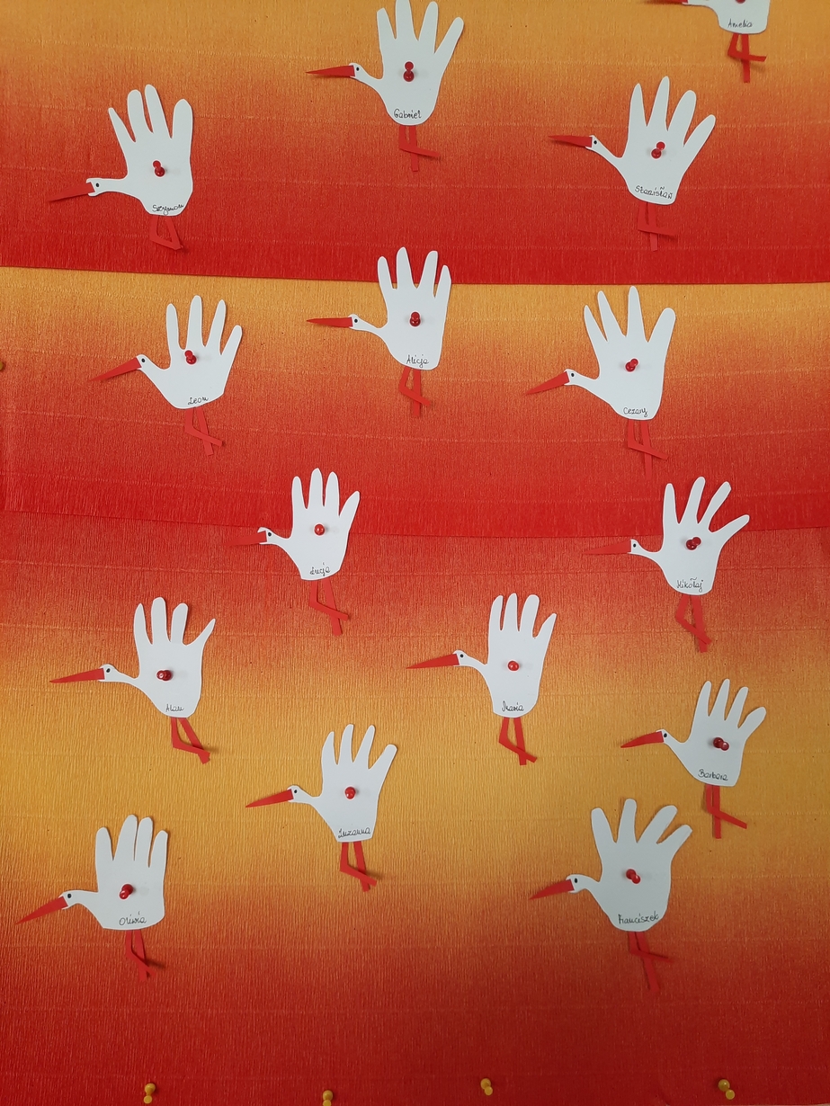 Fajna zabawa była też przy odrysowywaniu malutkich rączek :czary -mary i powstały malutkie bociany.