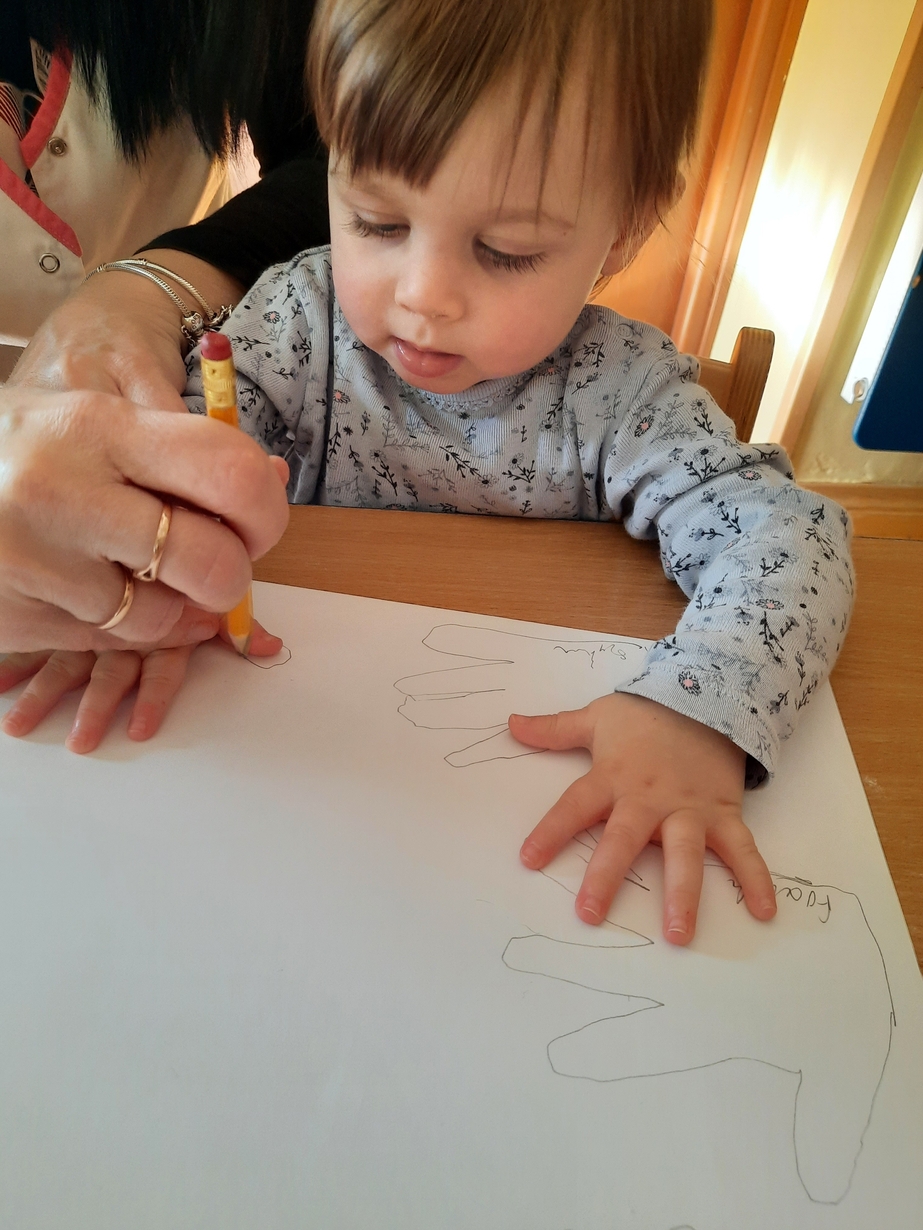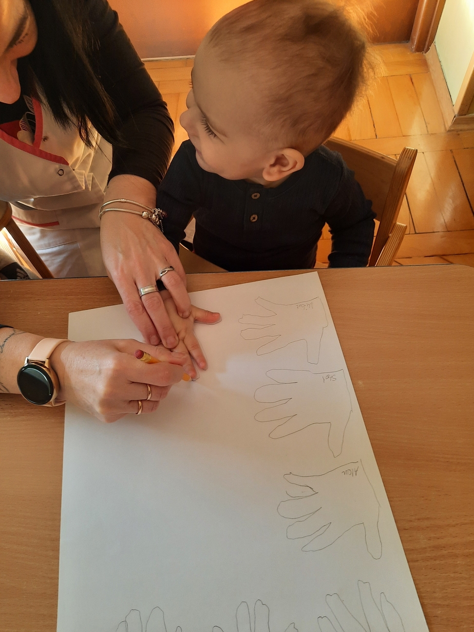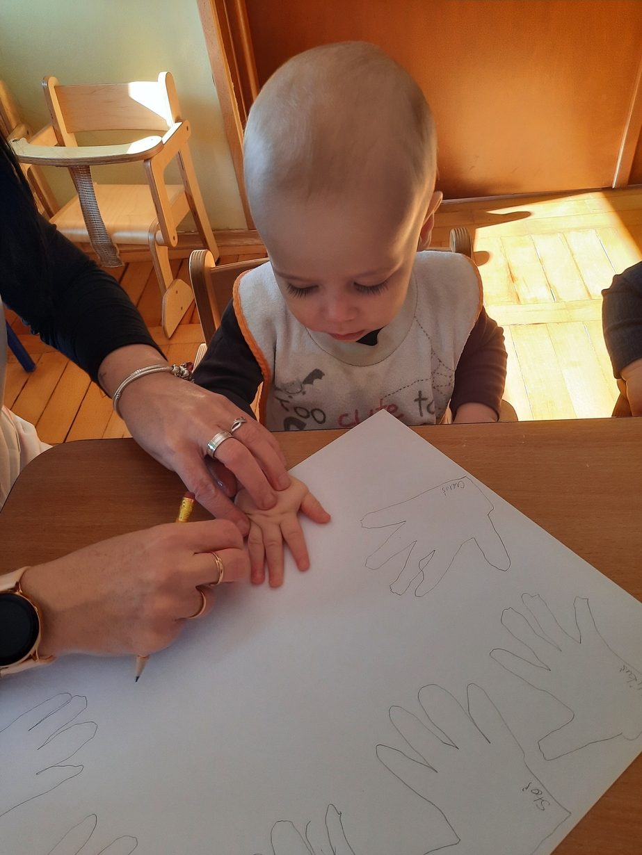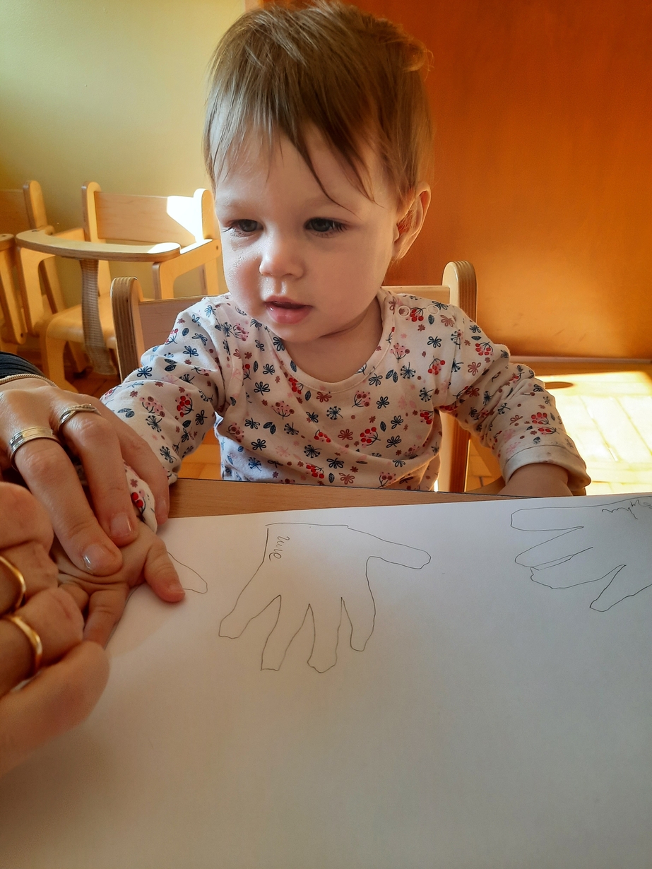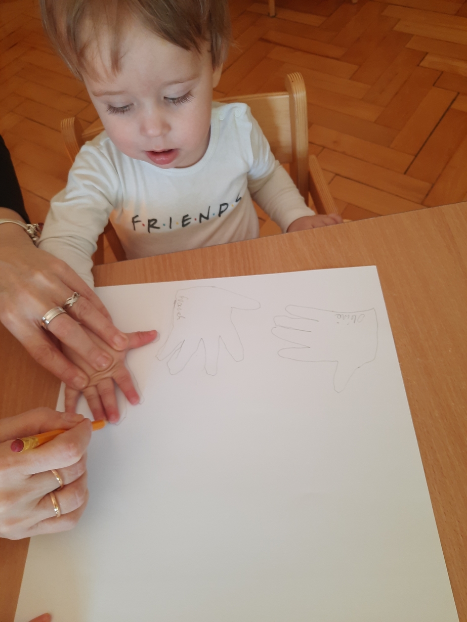 Fajna zabawa była też przy odrysowywaniu malutkich rączek :czary -mary i powstały malutkie bociany.