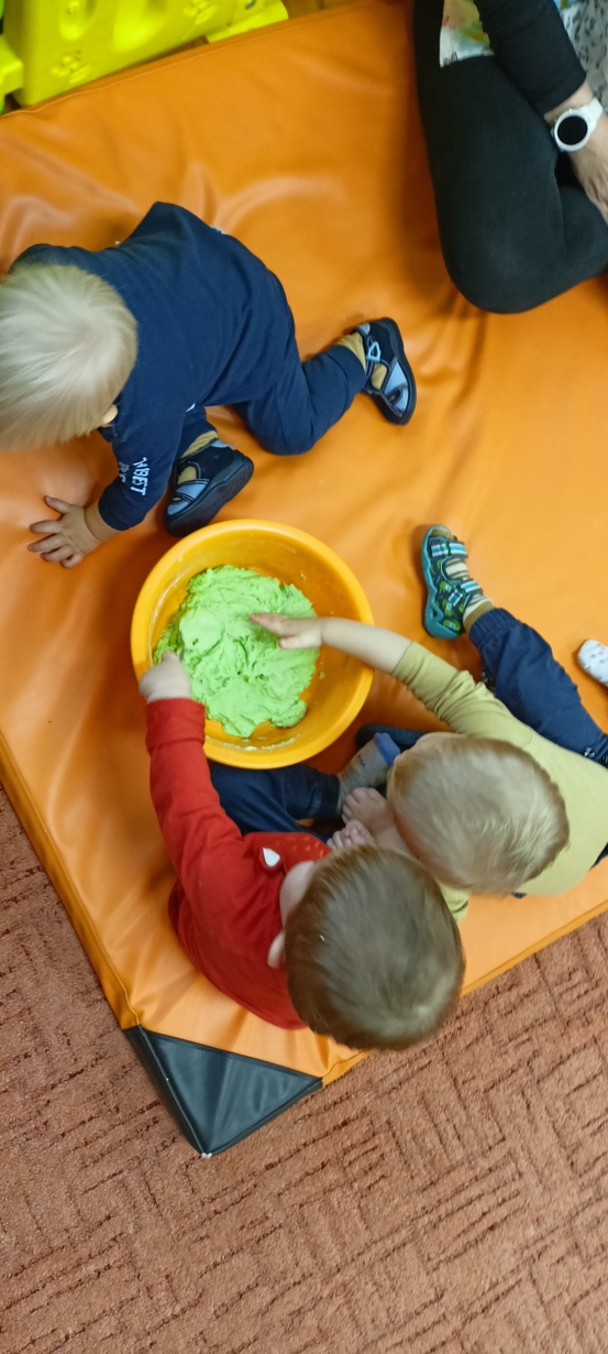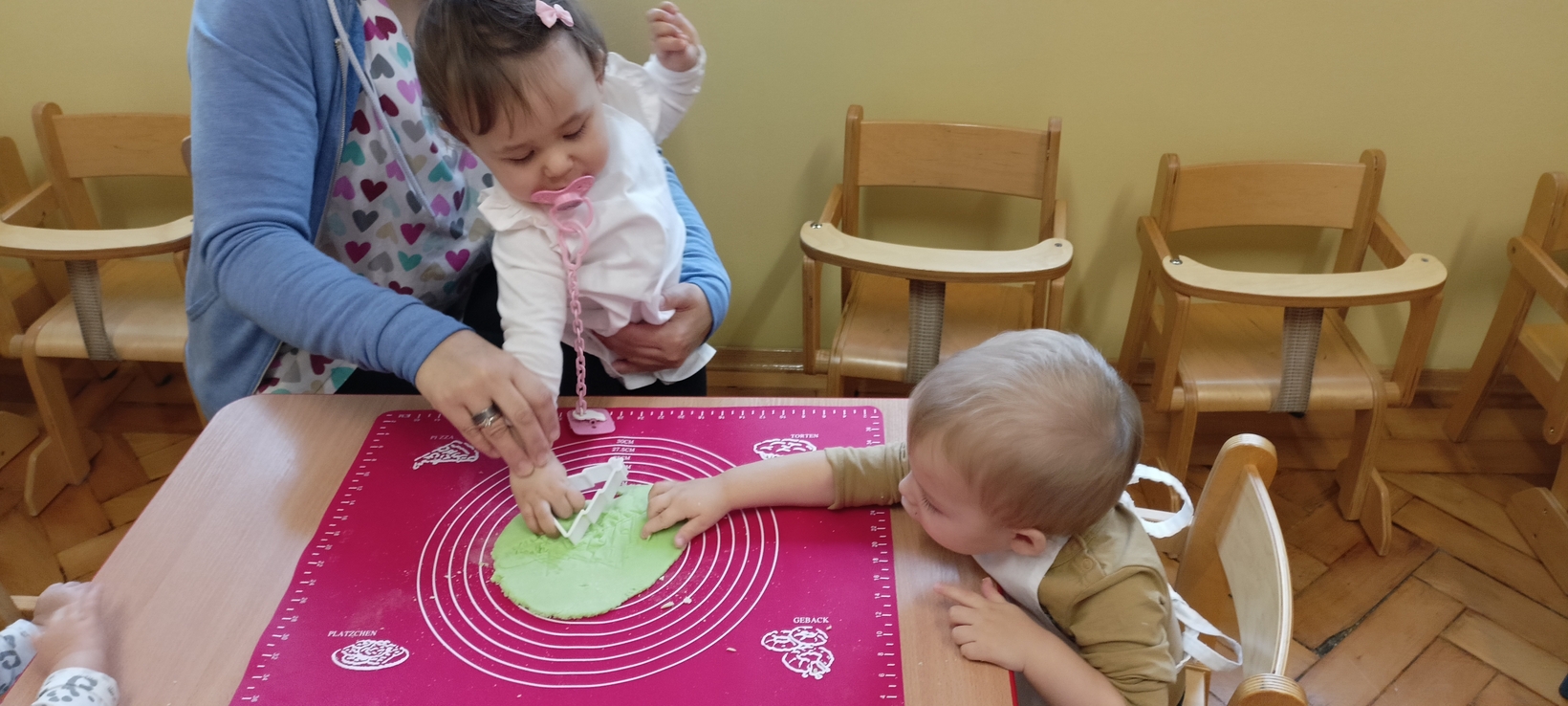 Nasze Biedroneczki tym razem uczestniczyły w tworzeniu masy solnej. Dzieci w raz z ciociami mieszały, ugniatały i lepiły rączkami. Była to doskonała zabawa pobudzająca zmysł dotyku, oraz koordynację wzrokowo-ruchową. Dzisiaj w wersji świątecznej maluszki wykrywały świąteczne choineczki.