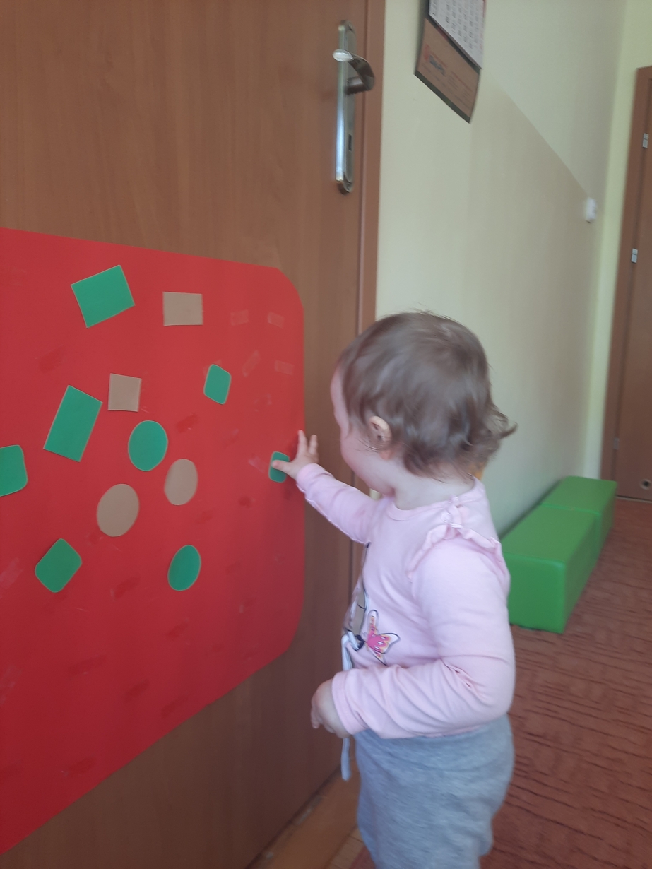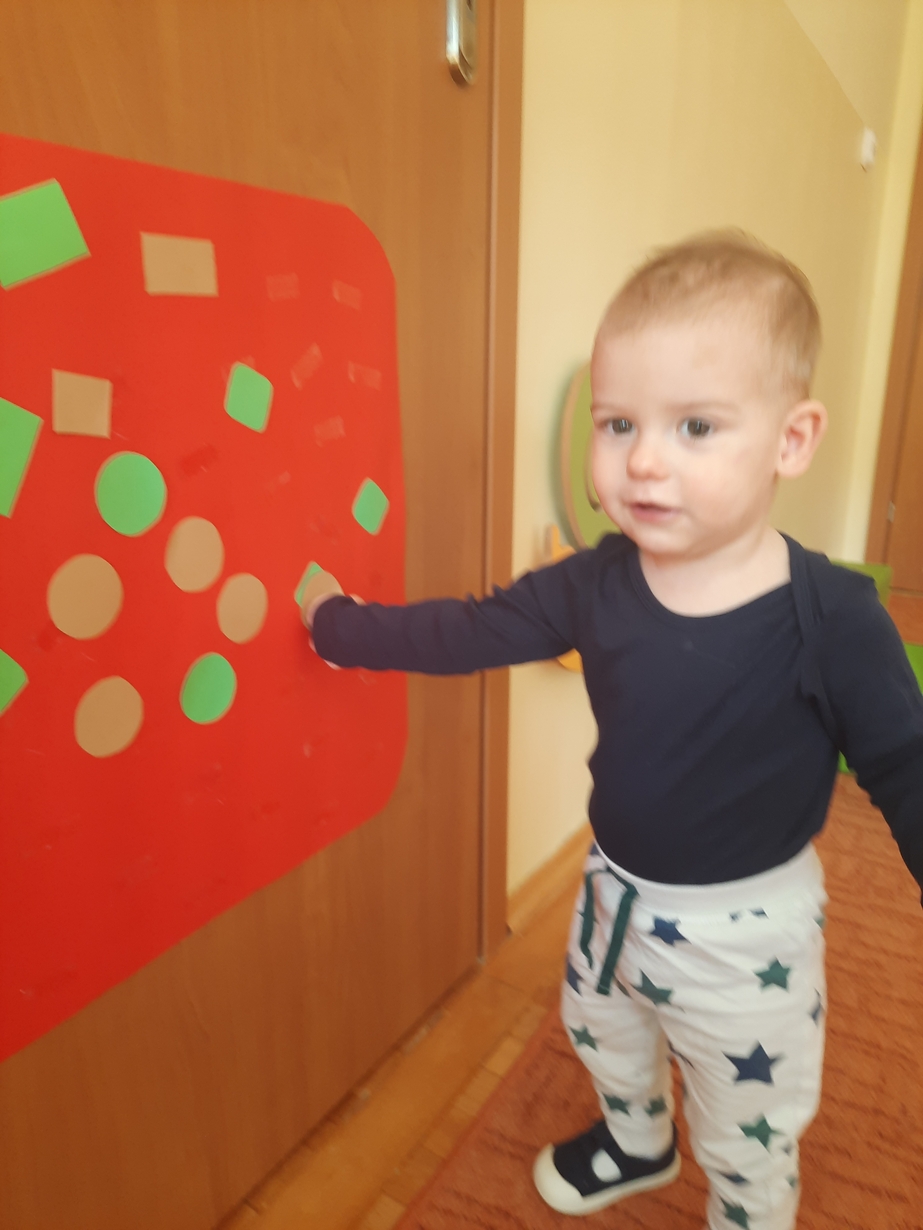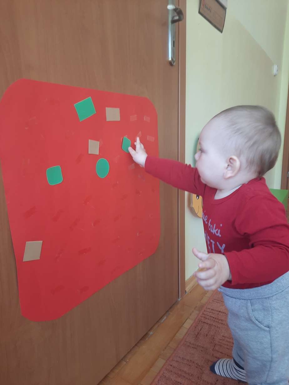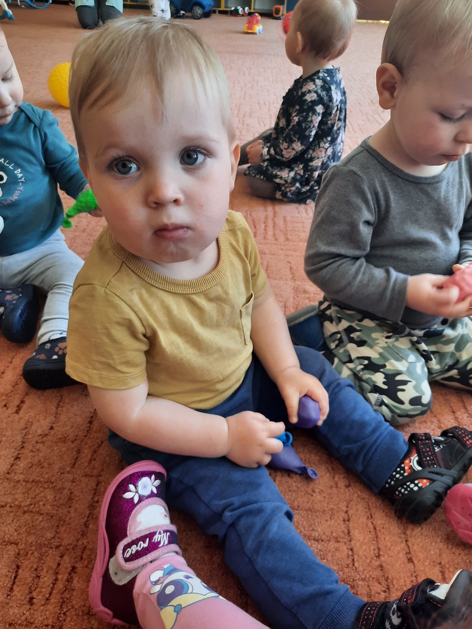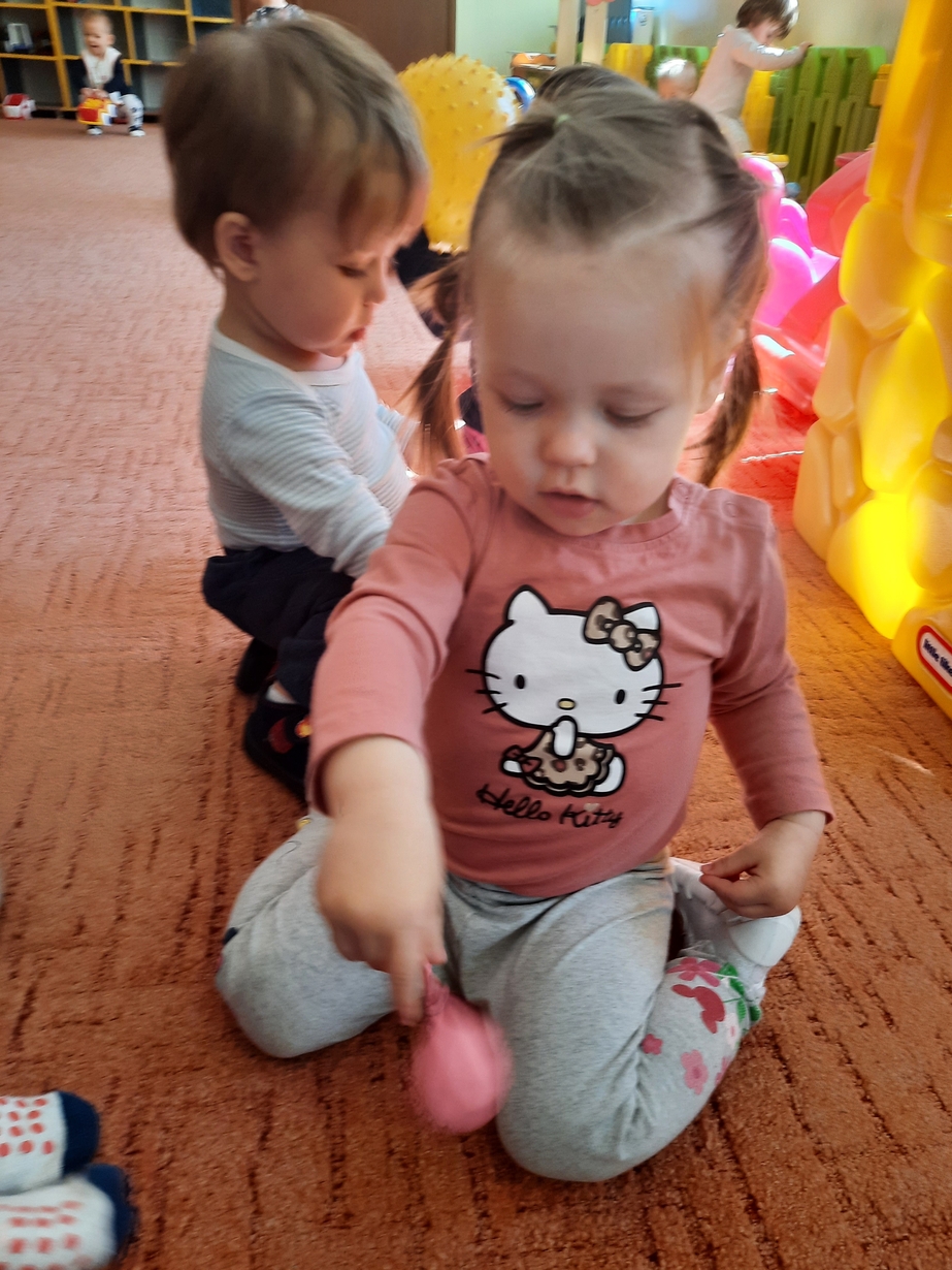 Naśladowały gesty opiekunek do wierszyka ,,Tu sroczka", liczyliśmy wspólnie paluszki, a na koniec dzieci przyklejały na tablicę różne kształty wycięte z papieru, a baloniki wypełnione kuleczkami, mąką, kaszą oraz grochem w rączkach dzieci były dobrym ćwiczeniem zmysłu dotyku. Biedroneczki spisały się na medal?