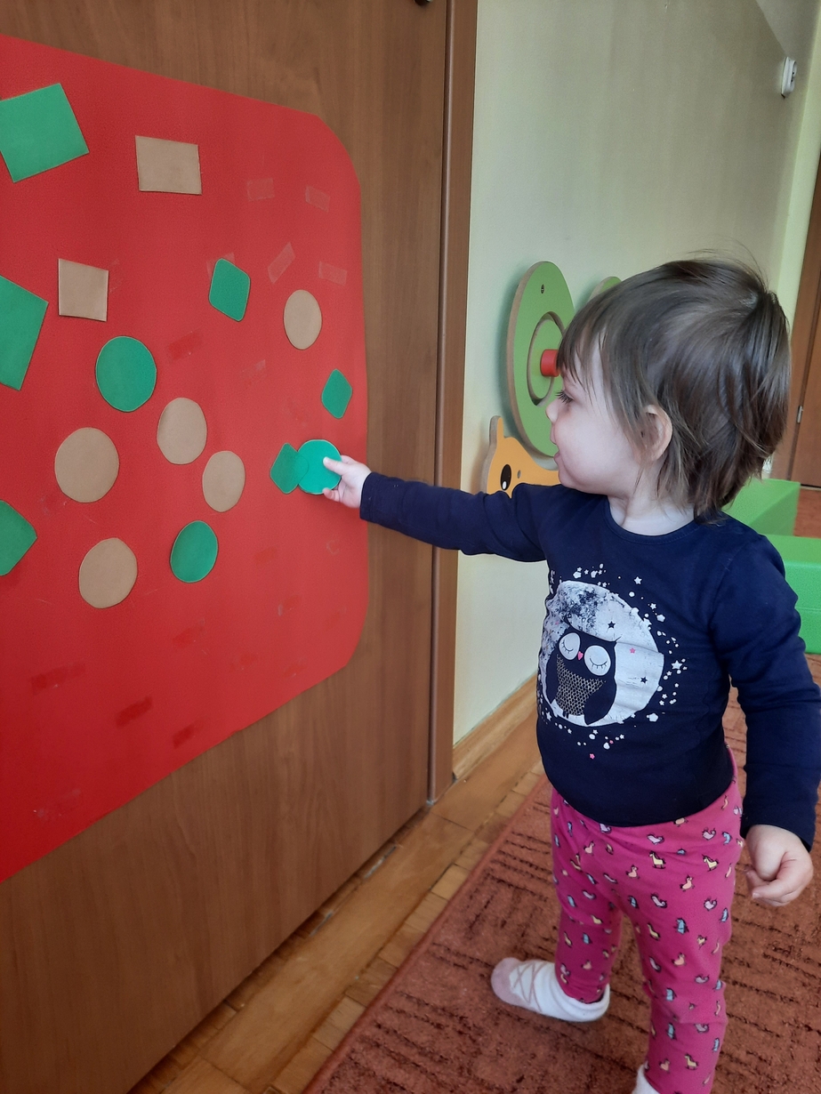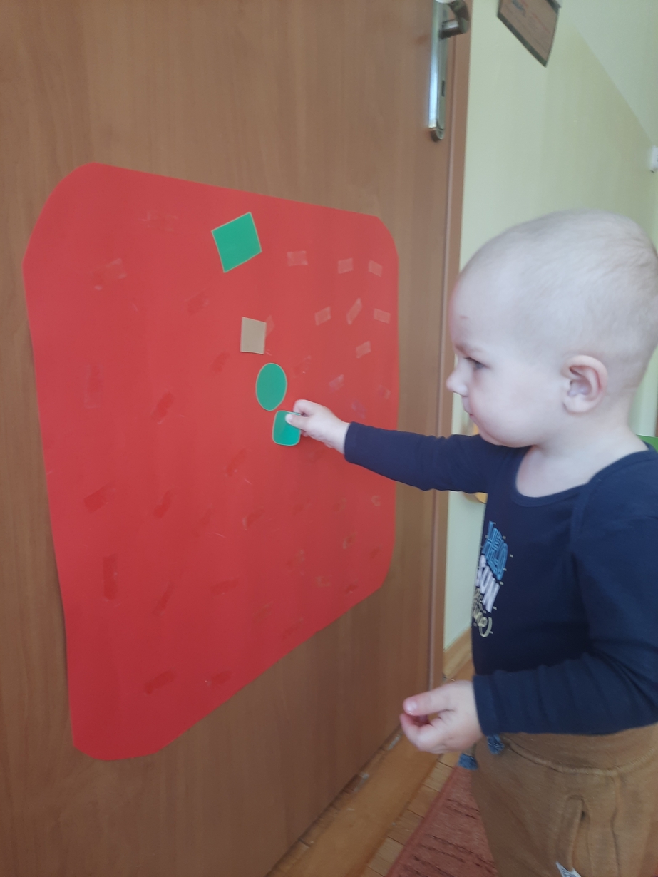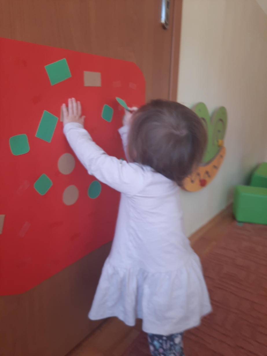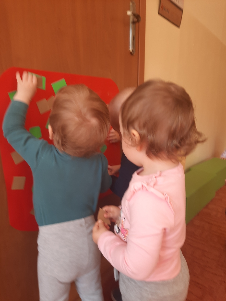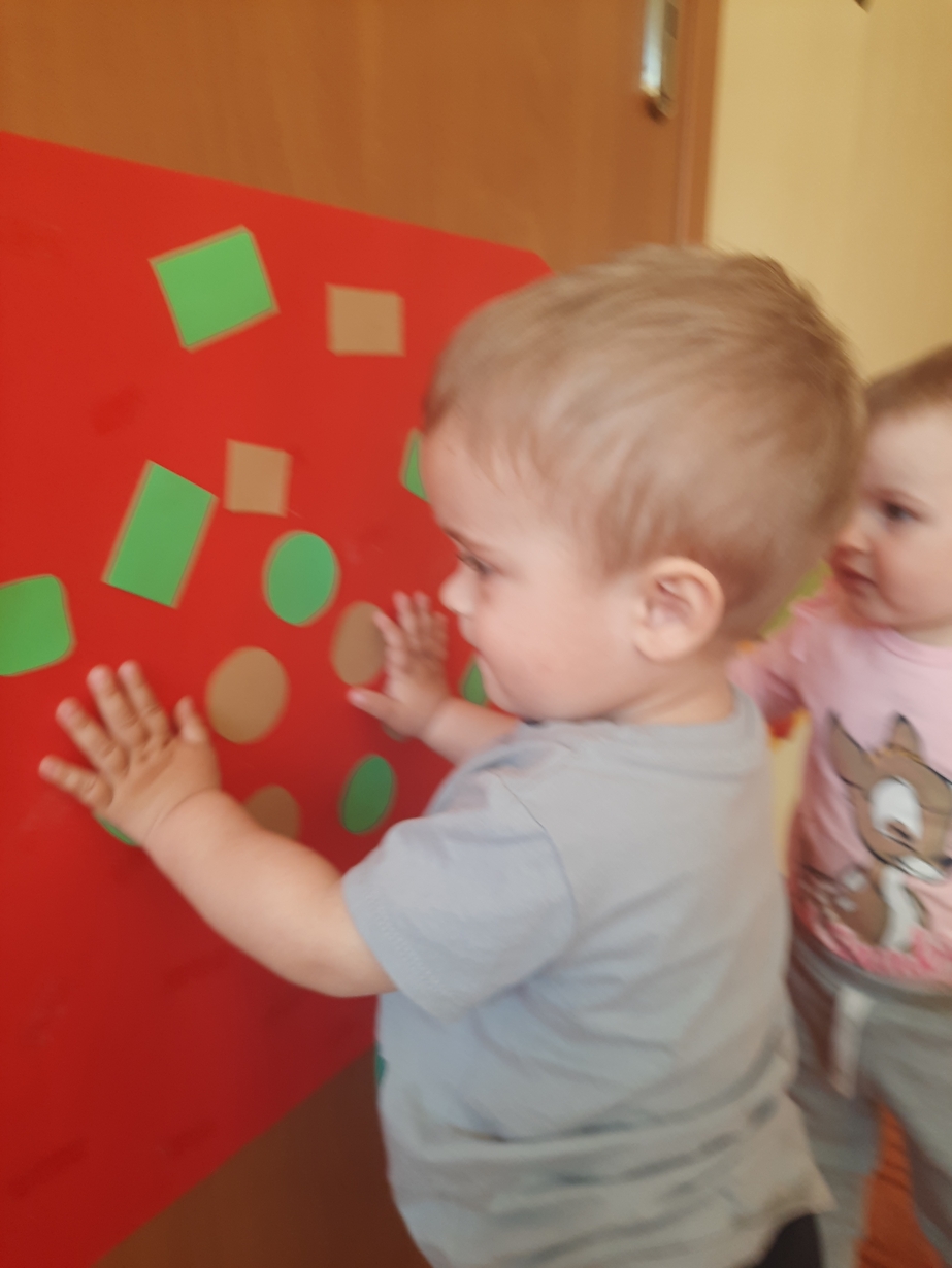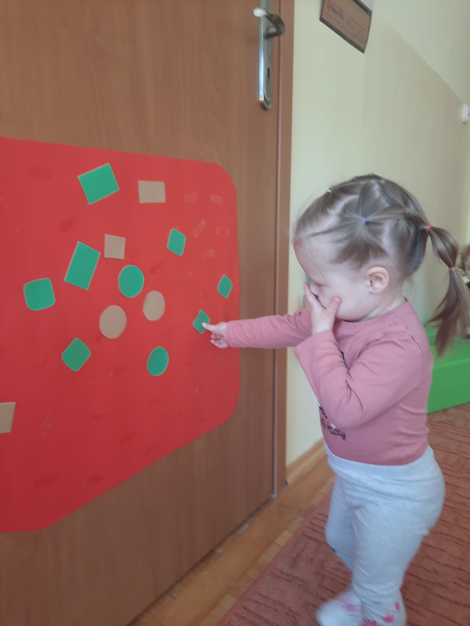 Naśladowały gesty opiekunek do wierszyka ,,Tu sroczka", liczyliśmy wspólnie paluszki, a na koniec dzieci przyklejały na tablicę różne kształty wycięte z papieru, a baloniki wypełnione kuleczkami, mąką, kaszą oraz grochem w rączkach dzieci były dobrym ćwiczeniem zmysłu dotyku. Biedroneczki spisały się na medal?