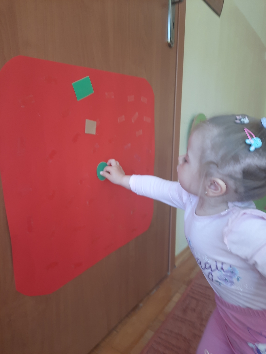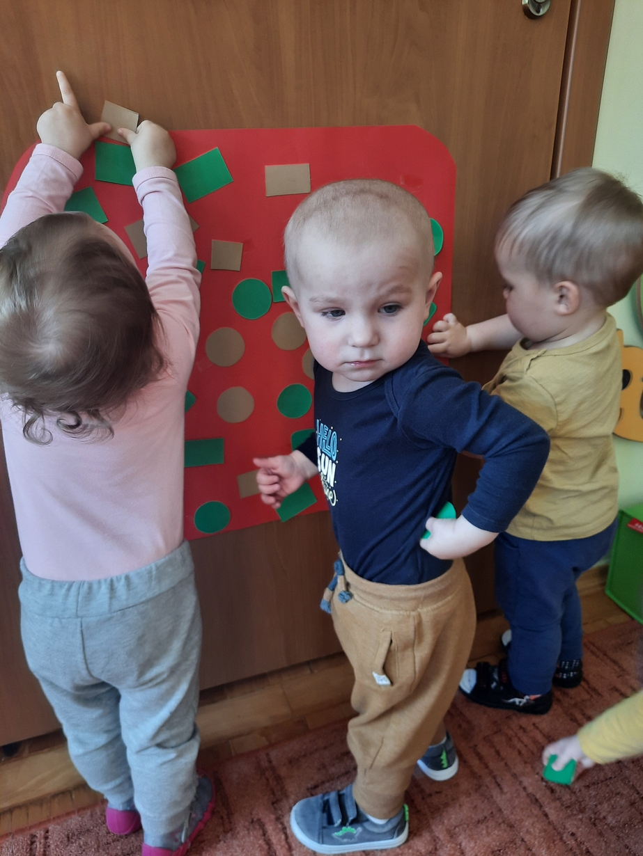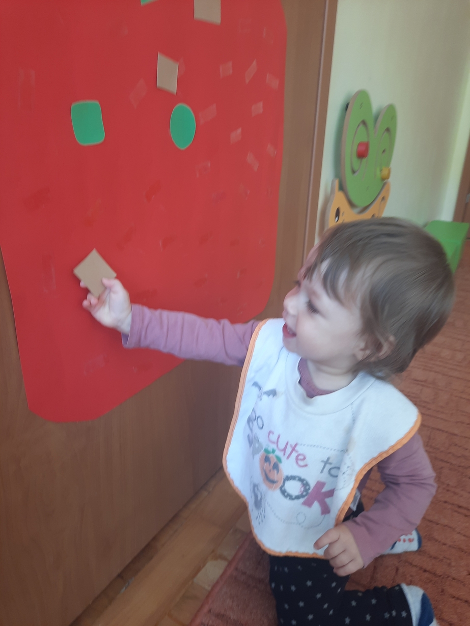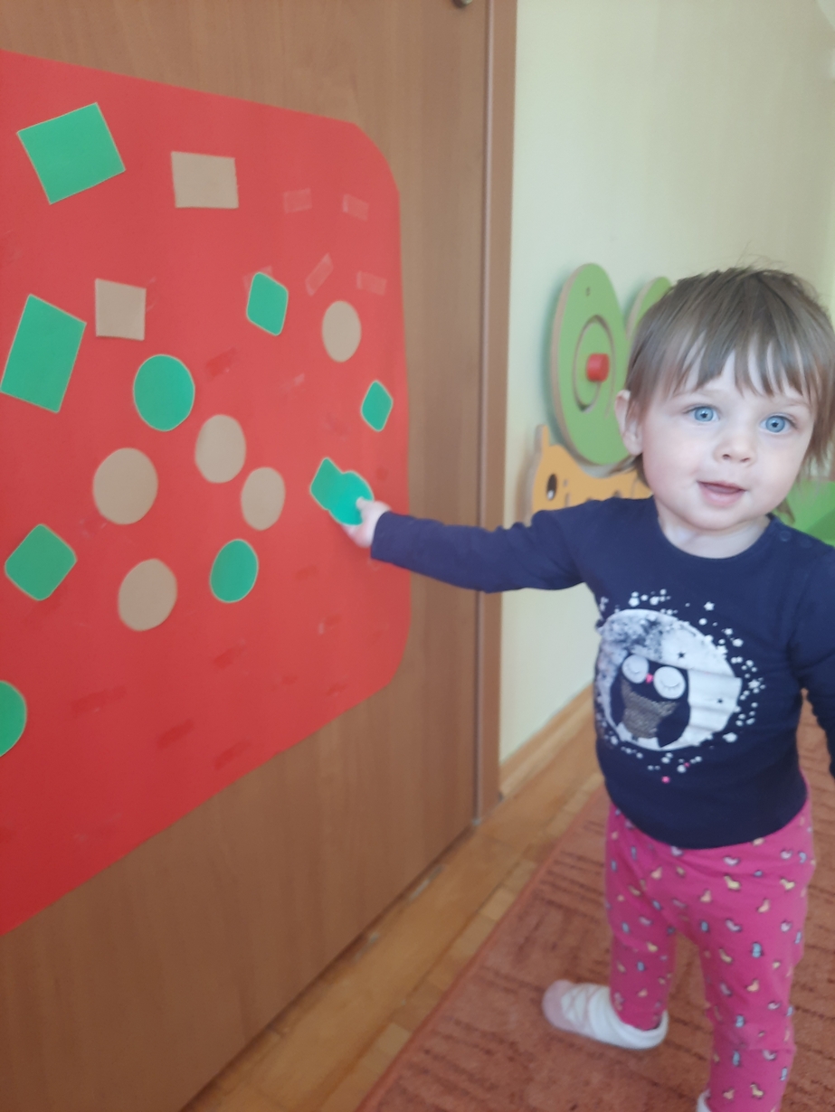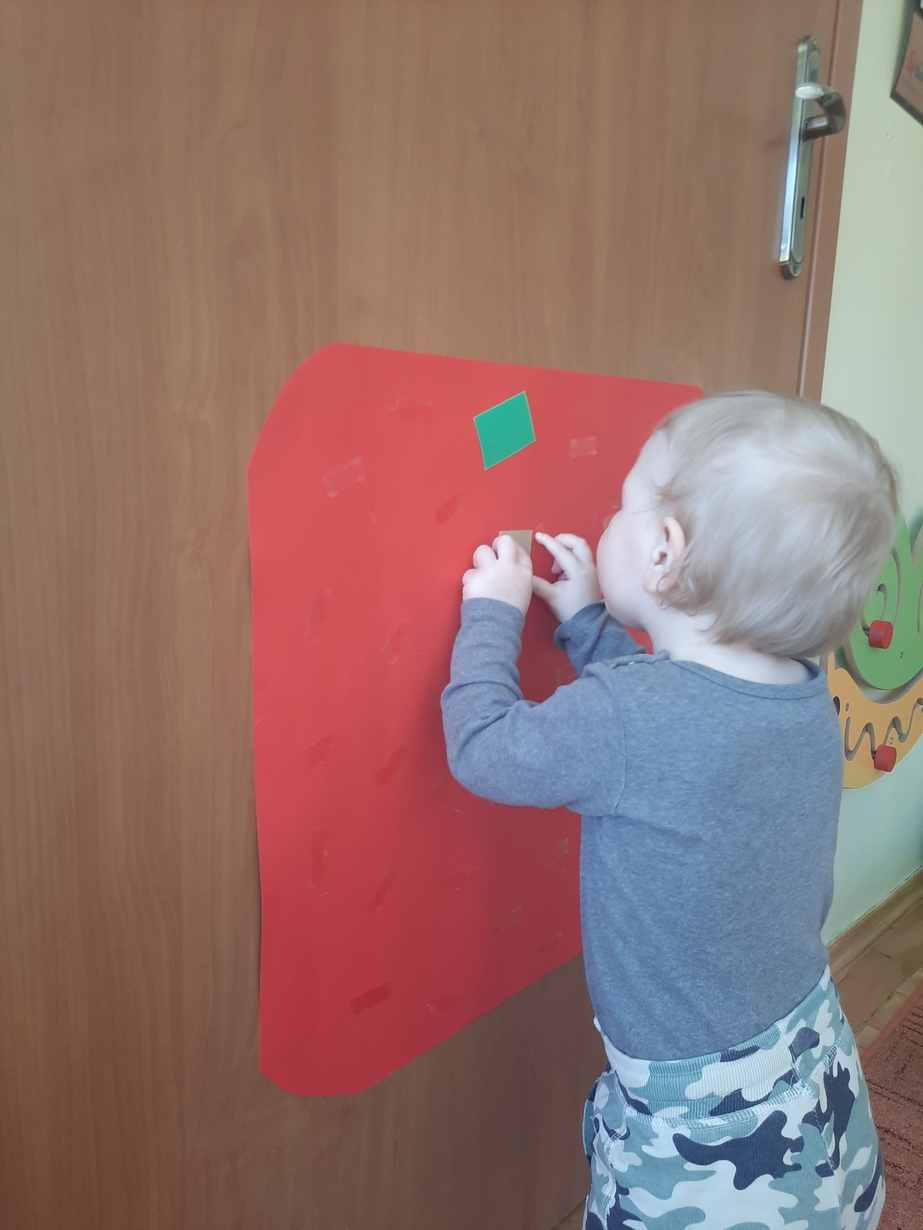 Naśladowały gesty opiekunek do wierszyka ,,Tu sroczka", liczyliśmy wspólnie paluszki, a na koniec dzieci przyklejały na tablicę różne kształty wycięte z papieru, a baloniki wypełnione kuleczkami, mąką, kaszą oraz grochem w rączkach dzieci były dobrym ćwiczeniem zmysłu dotyku. Biedroneczki spisały się na medal?