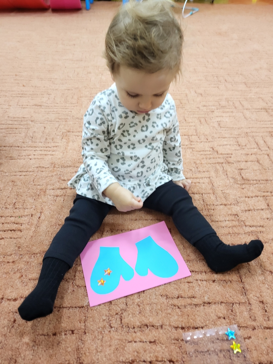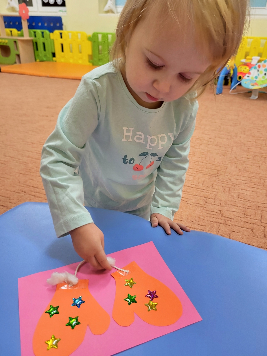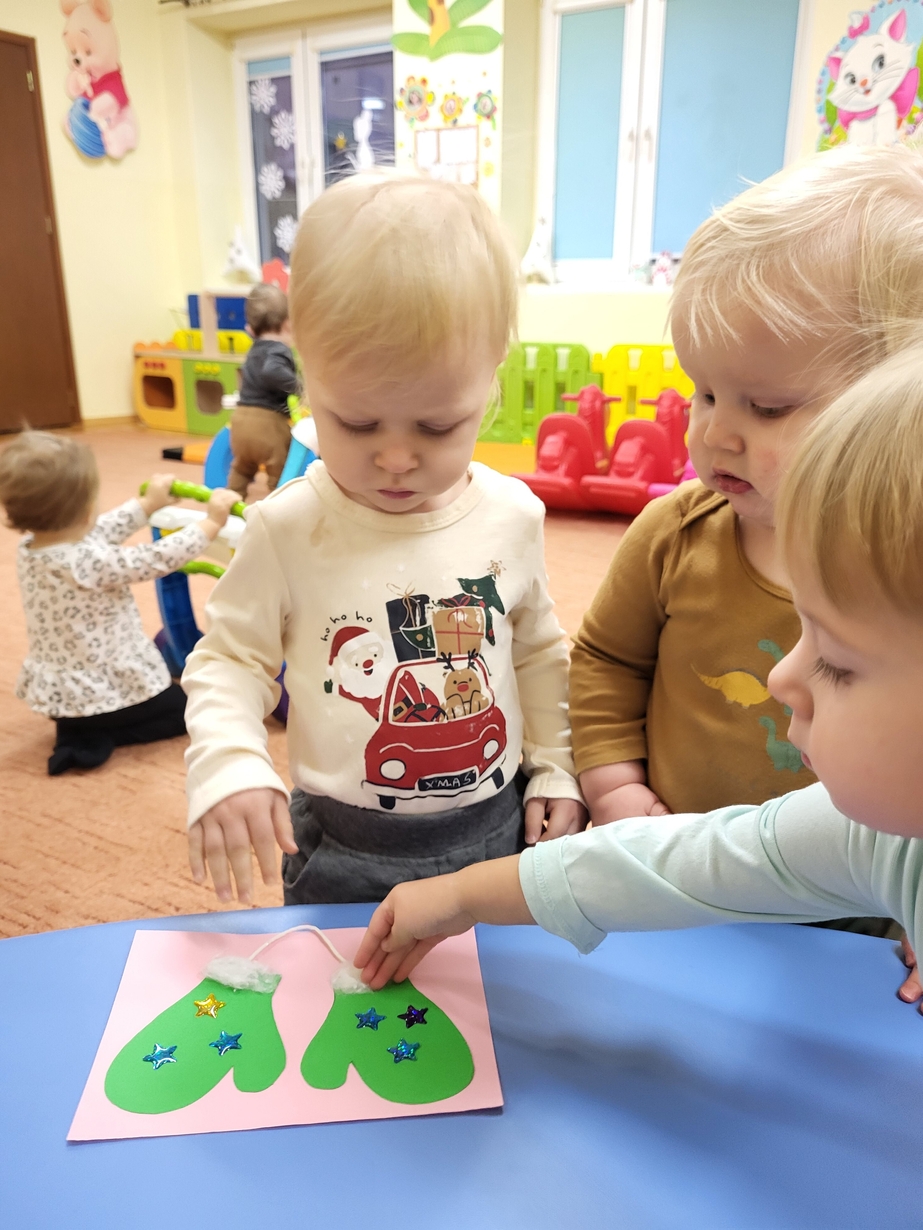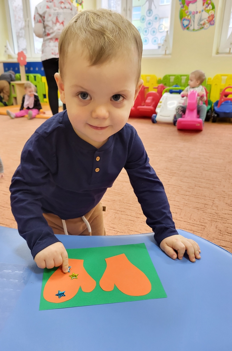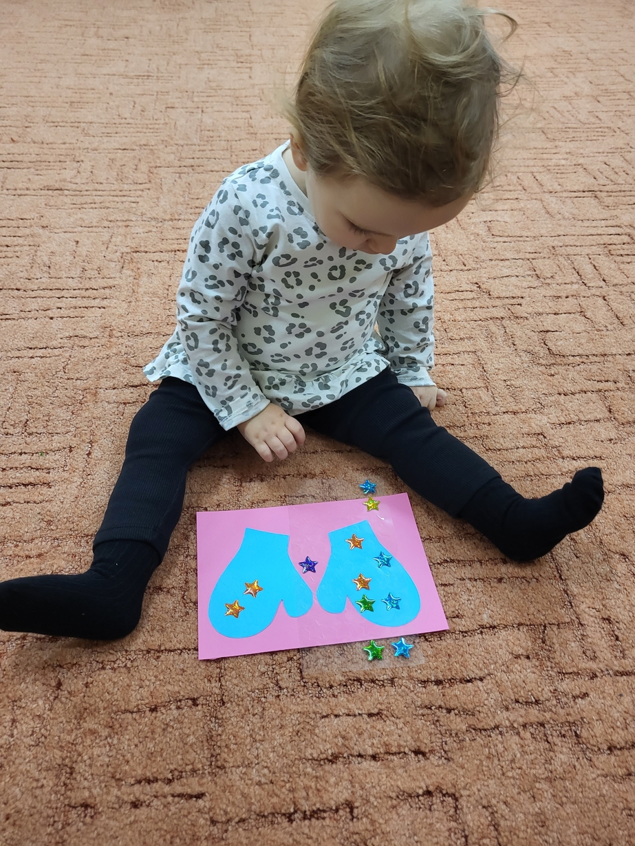 Potrzebne nam rękawiczki. Wiele radości sprawiło maluszkom przyklejanie gwiazdek jako ozdoby rękawiczek. Powstały super projekty a dzieciaczki poćwiczyły paluszki.