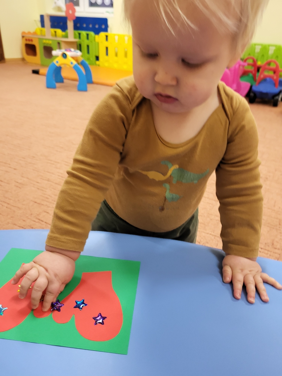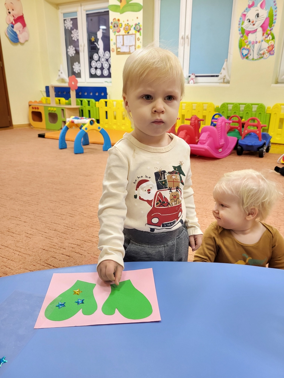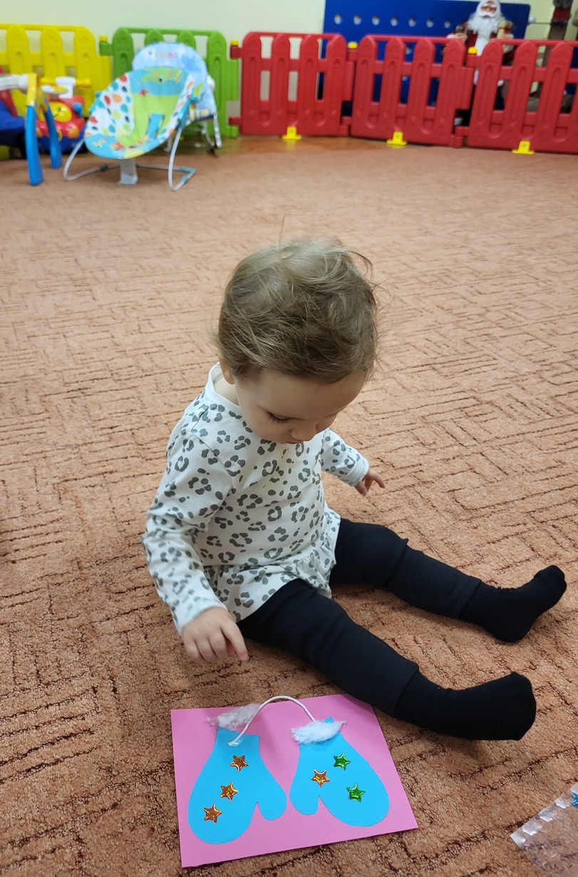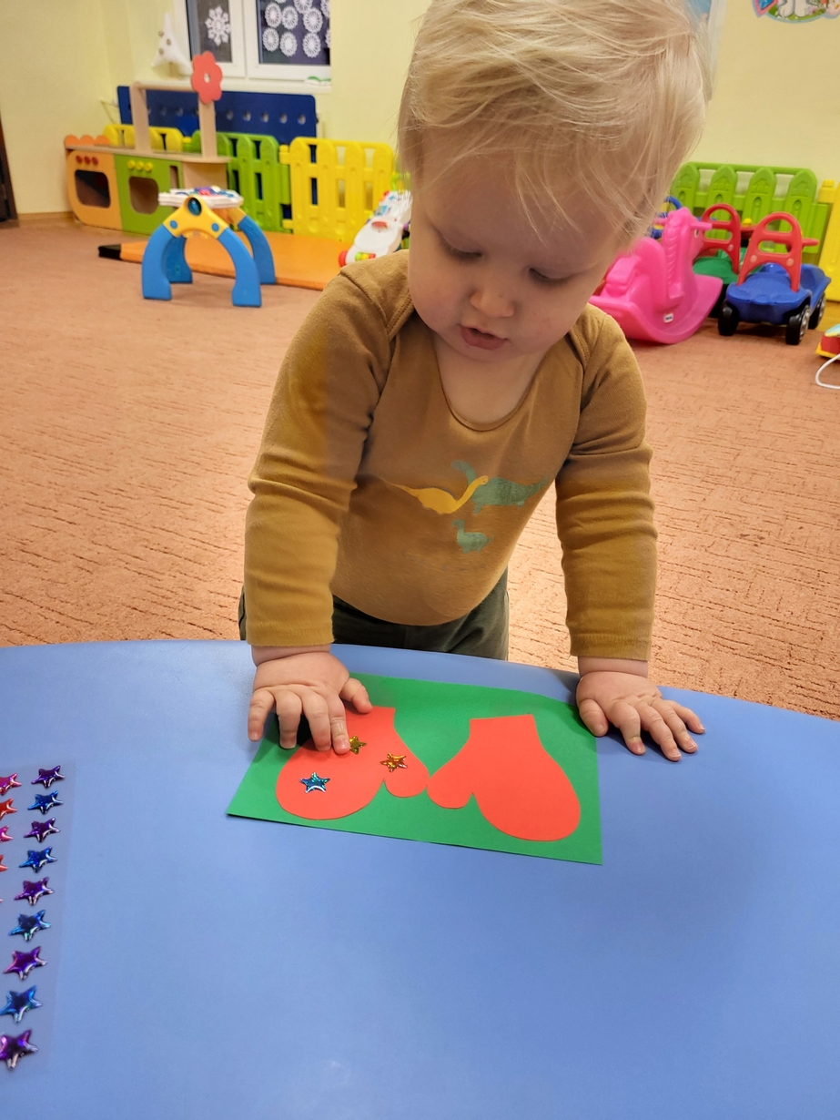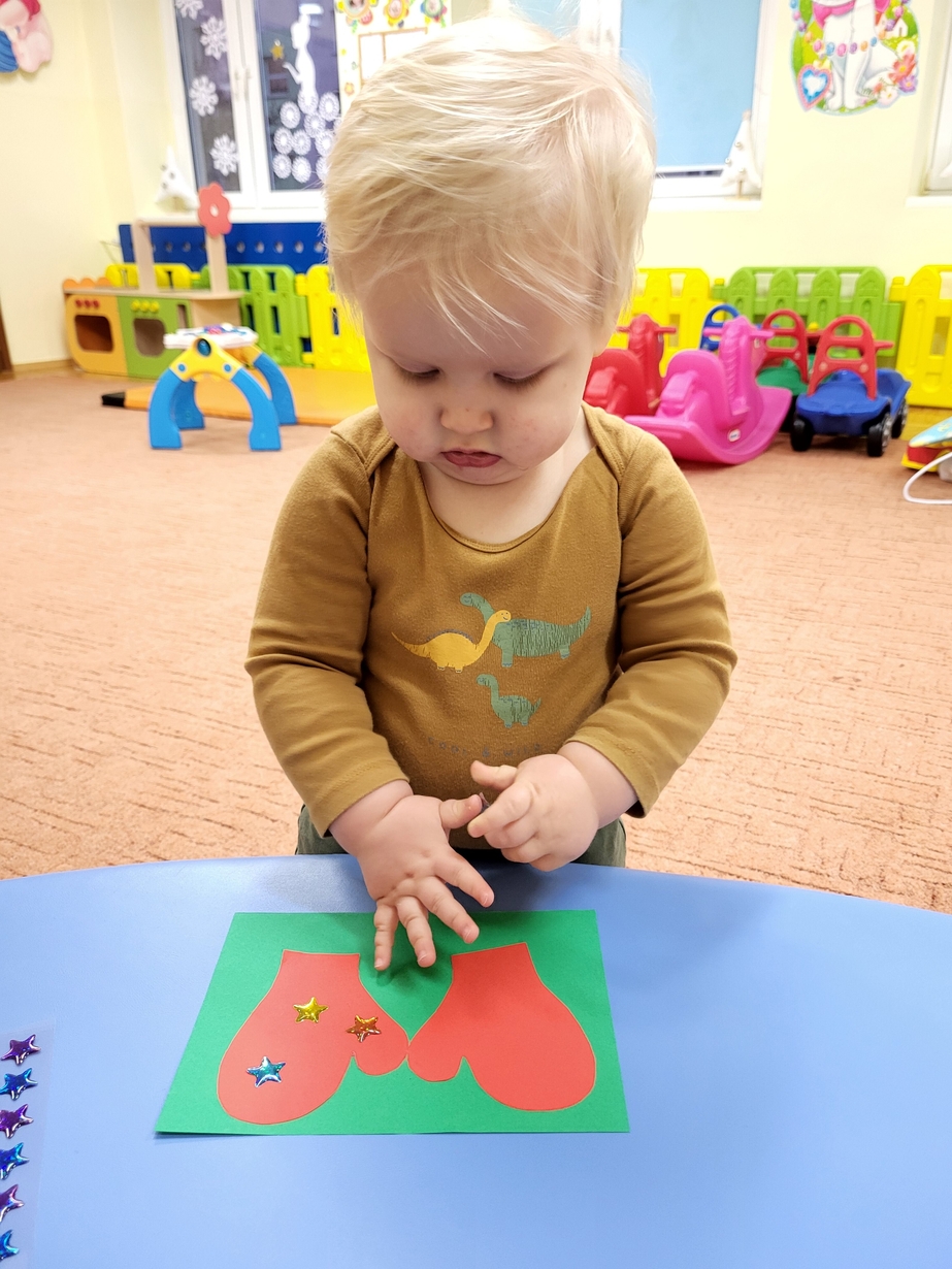 Potrzebne nam rękawiczki. Wiele radości sprawiło maluszkom przyklejanie gwiazdek jako ozdoby rękawiczek. Powstały super projekty a dzieciaczki poćwiczyły paluszki.