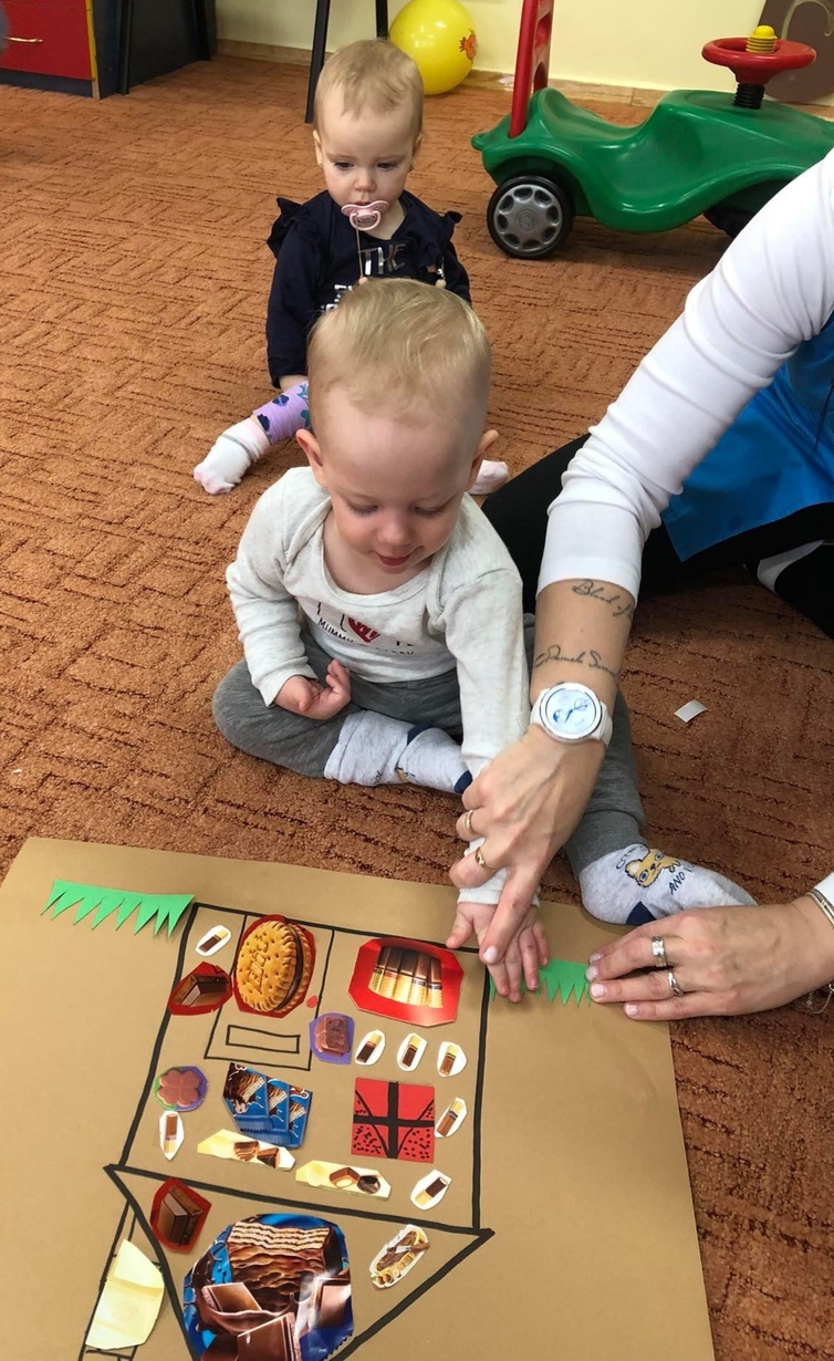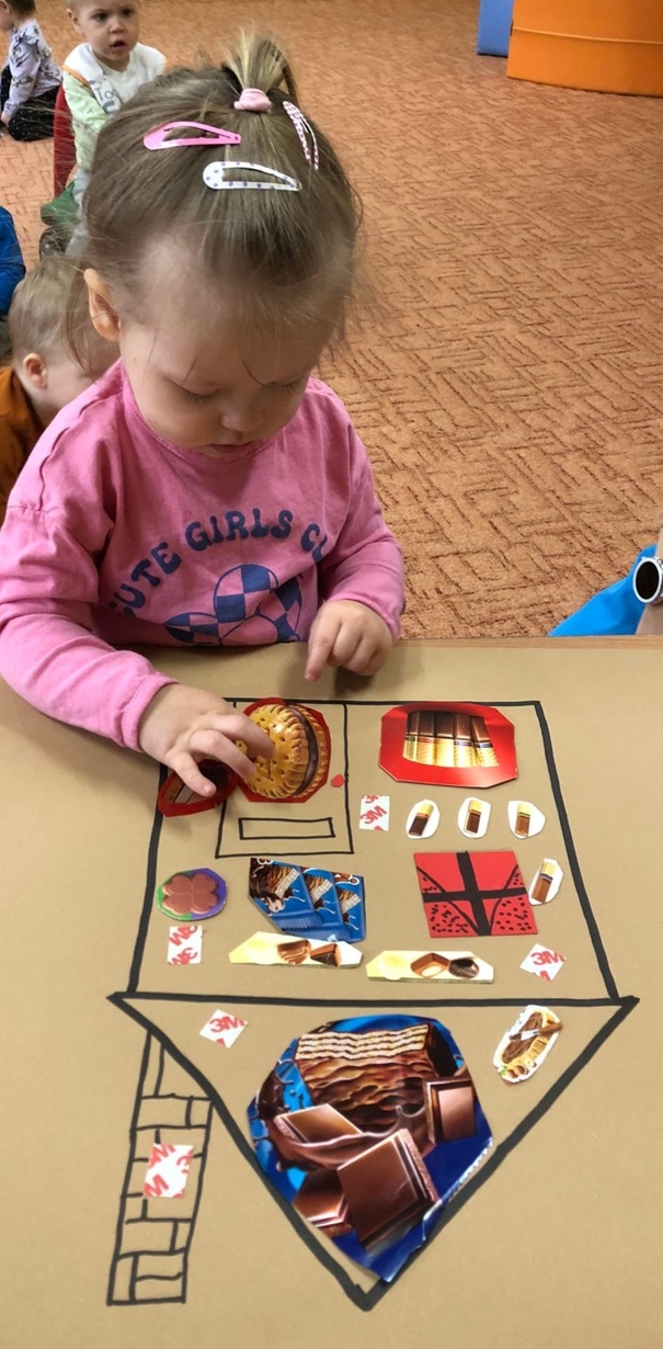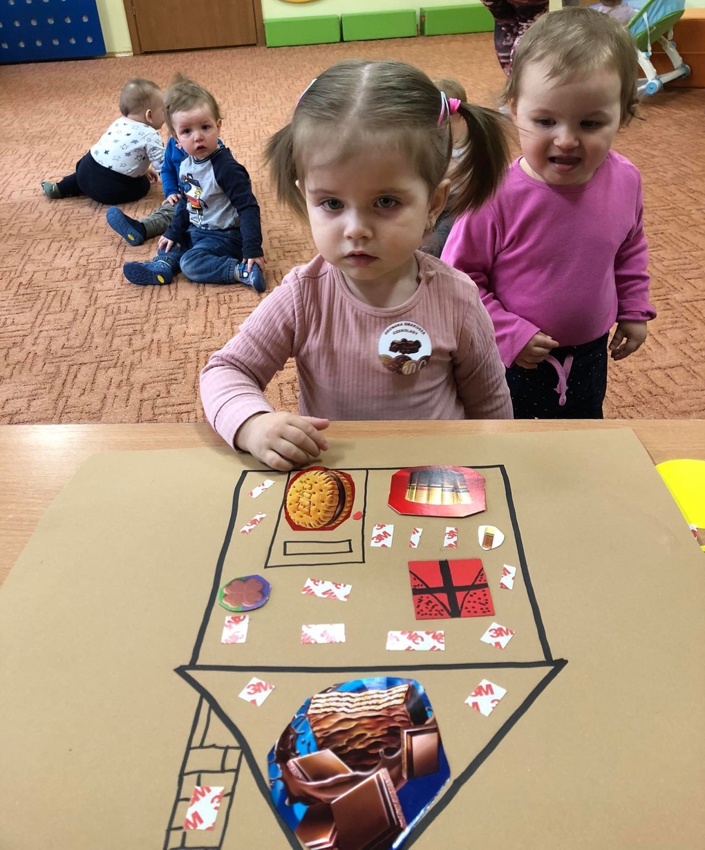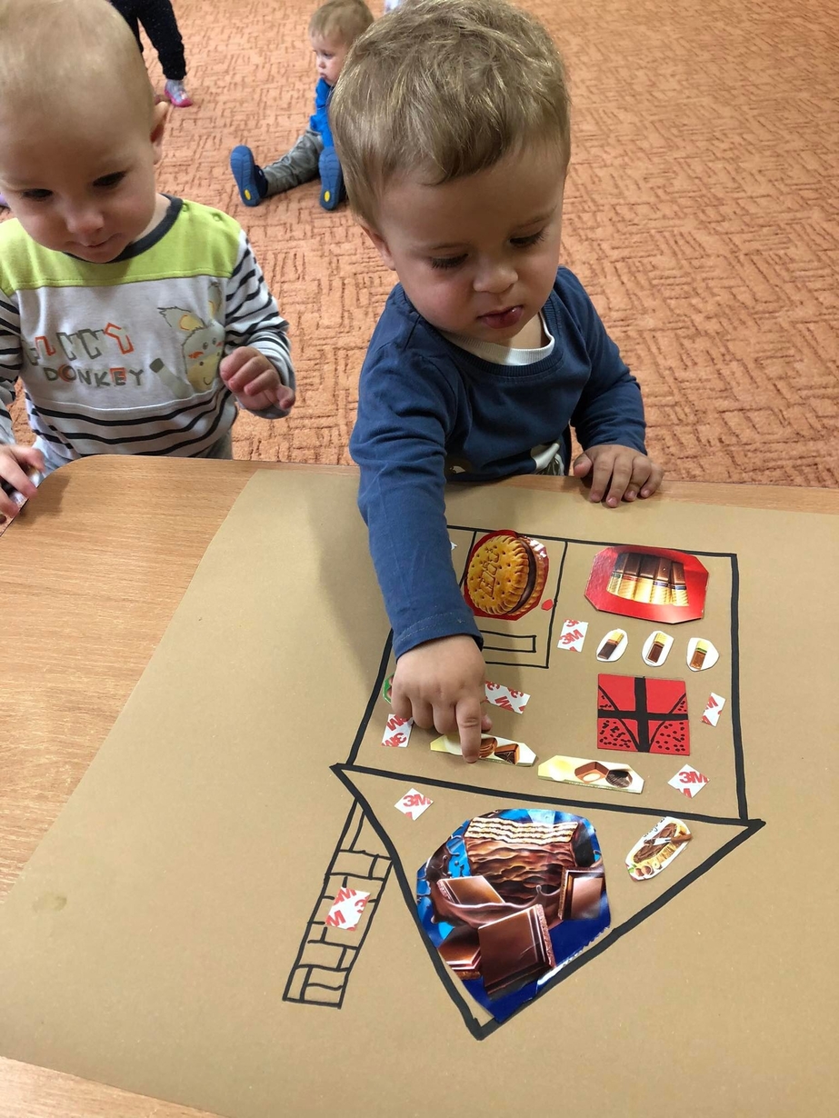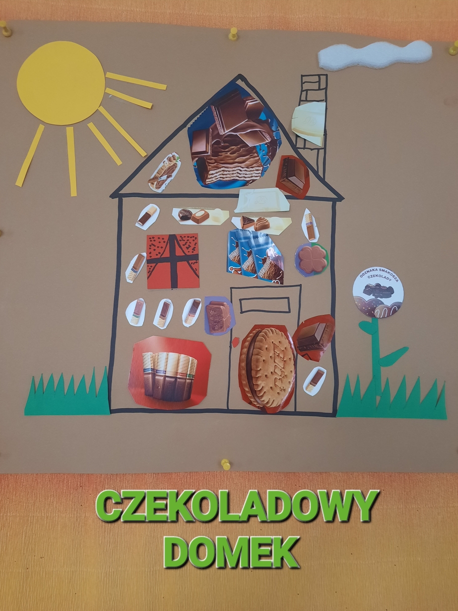 Na grupie biedronek postanowiliśmy troszkę inaczej obchodzić DZIEŃ CZEKOLADY . Dbając o ząbki naszych maluszków zamiast czekoladki zabawiliśmy się w dekorowanie domku kolorowymi papierkami po czekoladkach.