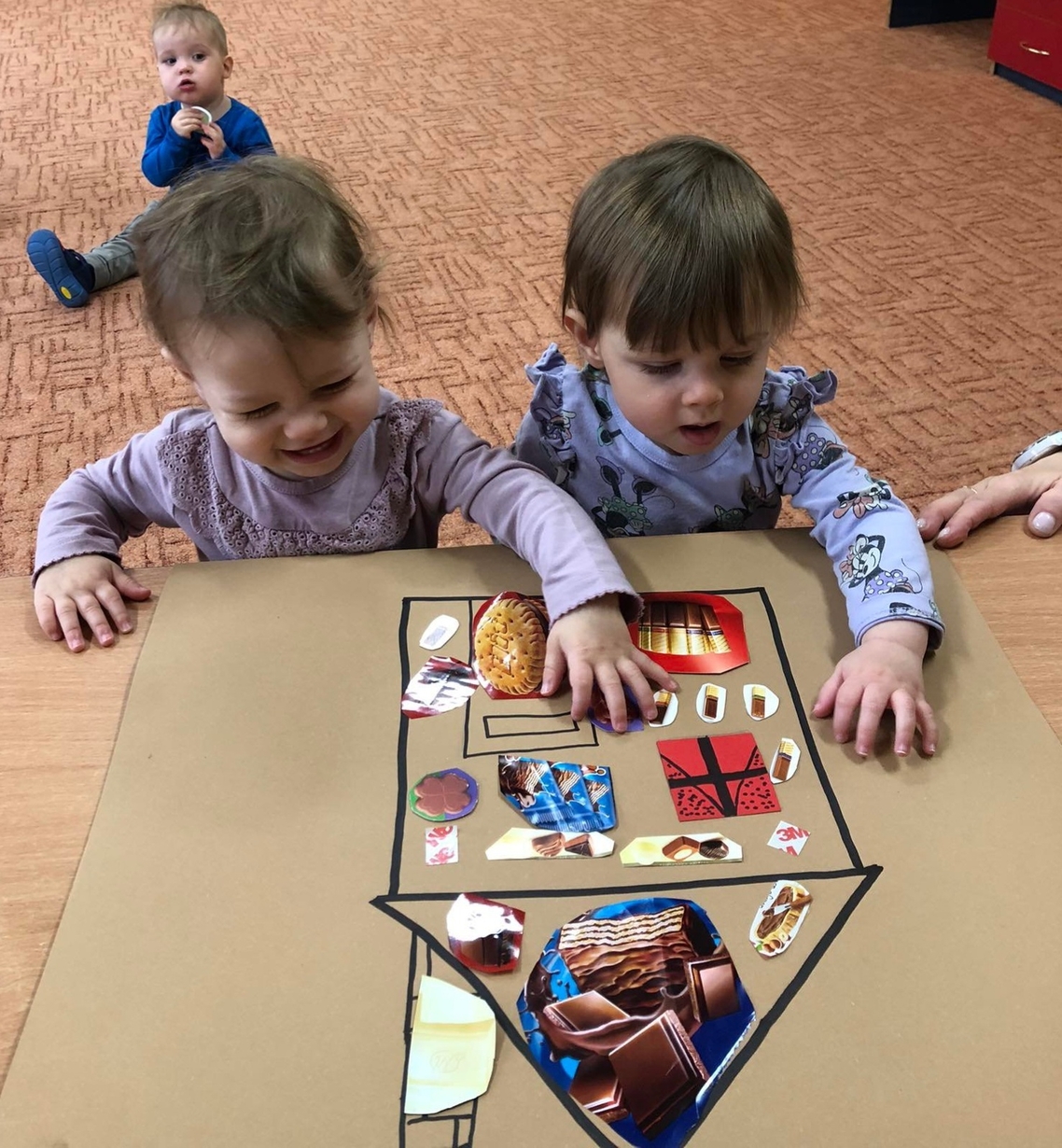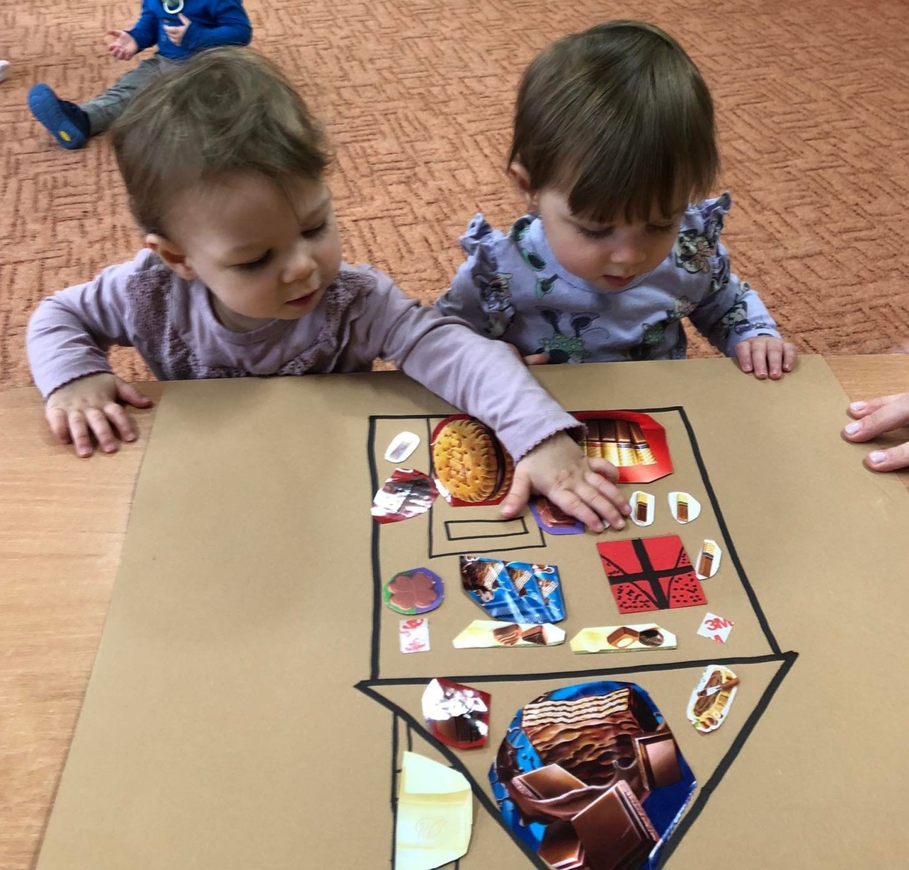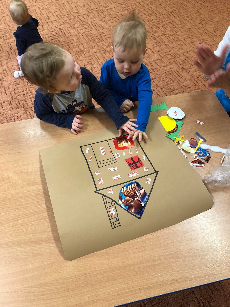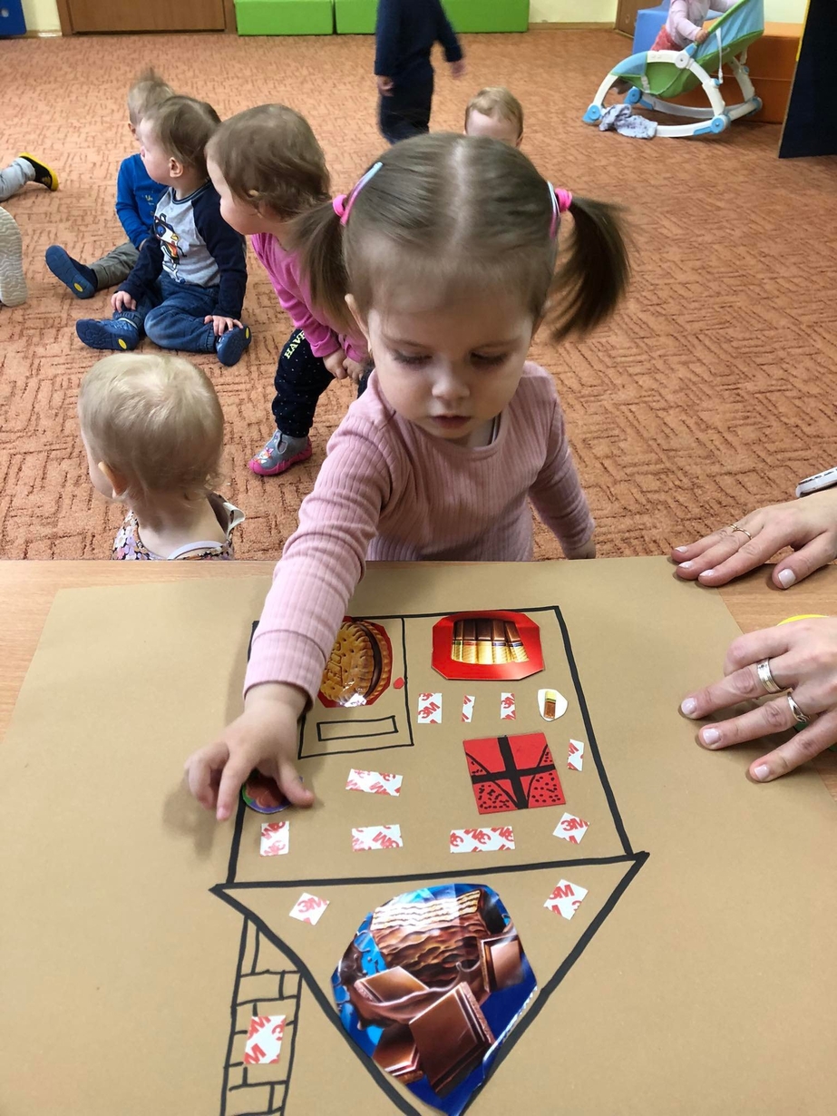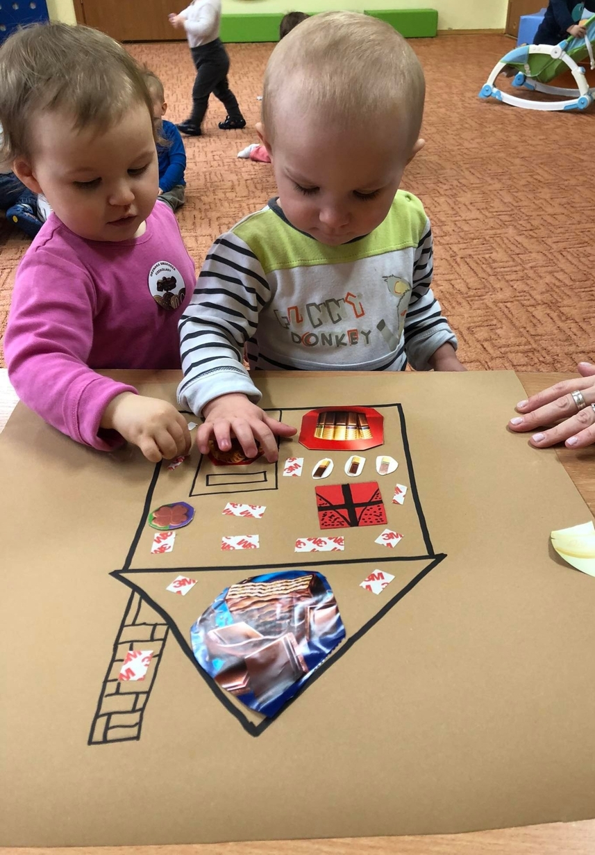 Na grupie biedronek postanowiliśmy troszkę inaczej obchodzić DZIEŃ CZEKOLADY . Dbając o ząbki naszych maluszków zamiast czekoladki zabawiliśmy się w dekorowanie domku kolorowymi papierkami po czekoladkach.