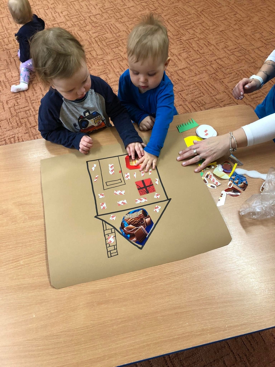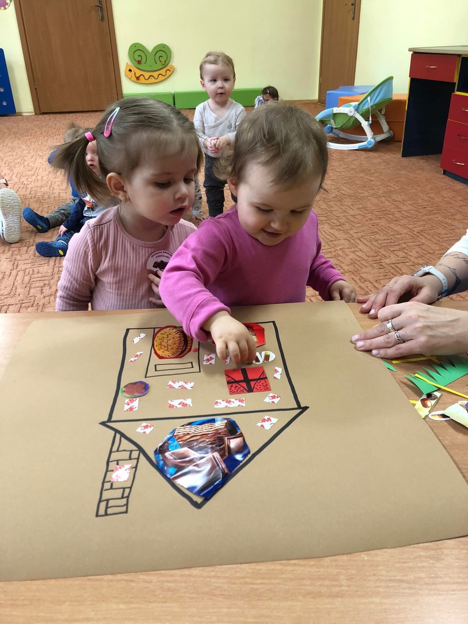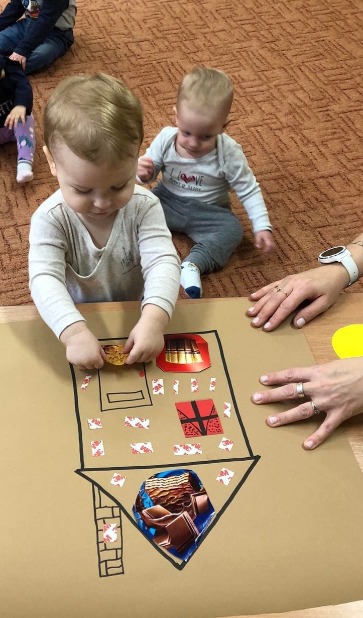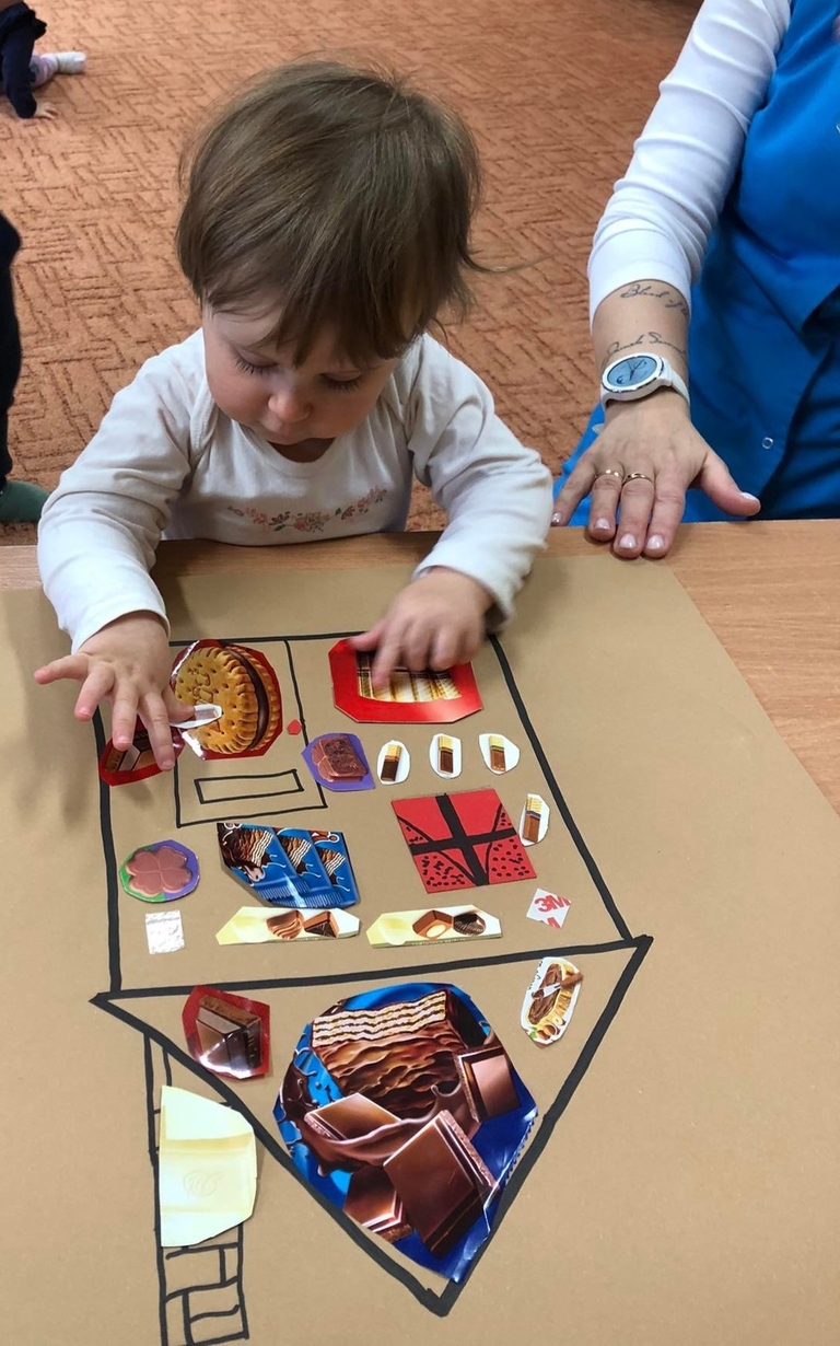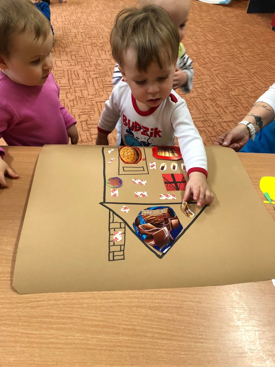 Na grupie biedronek postanowiliśmy troszkę inaczej obchodzić DZIEŃ CZEKOLADY . Dbając o ząbki naszych maluszków zamiast czekoladki zabawiliśmy się w dekorowanie domku kolorowymi papierkami po czekoladkach.