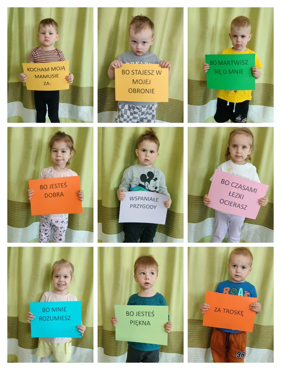 Zdjęcia przedstawiają dzieci obchodzące Dzień Mamy