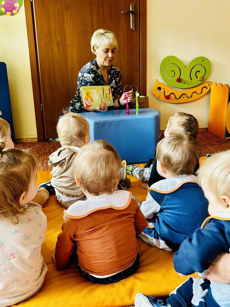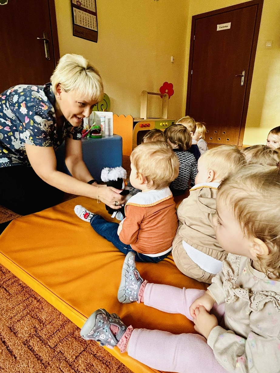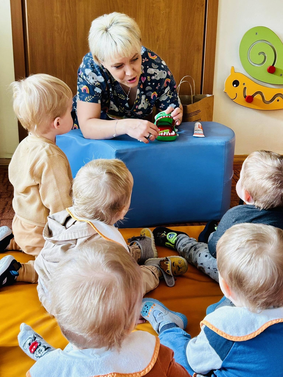 Dzisiaj nasze biedronki miały okazję zobaczyć i posłuchać o tym jak można dbac o swoje ząbki ...maluszki z zaciekawieniem słuchały pani opiekunki która opowiadała z pomocą krokodylka jak dbać i prawidłowo szczotować swoje ząbki.