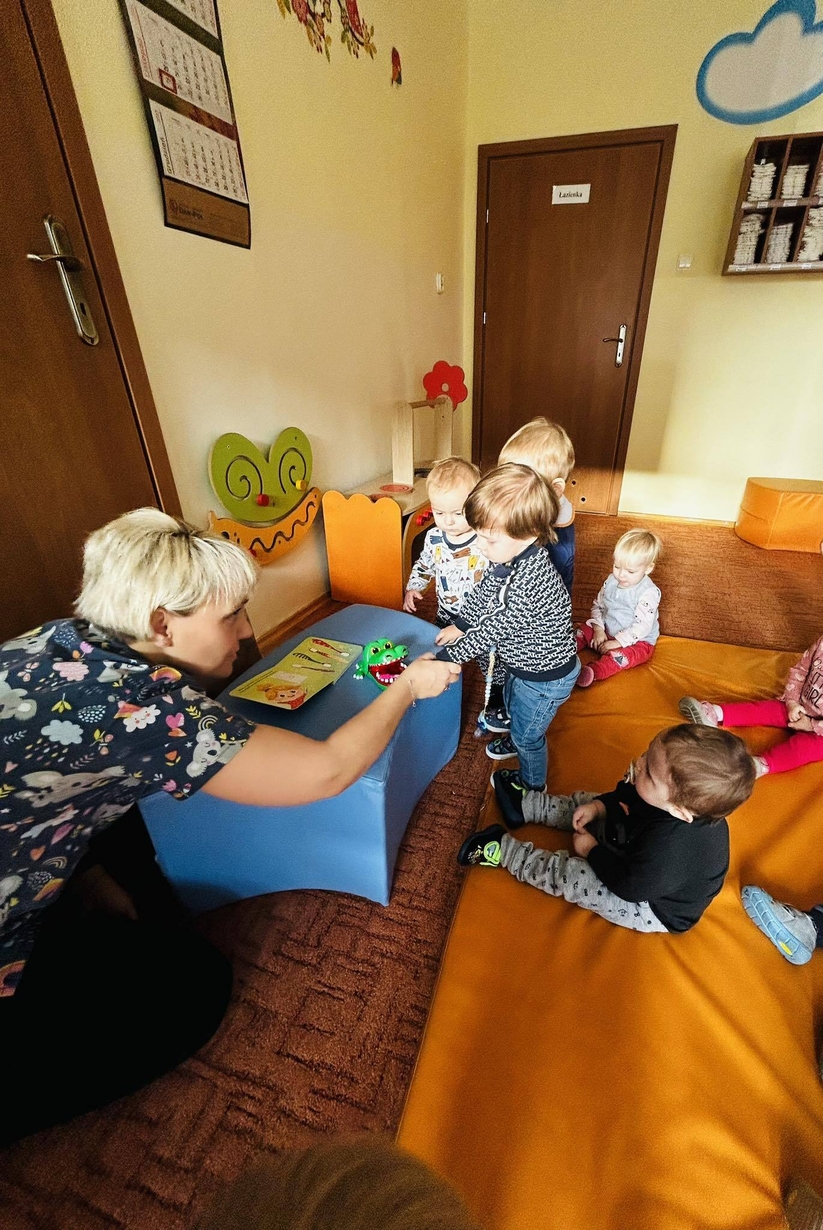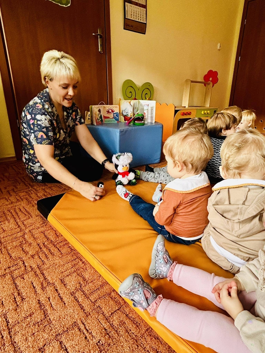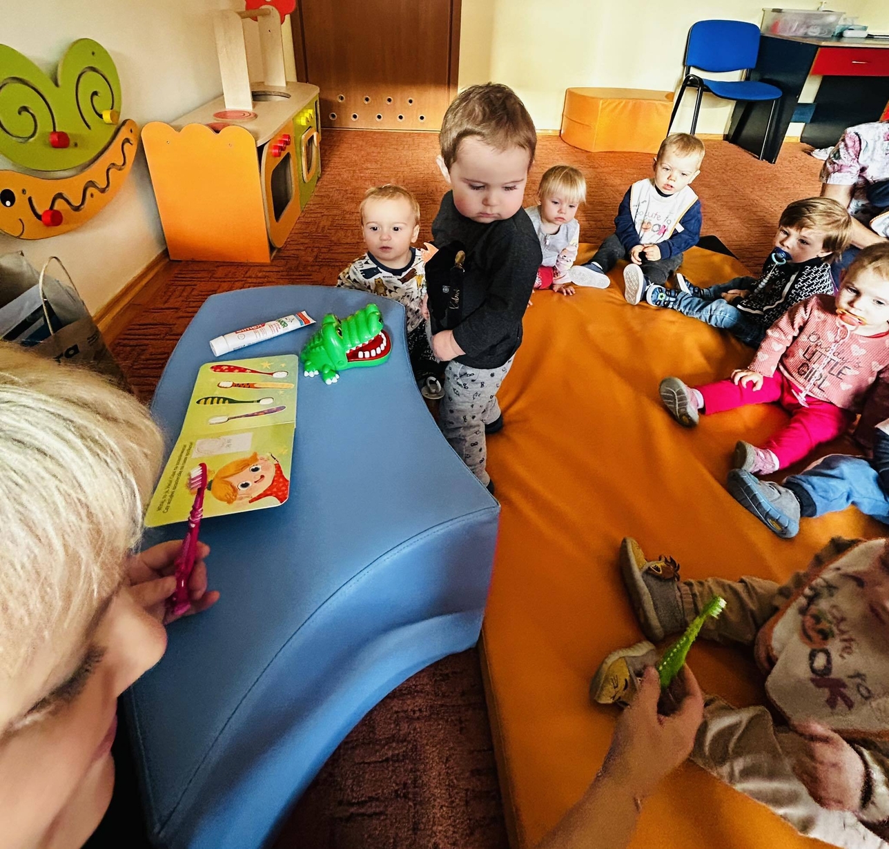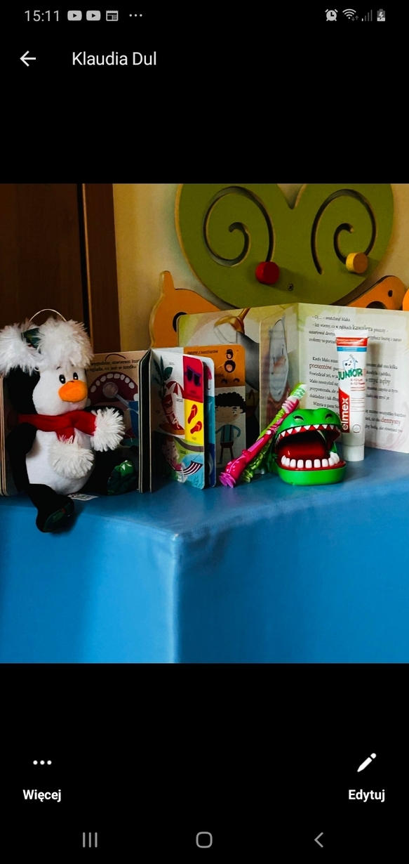 Dzisiaj nasze biedronki miały okazję zobaczyć i posłuchać o tym jak można dbac o swoje ząbki ...maluszki z zaciekawieniem słuchały pani opiekunki która opowiadała z pomocą krokodylka jak dbać i prawidłowo szczotować swoje ząbki.