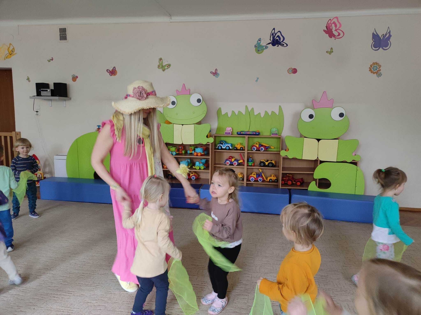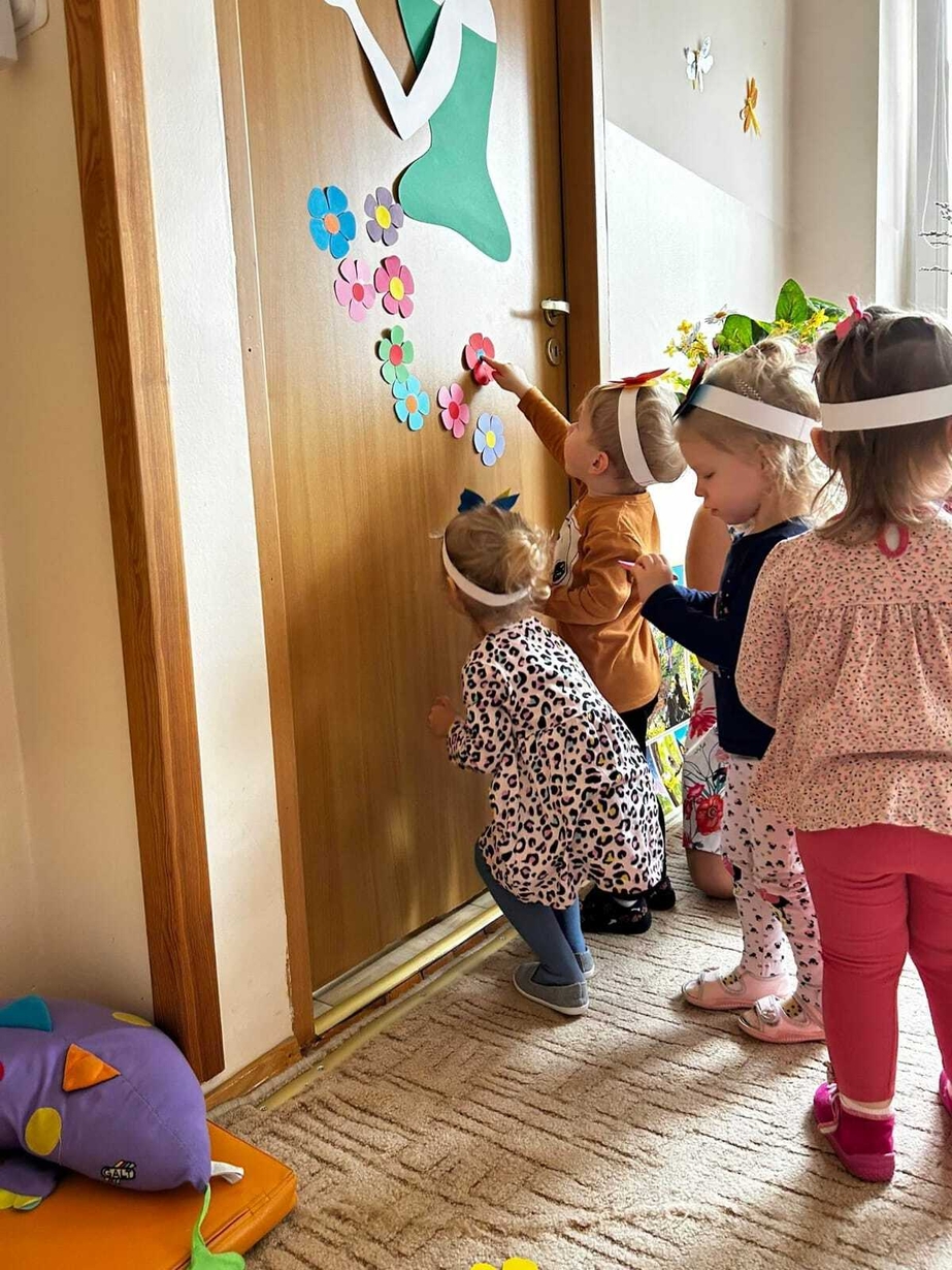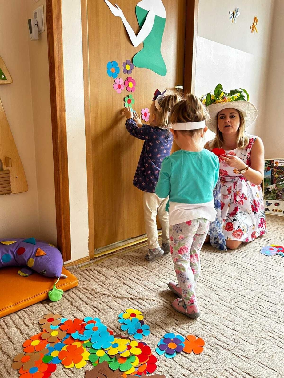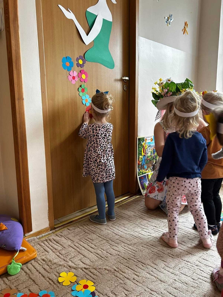Następnie dzieci przyozdobiły suknię Pani Wiosny kolorowymi kwiatuszkami.