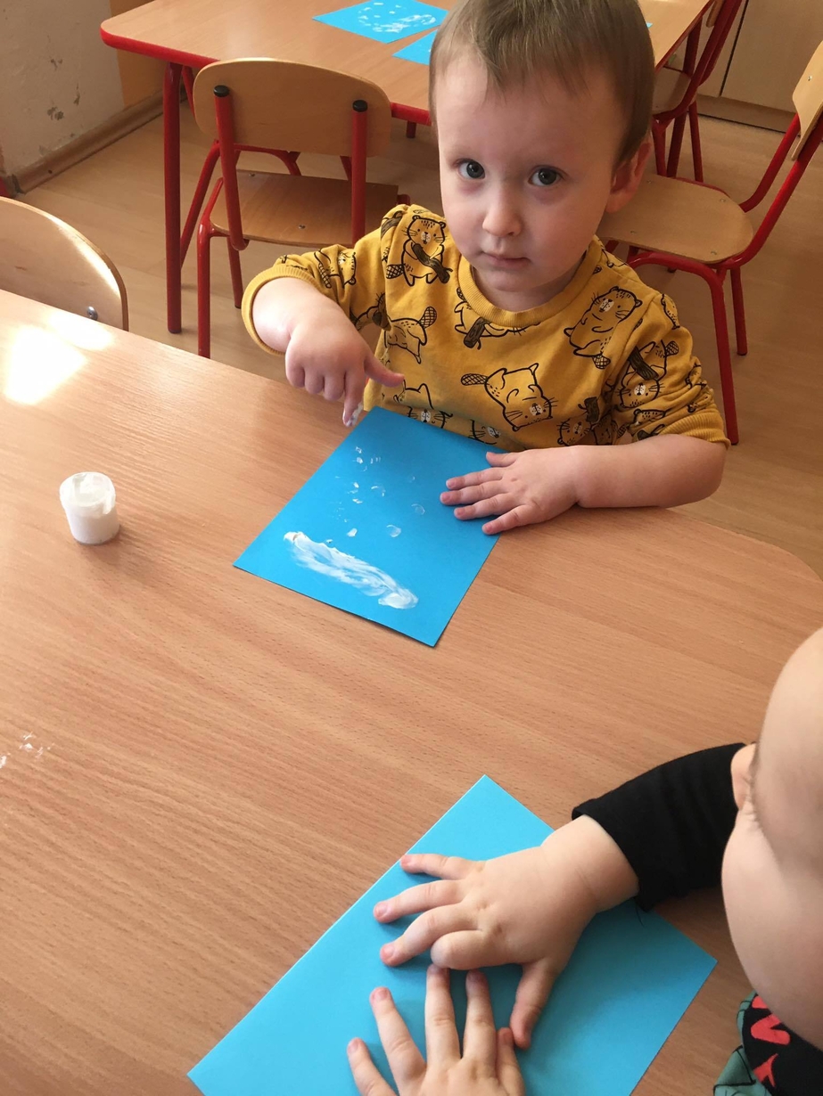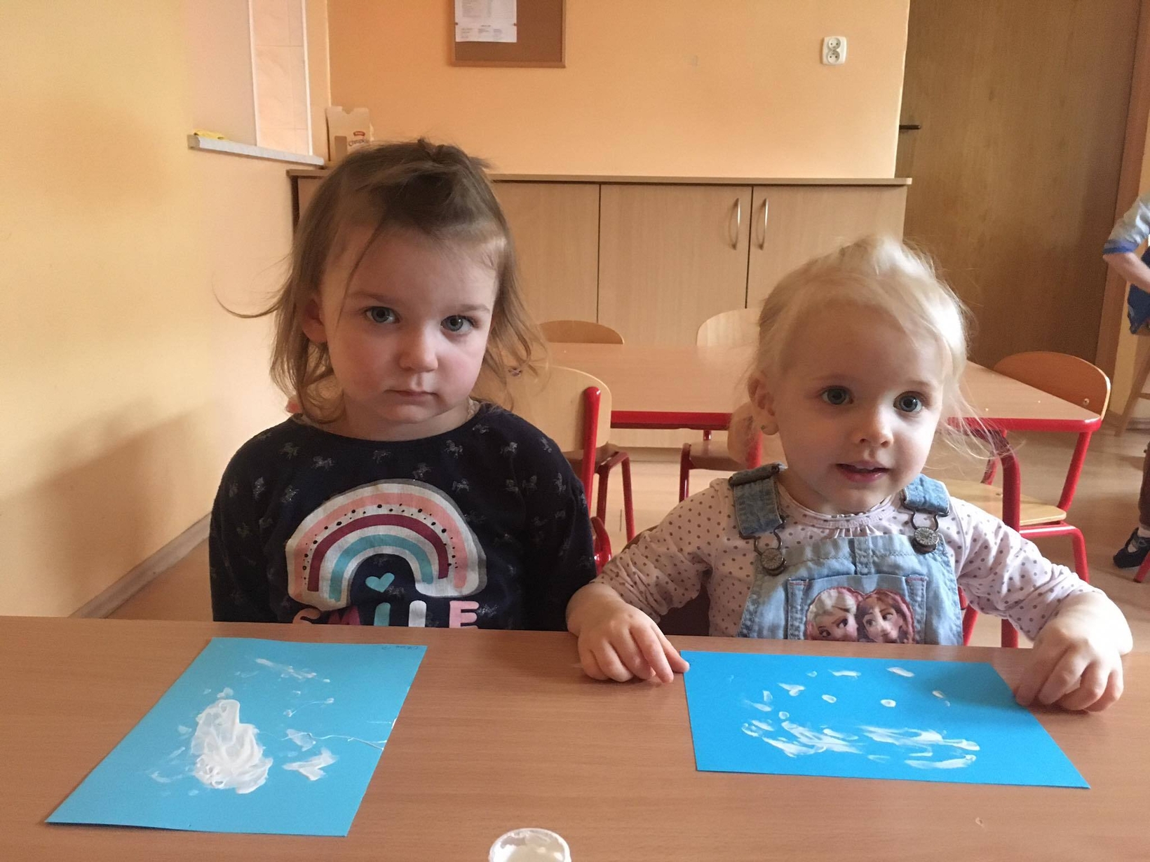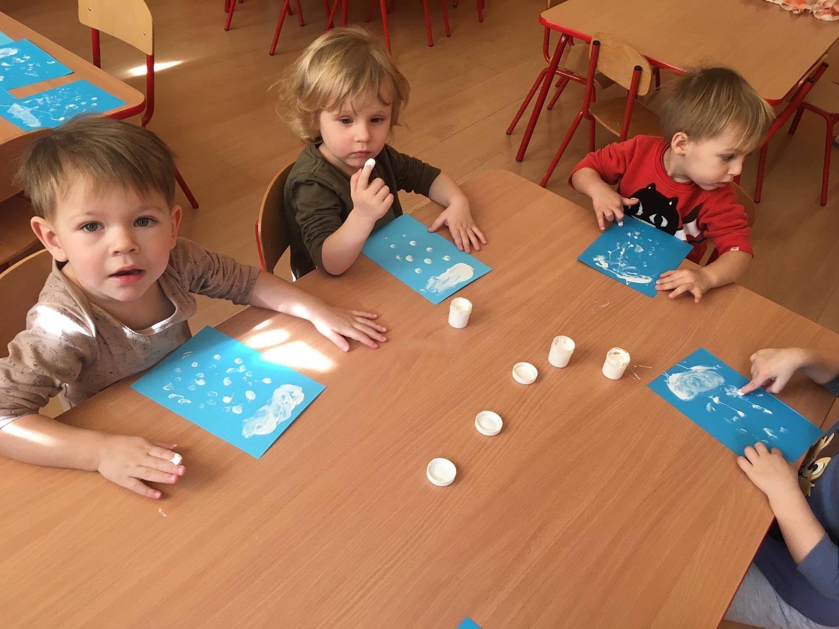 Dzieci z grupy 3 Misie ” dowiedziały się podczas wspólnych zabaw, że w zimową pogodę łatwo o przeziębienie. Pomogły misiowi ubrać się właściwie przed wyjściem na dwór. Naśladowały własnym ruchem wiejący wiatr. Na koniec wykonały pracę plastyczną - chmurkę oraz spadający śnieg. Dzieci przy pomocy palców malowały farbami, ćwicząc przy okazji sprawność manualną. Nie tylko wiele się nauczyły, ale była to dla nich także okazja do świetnej zabawy.