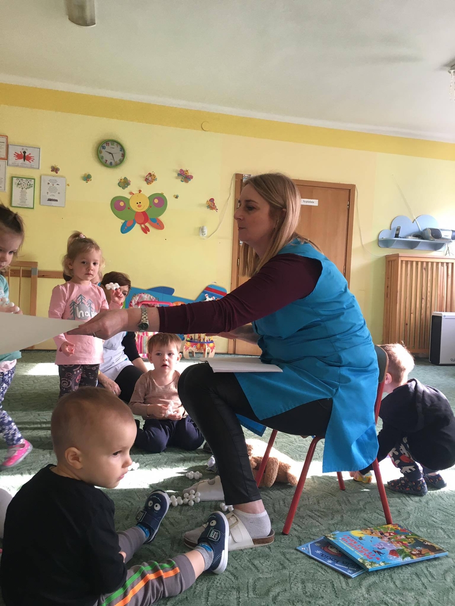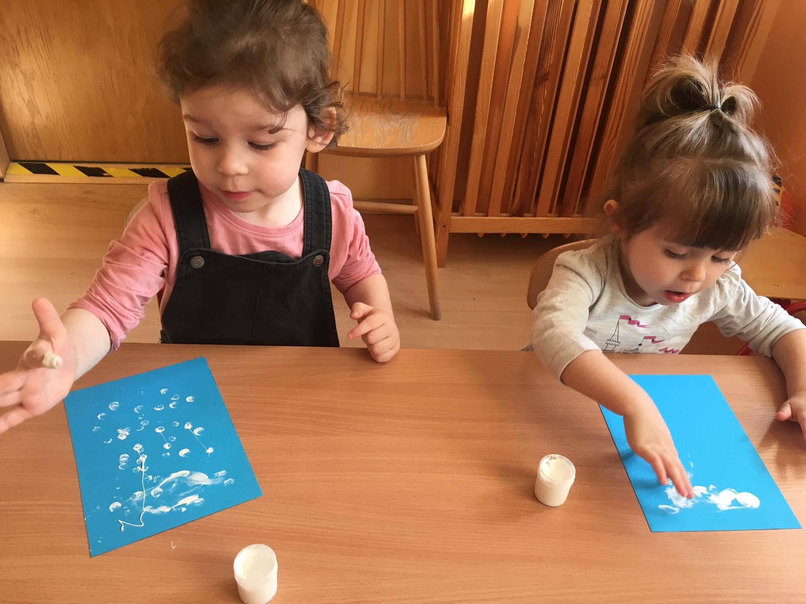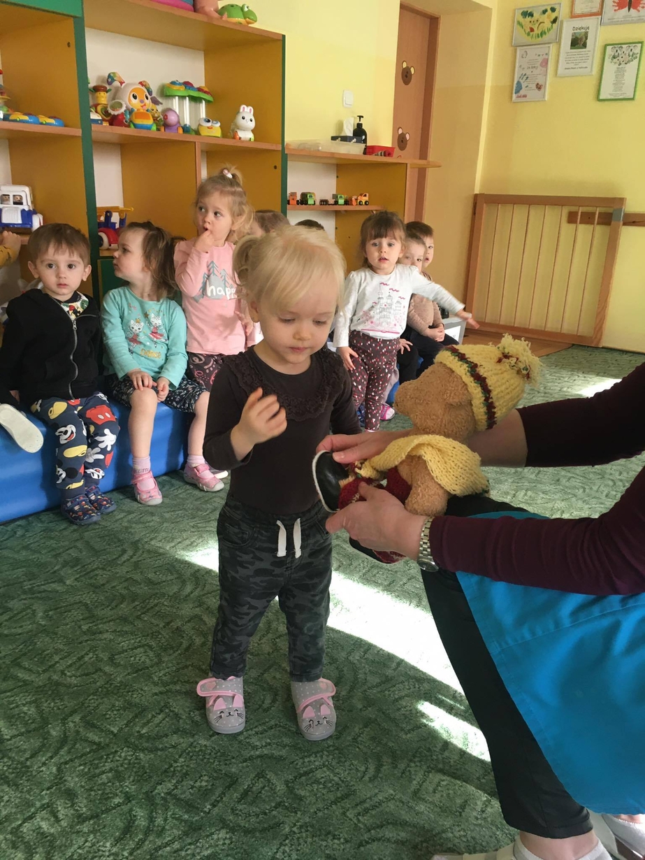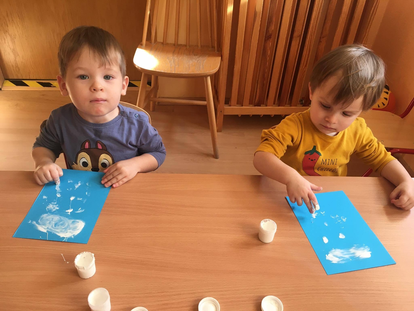 Dzieci z grupy 3 Misie ” dowiedziały się podczas wspólnych zabaw, że w zimową pogodę łatwo o przeziębienie. Pomogły misiowi ubrać się właściwie przed wyjściem na dwór. Naśladowały własnym ruchem wiejący wiatr. Na koniec wykonały pracę plastyczną - chmurkę oraz spadający śnieg. Dzieci przy pomocy palców malowały farbami, ćwicząc przy okazji sprawność manualną. Nie tylko wiele się nauczyły, ale była to dla nich także okazja do świetnej zabawy.