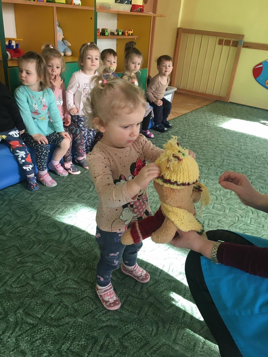 Rozmowa z dziećmi o konieczności dostosowania ubrania do zimowej pogody - zakładania czapki, rękawic oraz szalików.