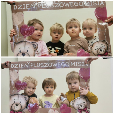 Dzisiaj naszym Jubilatem był pluszowy miś, ponieważ to właśnie dzisiaj, tj. 25 listopada obchodzony jest "Dzień Pluszowego Misia". Z tej okazji zaśpiewaliśmy misiowi gromkie “100 lat". Dzieci obdarowały pluszowego misia uściskami, wspolnie z misiem uczyły się liczyć do 10 oraz wysłuchały wierszyka, którego bohaterem był właśnie on. Wykonaliśmy pamiątkowe zdjecia w fotoramce a każde dziecko otrzymalo do domu dyplom "Przyjaciela Pluszowego Misia". Zwieńczeniem tego dnia było wykonanie prac plastycznych-kolorowanie kredkami woskowymi sylwetki misia. Teraz na żłobkowym korytarzu misiowe buźki miło witają dzieci przesyłając im uśmiechy. Zapraszamy do galerii zdjęć :)