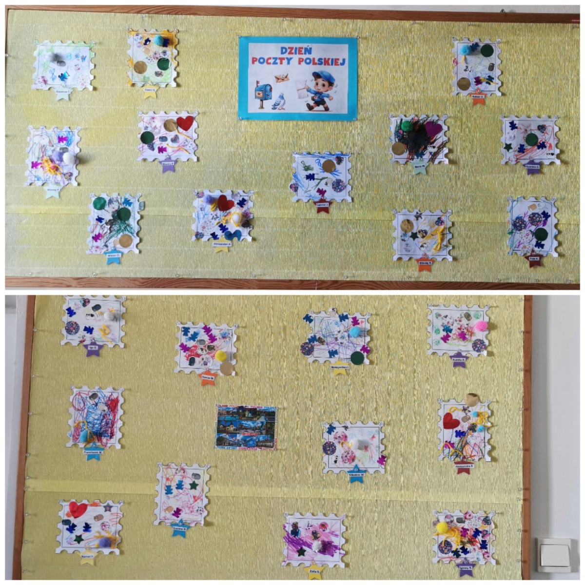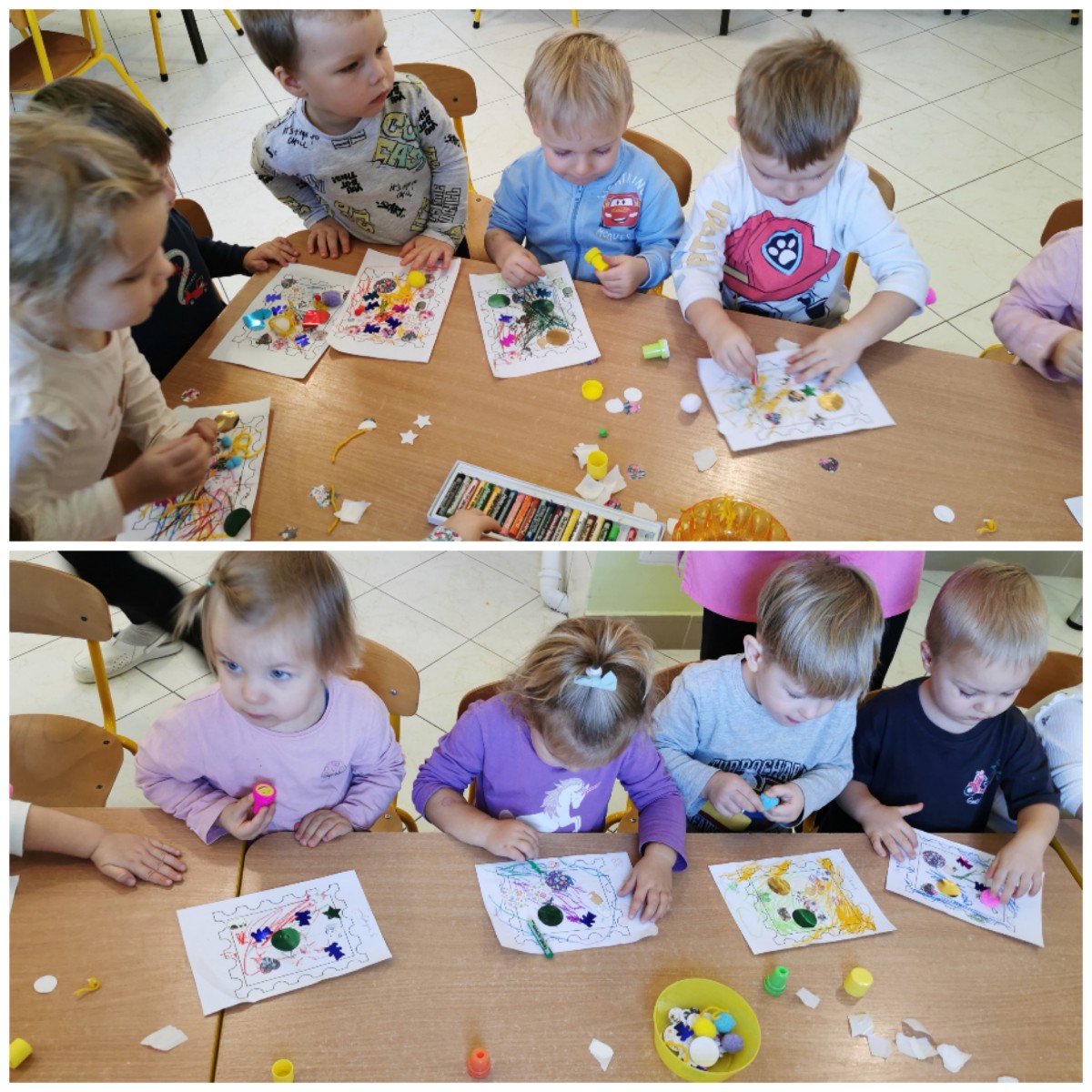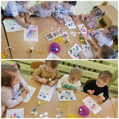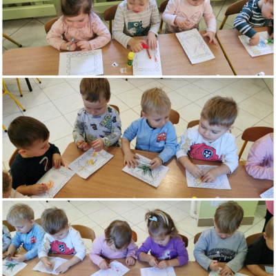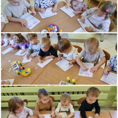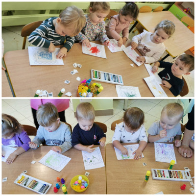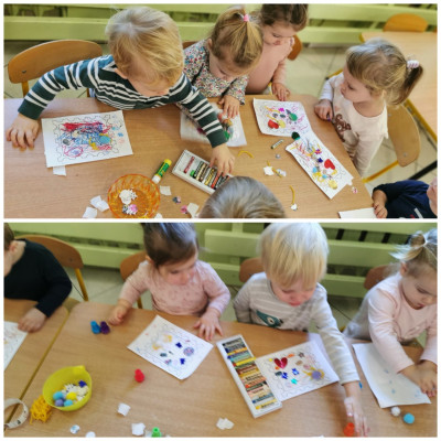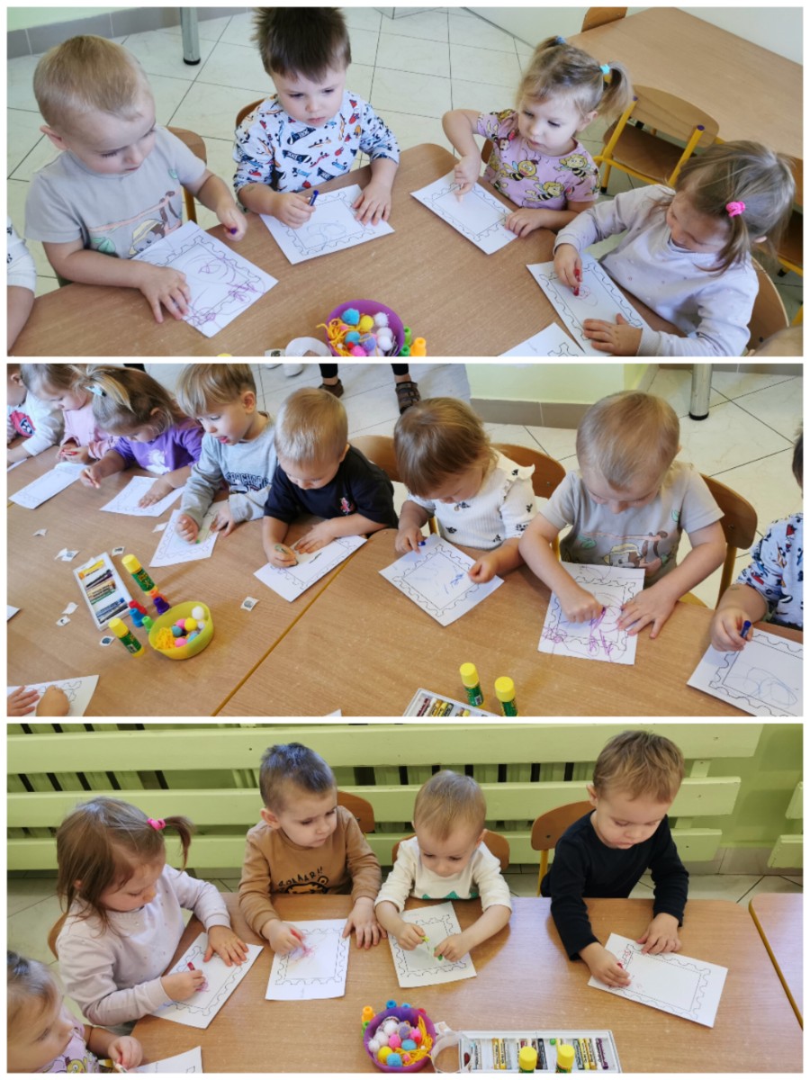 naklejkami, pieczątkami a także kolorowało pastelami. Gotowe prace możemy obejrzeć na tablicy.