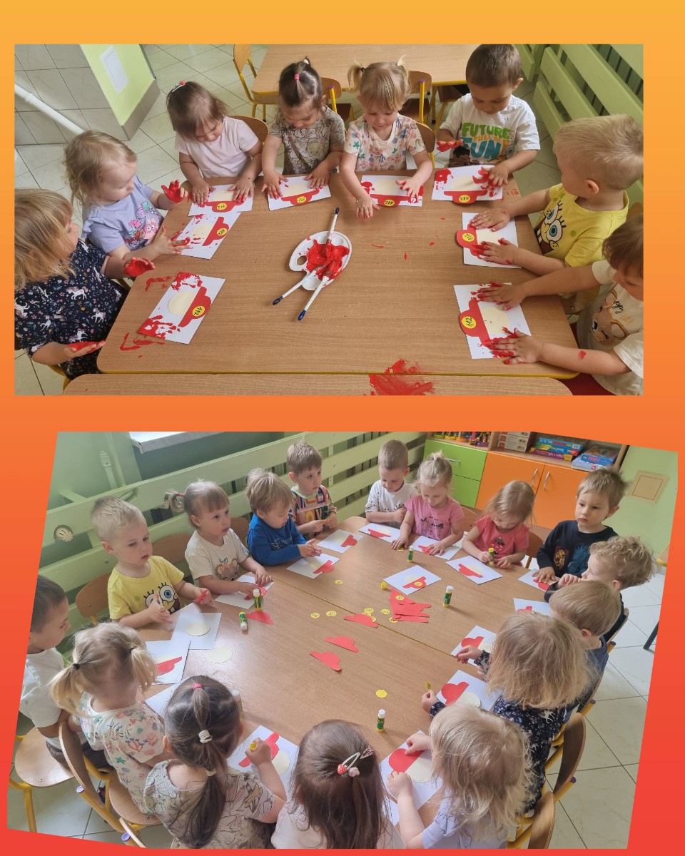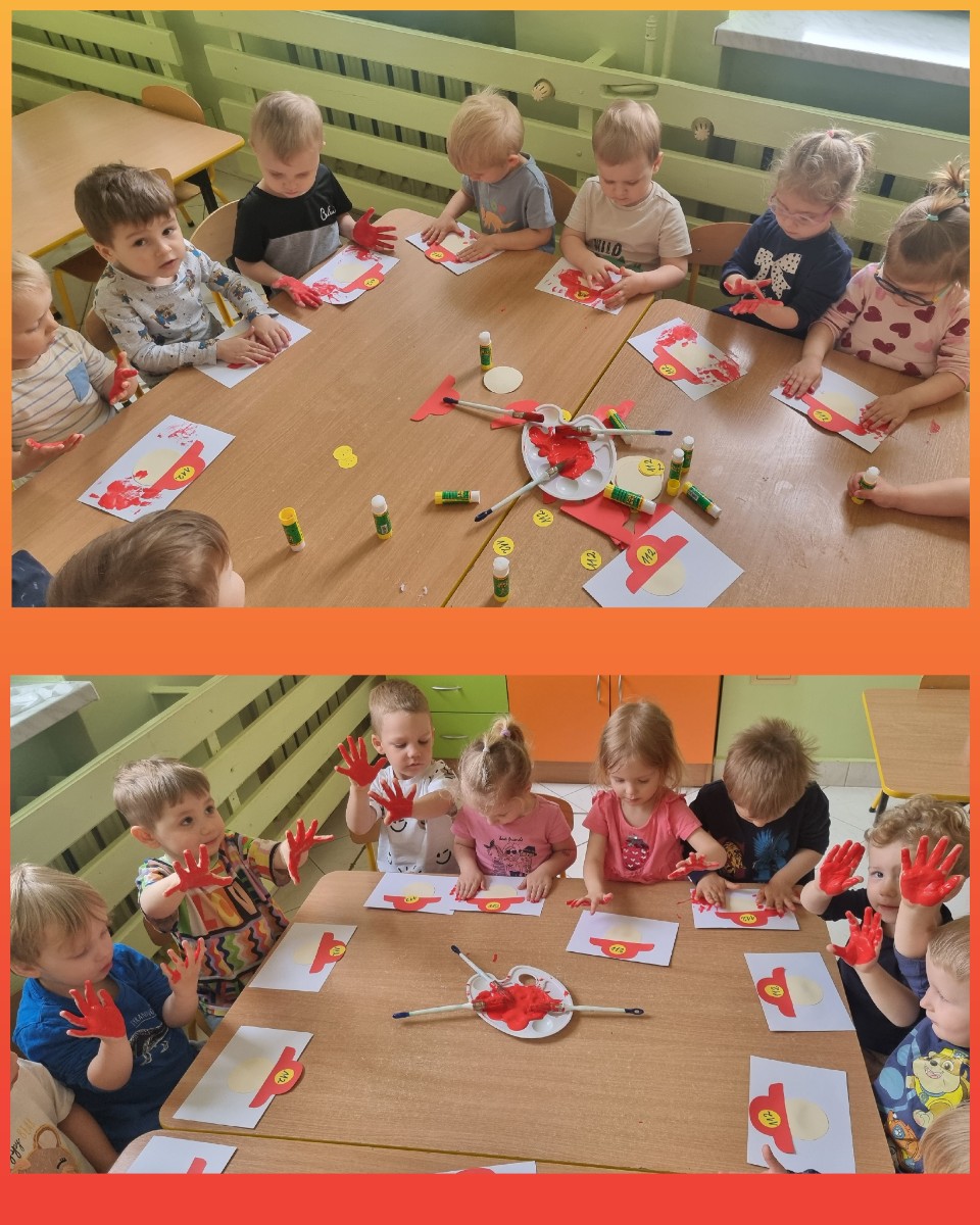 Uhonorowaniem dzisiejszego dnia dzieci wykonały swojego strażaka przyklejając głowę, kask następnie odbijaliśmy swoję rączki .